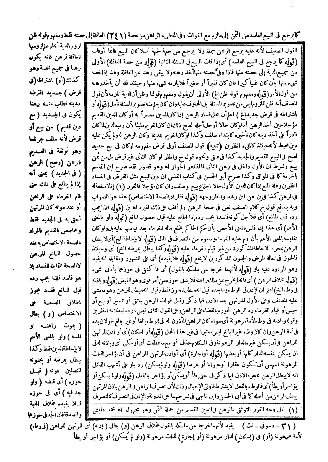 ـــــــــــــــــــــــــــــQالْقَوْلِ الضَّعِيفِ؛ لِأَنَّهُ عَلَيْهِ يَرْجِعُ الرَّهْنُ جُمْلَةً وَلَا يَرْجِعُ مِنْ جِهَةٍ لِجِهَةٍ أَصْلًا كَانَ الْمَبِيعُ قَائِمًا أَوْ فَاتَ (قَوْلُهُ كَمَا يَرْجِعُ فِي الْبَيْعِ الْفَاسِدِ) أَيْ إذَا فَاتَ الْمَبِيعُ فِي الْمَسْأَلَةِ الثَّانِيَةِ (قَوْلُهُ مِنْ حِصَّةِ الْعَاقِلَةِ) الْأَوْلَى مِنْ جَمِيعِ الدِّيَةِ إلَى حِصَّتِهِ مِنْهَا فَإِذَا وَفَّى حِصَّتَهُ مِنْهَا أَخَذَ رَهْنَهُ وَلَا يَبْقَى رَهْنًا عَنْ الْعَاقِلَةِ وَهَذَا إذَا خَصَّهُ شَيْءٌ مِنْهَا بِأَنْ كَانَ غَنِيًّا كَبِيرًا، فَإِنْ كَانَ فَقِيرًا أَوْ صَغِيرًا فَلَا يَلْزَمُهُ شَيْءٌ مِنْهَا وَحِينَئِذٍ فَلَهُ أَنْ يَأْخُذَ رَهْنَهُ مِنْ أَوَّلِ الْأَمْرِ (قَوْلُهُ وَمَفْهُومُ قَوْلِهِ ظَنَّ إلَخْ) الْأَوْلَى أَنْ يَقُولَ وَمَفْهُومُ قَوْلِنَا وَظَنَّ أَنَّ الدِّيَةَ تَلْزَمُهُ؛ لِأَنَّ قَوْلَ الْمُصَنِّفِ أَنَّهُ ظَنَّ اللُّزُومَ لَيْسَ مِنْ تَصْوِيرِ الْمَسْأَلَةِ بَلْ الْمَحْلُوفُ عَلَيْهِ وَإِنْ كَانَ يُعْلَمُ مِنْهُ تَصْوِيرُ الْمَسْأَلَةِ تَأَمَّلْ. (قَوْلُهُ أَوْ بِاشْتِرَاطِهِ فِي قَرْضٍ جَدِيدٍ إلَخْ) اعْلَمْ أَنَّ مَحَلَّ فَسَادِ الرَّهْنِ إذَا كَانَ الْمَدِينُ مُعْسِرًا بِهِ أَوْ كَانَ الدَّيْنُ الْقَدِيمُ مُؤَجَّلًا حِينَ أَخَذَ الرَّهْنَ أَمَّا لَوْ كَانَ حَالًّا أَوْ حَلَّ أَجَلُهُ لَصَحَّ ذَلِكَ إنْ كَانَ الْغَرِيمُ مَلِيئًا؛ لِأَنَّ رَبَّ الدَّيْنِ لَمَّا كَانَ قَادِرًا عَلَى أَخْذِ دَيْنِهِ كَانَ تَأْخِيرُهُ كَابْتِدَاءِ سَلَفٍ وَكَذَا لَوْ كَانَ الْغَرِيمُ عَدِيمًا وَكَانَ الرَّهْنُ لَهُ وَلَمْ يَكُنْ عَلَيْهِ دَيْنٌ مُحِيطٌ؛ لِأَنَّهُ حِينَئِذٍ كَالْمَلِيءِ اُنْظُرْ بْن.