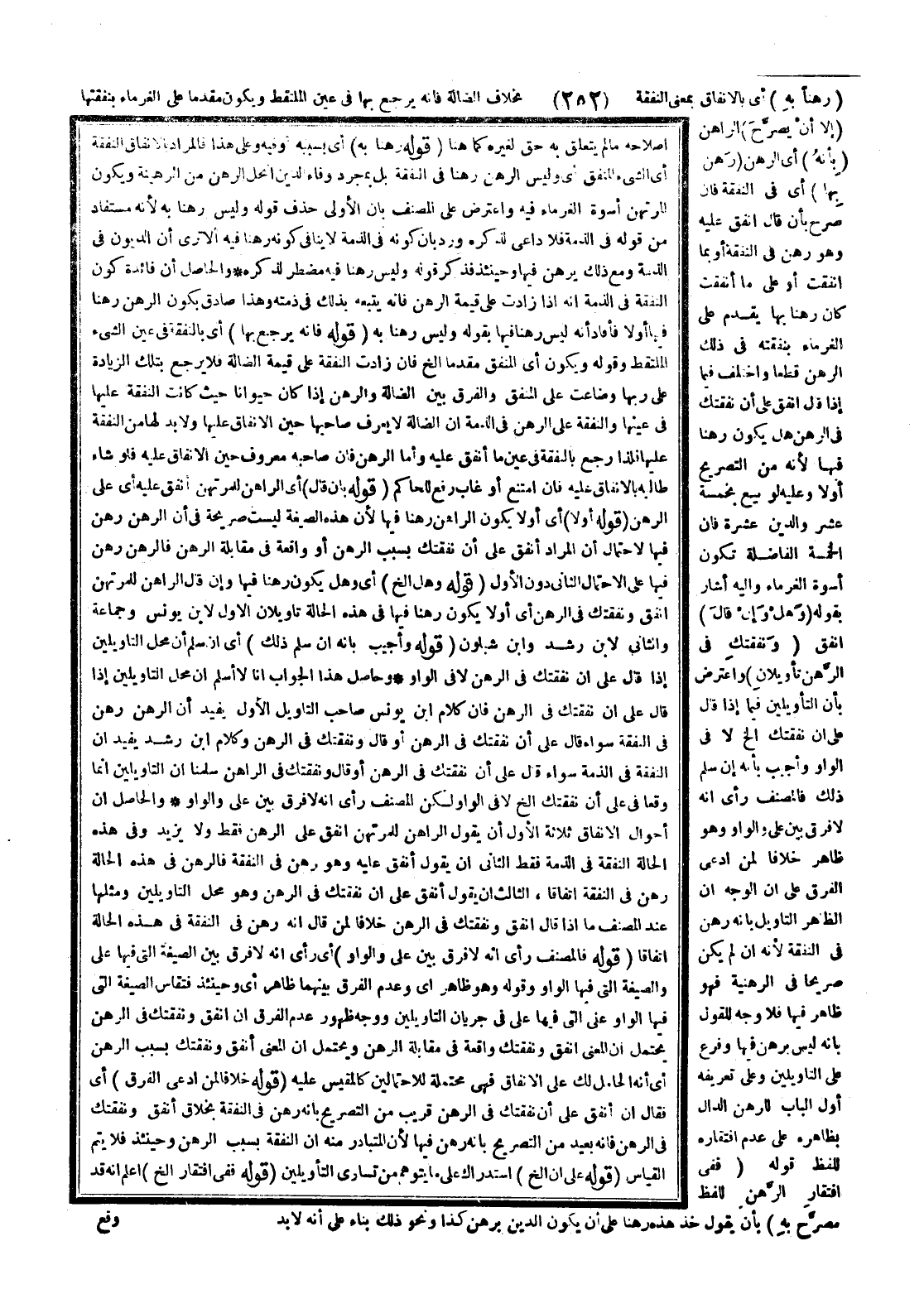 (رَهْنًا بِهِ) أَيْ بِالْإِنْفَاقِ بِمَعْنَى النَّفَقَةِ بِخِلَافِ الضَّالَّةِ فَإِنَّهُ يَرْجِعُ بِهَا فِي عَيْنِ الْمُلْتَقِطِ وَيَكُونُ مُقَدَّمًا عَلَى الْغُرَمَاءِ بِنَفَقَتِهَا (إلَّا أَنْ يُصَرِّحَ) الرَّاهِنُ (بِأَنَّهُ) أَيْ الرَّهْنُ (رَهْنٌ بِهَا) أَيْ فِي النَّفَقَةِ، فَإِنْ صَرَّحَ بِأَنْ قَالَ أَنْفِقْ عَلَيْهِ وَهُوَ رَهْنٌ فِي النَّفَقَةِ أَوْ بِمَا أَنْفَقْتَ أَوْ عَلَى مَا أَنْفَقْتَ كَانَ رَهْنًا بِهَا يُقَدَّمُ عَلَى الْغُرَمَاءِ بِنَفَقَتِهِ فِي ذَلِكَ الرَّهْنِ قَطْعًا، وَاخْتُلِفَ فِيمَا إذَا قَالَ أَنْفِقْ عَلَى أَنَّ نَفَقَتَك فِي الرَّهْنِ هَلْ يَكُونُ رَهْنًا فِيهَا؛ لِأَنَّهُ مِنْ التَّصْرِيحِ أَوْ لَا، وَعَلَيْهِ لَوْ بِيعَ بِخَمْسَةَ عَشَرَ وَالدَّيْنُ عَشَرَةٌ فَإِنَّ الْخَمْسَةَ الْفَاضِلَةَ تَكُونُ أُسْوَةَ الْغُرَمَاءِ وَإِلَيْهِ أَشَارَ بِقَوْلِهِ (وَهَلْ وَإِنْ قَالَ) أَنْفِقْ (وَنَفَقَتُك فِي الرَّهْنِ تَأْوِيلَانِ) وَاعْتُرِضَ بِأَنَّ التَّأْوِيلَيْنِ فِيمَا إذَا قَالَ عَلَى أَنَّ نَفَقَتَك إلَخْ لَا فِي الْوَاوِ وَأُجِيبَ بِأَنَّهُ إنْ سُلِّمَ ذَلِكَ فَالْمُصَنِّفُ رَأَى أَنَّهُ لَا فَرْقَ بَيْنَ عَلَى وَالْوَاوِ وَهُوَ ظَاهِرٌ خِلَافًا لِمَنْ ادَّعَى الْفَرْقَ عَلَى أَنَّ الْوَجْهَ أَنَّ الظَّاهِرَ التَّأْوِيلُ بِأَنَّهُ رَهْنٌ فِي النَّفَقَةِ؛ لِأَنَّهُ إنْ لَمْ يَكُنْ صَرِيحًا فِي الرَّهْنِيَّةِ فَهُوَ ظَاهِرٌ فِيهَا فَلَا وَجْهَ لِلْقَوْلِ بِأَنَّهُ لَيْسَ بِرَهْنٍ فِيهَا وَفَرَّعَ عَلَى التَّأْوِيلَيْنِ وَعَلَى تَعْرِيفِهِ أَوَّلَ الْبَابِ لِلرَّهْنِ الدَّالِّ بِظَاهِرِهِ عَلَى عَدَمِ افْتِقَارِهِ لِلَفْظٍ. قَوْلُهُ (فَفِي افْتِقَارِ الرَّهْنِ لِلَفْظٍ مُصَرَّحٍ بِهِ) بِأَنْ يَقُولَ خُذْ هَذِهِ رَهْنًا عَلَى أَنْ يَكُونَ الدَّيْنُ بِرَهْنِ كَذَا وَنَحْوِ ذَلِكَ بِنَاءً عَلَى أَنَّهُ لَا بُدَّ