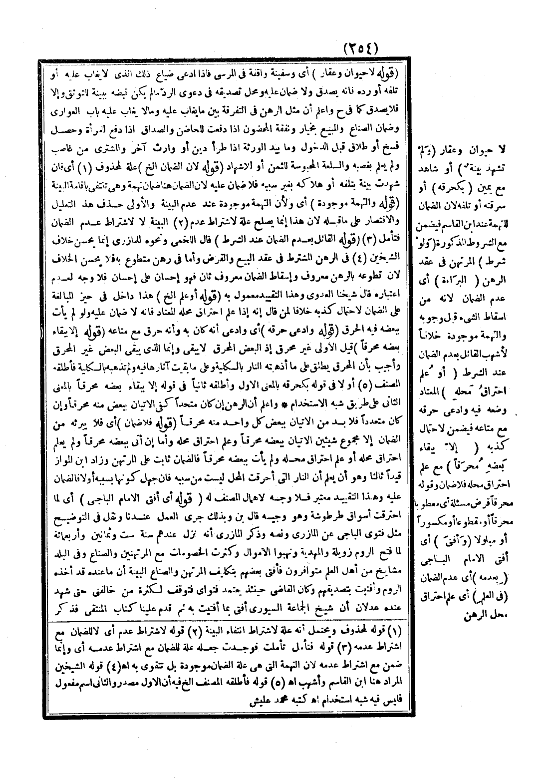 وَاعْلَمْ أَنَّ الرَّهْنَ إنْ كَانَ مُتَّحِدًا كَفَى الْإِتْيَانُ بِبَعْضٍ مِنْهُ مُحْرَقًا وَإِنْ كَانَ مُتَعَدِّدًا فَلَا بُدَّ مِنْ الْإِتْيَانِ بِبَعْضِ كُلِّ وَاحِدٍ مِنْهُ مُحْرَقًا (قَوْلُهُ فَلَا ضَمَانَ) أَيْ فَلَا يُبْرِئُهُ مِنْ الضَّمَانِ إلَّا مَجْمُوعُ شَيْئَيْنِ الْإِتْيَانُ بِبَعْضِهِ مُحْرَقًا وَعِلْمُ احْتِرَاقِ مَحَلِّهِ، وَأَمَّا إنْ أَتَى بِبَعْضِهِ مُحْرَقًا وَلَمْ يَعْلَمْ احْتِرَاقَ مَحَلِّهِ أَوْ عَلِمَ احْتِرَاقَ مَحَلِّهِ وَلَمْ يَأْتِ بِبَعْضِهِ مُحْرَقًا فَالضَّمَانُ ثَابِتٌ عَلَى الْمُرْتَهِنِ وَزَادَ ابْنُ الْمَوَّازِ قَيْدًا ثَالِثًا وَهُوَ أَنْ يَعْلَم أَنَّ النَّارَ الَّتِي أَحْرَقَتْ الْمَحَلَّ لَيْسَتْ مِنْ سَبَبِهِ، فَإِنْ جَهِلَ كَوْنَهَا بِسَبَبِهِ أَوْ لَا فَالضَّمَانُ عَلَيْهِ، وَهَذَا التَّقْيِيدُ مُعْتَبَرٌ فَلَا وَجْهَ لِإِهْمَالِ الْمُصَنِّفِ لَهُ (قَوْلُهُ أَيْ أَفْتَى الْإِمَامُ الْبَاجِيَّ) أَيْ لَمَّا احْتَرَقَتْ أَسْوَاقُ طَرْطُوشَةَ وَهُوَ وَجِيهٌ. قَالَ بْن وَبِذَلِكَ جَرَى الْعَمَلُ عِنْدَنَا وَنَقَلَ فِي التَّوْضِيحِ مِثْلَ فَتْوَى الْبَاجِيَّ عَنْ الْمَازِرِيِّ وَنَصُّهُ وَذَكَرَ الْمَازِرِيُّ أَنَّهُ نَزَلَ عِنْدَهُمْ سَنَةَ سِتٍّ وَثَمَانِينَ وَأَرْبَعِمِائَةٍ لَمَّا فَتَحَ الرُّومُ زُوَيْلَةَ وَالْمَهْدِيَّةَ وَنَهَبُوا الْأَمْوَالَ وَكَثُرَتْ الْخُصُومَاتُ مَعَ الْمُرْتَهِنِينَ وَالصُّنَّاعِ وَفِي الْبَلَدِ مَشَايِخُ مِنْ أَهْلِ الْعِلْمِ مُتَوَافِرُونَ فَأَفْتَى بَعْضُهُمْ بِتَكْلِيفِ الْمُرْتَهِنِ وَالصُّنَّاعِ الْبَيِّنَةَ أَنَّ مَا عِنْدَهُ قَدْ أَخَذَهُ الرُّومُ وَأَفْتَيْتُ بِتَصْدِيقِهِمْ وَكَانَ الْقَاضِي حِينَئِذٍ يَعْتَمِدُ فَتْوَايَ فَتَوَقَّفَ لِكَثْرَةِ مَنْ خَالَفَنِي حَتَّى شَهِدَ عِنْدَهُ عَدْلَانِ أَنَّ شَيْخَ الْجَمَاعَةِ السُّيُورِيِّ أَفْتَى بِمَا أَفْتَيْت بِهِ، ثُمَّ قَدِمَ عَلَيْنَا كِتَابُ الْمُنْتَقَى فَذَكَرَ