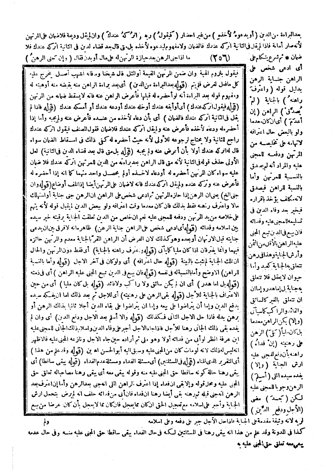 ، ثُمَّ شَرَعَ يَتَكَلَّمُ عَلَى مَا إذَا جَنَى الرَّهْنُ بَعْدَ حِيَازَةِ الْمُرْتَهِنِ لَهُ عَلَى مَالٍ أَوْ بَدَنٍ فَقَالَ (وَإِنْ جَنَى الرَّهْنُ) أَيْ ادَّعَى شَخْصٌ عَلَى الرَّاهِنِ جِنَايَةَ الرَّهْنِ بِدَلِيلِ قَوْلِهِ (وَاعْتَرَفَ رَاهِنُهُ) بِالْجِنَايَةِ (لَمْ يُصَدَّقْ) الرَّاهِنُ (إنْ أُعْدِمَ) أَيْ إنْ كَانَ مُعْدَمًا وَلَوْ بِالْبَعْضِ حَالَ اعْتِرَافِهِ لِاتِّهَامِهِ عَلَى تَخْلِيصِهِ مِنْ الْمُرْتَهِنِ وَدَفْعِهِ لِلْمَجْنِيِّ عَلَيْهِ وَالْمُرَادُ أَنَّهُ لَمْ يُصَدَّقْ بِالنِّسْبَةِ لِلْمُرْتَهِنِ وَأَمَّا بِالنِّسْبَةِ لِلرَّاهِنِ فَيُصَدَّقُ؛ لِأَنَّهُ مُكَلَّفٌ يُؤْخَذُ بِإِقْرَارِهِ فَيُخَيَّرُ بَعْدَ وَفَاءِ الدَّيْنِ فِي تَسْلِيمِهِ لِلْمَجْنِيِّ عَلَيْهِ وَفِدَائِهِ، فَإِنْ بِيعَ فِي الدَّيْنِ تَبِعَ الْمَجْنِيُّ عَلَيْهِ الرَّاهِنَ بِالْأَقَلِّ مِنْ الثَّمَنِ وَأَرْشِ الْجِنَايَةِ وَهَذَا فِي رَهْنٍ تَتَعَلَّقُ بِهِ الْجِنَايَةُ كَعَبْدٍ، وَأَمَّا حَيَوَانٍ لَا يَعْقِلُ فَلَا تَتَعَلَّقُ بِهِ جِنَايَةٌ بَلْ إمَّا هَدَرٌ وَإِمَّا أَنْ تَتَعَلَّقَ بِالْغَيْرِ كَالسَّائِقِ وَالْقَائِدِ وَالرَّاكِبِ كَمَا سَيَأْتِي (وَإِلَّا) يَكُنْ الرَّاهِنُ مُعْدَمًا بَلْ كَانَ مَلِيًّا (بَقِيَ) الرَّهْنُ عَلَى رَهْنِيَّتِهِ (إنْ فَدَاهُ) رَاهِنُهُ بِأَنْ دَفَعَ لِلْمَجْنِيِّ عَلَيْهِ أَرْشَ الْجِنَايَةِ (وَإِلَّا) يَفْدِهِ سَيِّدُهُ الْمَلِيُّ (أَسْلَمَ) الرَّهْنَ وُجُوبًا لِلْمَجْنِيِّ عَلَيْهِ لَكِنْ (بَعْدَ) مُضِيِّ (الْأَجَلِ وَدَفْعِ الدَّيْنِ) لِرَبِّهِ؛ لِأَنَّهُ وَثِيقَةٌ مُقَدَّمَةٌ عَلَى الْجِنَايَةِ، فَإِذَا حَلَّ الْأَجَلُ جُبِرَ عَلَى دَفْعِهِ وَعَلَى إسْلَامِهِ كَذَا فِي الْمُدَوَّنَةِ وَقَدْ عُلِمَ مِنْ هَذَا أَنَّهُ يَبْقَى رَهْنًا فِي الْمَسْأَلَتَيْنِ لَكِنَّهُ فِي حَالِ الْفِدَاءِ يَبْقَى سَاقِطًا حَقُّ الْمَجْنِيِّ عَلَيْهِ مِنْهُ وَفِي حَالِ عَدَمِهِ يَبْقَى مَعَهُ تَعَلُّقُ حَقِّ الْمَجْنِيِّ عَلَيْهِ بِهِ