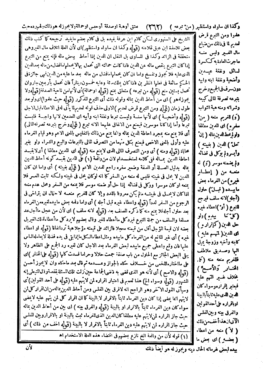 ـــــــــــــــــــــــــــــQالشَّيْخُ عَلِيٌّ السَّنْهُورِيُّ لَكِنَّ كَلَامَ ابْنِ عَرَفَةَ يُفِيدُهُ بَلْ فِي كَلَامِ بَعْضِهِمْ مَا يُفِيدُ تَرْجِيحَهُ كَمَا كَتَبَ ذَلِكَ بَعْضُ تَلَامِذَةِ ابْنِ عبق نَقْلًا عَنْهُ (قَوْلُهُ وَكَذَا إنْ سَاوَاهُ وَاسْتَظْهَرَ) أَيْ؛ لِأَنَّ الْعِلَّةَ إتْلَافُ مَالِ الْغَيْرِ وَهِيَ مُتَحَقِّقَةٌ فِي الزَّائِدِ وَكَذَا فِي الْمُسَاوِي بَلْ النَّقْلُ أَنَّ الدَّيْنَ إذَا أَحَاطَ بِبَعْضِ مَالِهِ فَإِنَّهُ يَمْنَعُ مِنْ التَّبَرُّعِ إذَا كَانَ التَّبَرُّعُ يُنْقِصُ مَالَهُ عَنْ الدَّيْنِ فَإِذَا كَانَتْ حَمَالَتُهُ الَّتِي تَحَمَّلَ بِهَا لَا يَحْمِلُهَا مَا فَضَلَ مِنْ مَالِهِ بَعْدَ الدَّيْنِ الَّذِي عَلَيْهِ فَلَا تَجُوزُ وَتُفْسَخُ، وَأَمَّا إنْ كَانَ يَحْمِلُهَا مَا فَضَلَ مِنْ مَالِهِ بَعْدَ مَا عَلَيْهِ مِنْ الدَّيْنِ فَهِيَ جَائِزَةٌ فِي الْحُكْمِ سَائِغَةٌ فِي فِعْلِهَا اُنْظُرْ بْن فَإِذَا كَانَ يَمْلِكُ مِائَةً وَعَلَيْهِ خَمْسُونَ دِينَارًا، فَإِنْ تَحَمَّلَ بِأَرْبَعِينَ جَازَ وَإِنْ تَحَمَّلَ بِسِتِّينَ مُنِعَ.