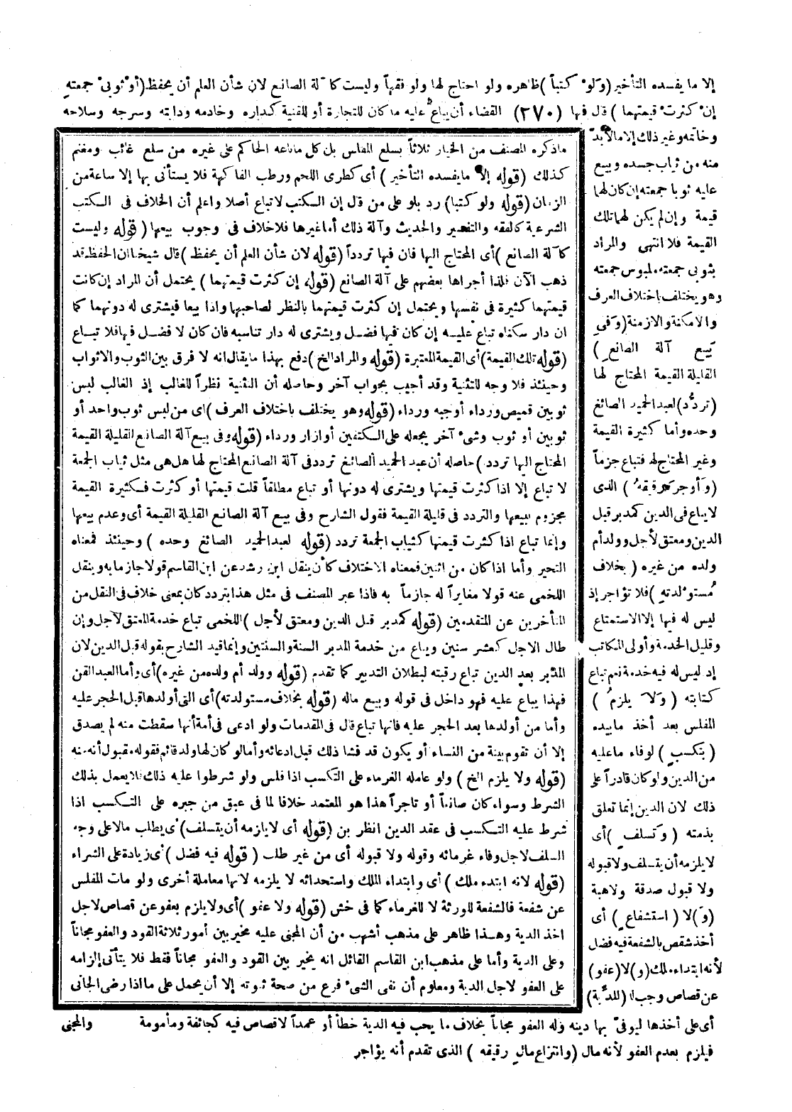 إلَّا مَا يُفْسِدُهُ التَّأْخِيرُ (وَلَوْ كُتُبًا) ظَاهِرُهُ وَلَوْ احْتَاجَ لَهَا وَلَوْ فِقْهًا وَلَيْسَتْ كَآلَةِ الصَّانِعِ؛ لِأَنَّ شَأْنَ الْعِلْمِ أَنْ يُحْفَظَ (أَوْ ثَوْبَيْ جُمُعَتِهِ إنْ كَثُرَتْ قِيمَتُهُمَا) قَالَ فِيهَا الْقَضَاءُ أَنْ يُبَاعَ عَلَيْهِ مَا كَانَ لِلتِّجَارَةِ أَوْ لِلْقُنْيَةِ كَدَارِهِ وَخَادِمِهِ وَدَابَّتِهِ وَسَرْجِهِ وَسِلَاحِهِ وَخَاتَمِهِ وَغَيْرِ ذَلِكَ إلَّا مَا لَا بُدَّ مِنْهُ مِنْ ثِيَابِ جَسَدِهِ، وَبِيعَ عَلَيْهِ ثَوْبَا جُمُعَتِهِ إنْ كَانَ لَهُمَا قِيمَةٌ وَإِنْ لَمْ يَكُنْ لَهُمَا تِلْكَ الْقِيمَةُ فَلَا انْتَهَى. وَالْمُرَادُ بِثَوْبَيْ جُمُعَتِهِ مَلْبُوسُ جُمُعَتِهِ وَهُوَ يَخْتَلِفُ بِاخْتِلَافِ الْعُرْفِ وَالْأَمْكِنَةِ وَالْأَزْمِنَةِ (وَفِي بَيْعِ آلَةِ الصَّانِعِ) الْقَلِيلَةِ الْقِيمَةِ الْمُحْتَاجِ لَهَا (تَرَدُّدٌ) لِعَبْدِ الْحَمِيدِ الصَّائِغِ وَحْدَهُ، وَأَمَّا كَثِيرَةُ الْقِيمَةِ وَغَيْرُ الْمُحْتَاجِ لَهَا فَتُبَاعُ جَزْمًا (وَأَوْجَرَ رَقِيقَهُ) الَّذِي لَا يُبَاعُ فِي الدَّيْنِ كَمُدَبَّرٍ قَبْلَ الدَّيْنِ وَمُعْتَقٍ لِأَجَلٍ وَوَلَدِ أُمِّ وَلَدِهِ مِنْ غَيْرِهِ (بِخِلَافِ مُسْتَوْلَدَتِهِ) فَلَا تُؤَاجَرُ إذْ لَيْسَ لَهُ فِيهَا إلَّا الِاسْتِمْتَاعُ وَقَلِيلُ الْخِدْمَةِ وَأَوْلَى الْمُكَاتَبُ إذْ لَيْسَ لَهُ فِيهِ خِدْمَةٌ نَعَمْ تُبَاعُ كِتَابَتُهُ (وَلَا يُلْزَمُ) الْمُفَلَّسُ بَعْدَ أَخْذِ مَا بِيَدِهِ (بِتَكَسُّبٍ) لِوَفَاءِ مَا عَلَيْهِ مِنْ الدَّيْنِ وَلَوْ كَانَ قَادِرًا عَلَى ذَلِكَ؛ لِأَنَّ الدَّيْنَ إنَّمَا تَعَلَّقَ بِذِمَّتِهِ (وَتَسَلُّفٍ) أَيْ لَا يَلْزَمُهُ أَنْ يَتَسَلَّفَ، وَلَا قَبُولُهُ، وَلَا قَبُولُ صَدَقَةٍ، وَلَا هِبَةٍ (وَ) لَا (اسْتِشْفَاعٍ) أَيْ أَخْذُ شِقْصٍ بِالشُّفْعَةِ فِيهِ فَضْلٌ؛ لِأَنَّهُ ابْتِدَاءُ مِلْكٍ (وَ) لَا (عَفْوٍ) عَنْ قِصَاصٍ وَجَبَ لَهُ (لِلدِّيَةِ) أَيْ عَلَى أَخْذِهَا لِيُوَفِّيَ بِهَا دَيْنَهُ وَلَهُ الْعَفْوُ مَجَّانًا بِخِلَافِ مَا يَجِبُ فِيهِ الدِّيَةُ خَطَأً أَوْ عَمْدًا لَا قِصَاصَ فِيهِ كَجَائِفَةٍ وَمَأْمُومَةٍ، فَيَلْزَمُ بِعَدَمِ الْعَفْوِ؛ لِأَنَّهُ مَالٌ (وَانْتِزَاعِ مَالِ رَقِيقِهِ) الَّذِي تَقَدَّمَ أَنَّهُ يُؤَاجَرُ