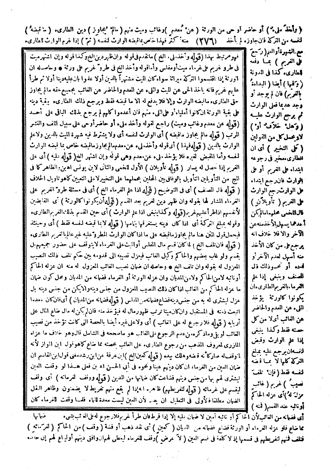 ـــــــــــــــــــــــــــــQفَهُوَ مُرْتَبِطٌ بِهَذَا (قَوْلُهُ وَأَخَذَ مَلِيءٌ إلَخْ) مَا تَقَدَّمَ فِي قَوْلِهِ وَإِنْ ظَهَرَ دَيْنٌ إلَخْ وَكَذَا قَوْلُهُ وَإِنْ اشْتَهَرَ مَيِّتٌ فِي طُرُوُّ غَرِيمٍ عَلَى غُرَمَاءِ مَيِّتٍ أَوْ مُفَلَّسٍ، وَأَمَّا قَوْلُهُ وَأَخَذَ إلَخْ فِي طُرُوُّ غَرِيمٍ عَلَى وَرَثَةٍ. وَحَاصِلُهُ أَنَّ الْوَرَثَةَ إذَا اقْتَسَمُوا التَّرِكَةَ مِيرَاثًا سَوَاءٌ كَانَ الْمَيِّتُ مُشْتَهِرًا بِالدَّيْنِ أَوْ لَا عَلِمُوا بِأَنَّ عَلَيْهِ دَيْنًا أَوْ لَا، ثُمَّ طَرَأَ عَلَيْهِمْ غَرِيمٌ فَإِنَّهُ يَأْخُذُ الْحَيُّ عَنْ الْمَيِّتِ وَالْمَلِيءُ عَنْ الْمُعْدَمِ وَالْحَاضِرُ عَنْ الْغَائِبِ بِجَمِيعِ حَقِّهِ مَا لَمْ يُجَاوِزْ حَقُّ الطَّارِئِ مَا قَبَضَهُ الْوَارِثُ وَإِلَّا فَلَا يَدْفَعُ لَهُ إلَّا مَا قَبَضَهُ فَقَطْ وَيَرْجِعُ ذَلِكَ الطَّارِئُ بِبَقِيَّةِ دَيْنِهِ عَلَى بَقِيَّةِ الْوَرَثَةِ إنْ كَانُوا أَمْلِيَاءَ أَوْ عَلَى الْمَلِيءِ مِنْهُمْ، فَإِنْ أُعْدِمُوا كُلُّهُمْ لَمْ يَرْجِعْ بِذَلِكَ الْبَاقِي عَلَى أَحَدٍ (قَوْلُهُ عَنْ مُعْدَمٍ وَغَائِبٍ وَمَيِّتٍ) رَاجِعٌ لِقَوْلِهِ وَأَخَذَ مَلِيءٌ أَوْ حَاضِرٌ أَوْ حَيٌّ عَلَى سَبِيلِ اللَّفِّ وَالنَّشْرِ الْمُرَتَّبِ (قَوْلُهُ مَا لَمْ يُجَاوِزْ مَا قَبَضَهُ) أَيْ الْوَارِثُ لِنَفْسِهِ أَيْ وَلَا يُشْتَرَطُ فِيهِ شُهْرَةُ الْمَيِّتِ بِالدَّيْنِ وَلَا عِلْمُ الْوَارِثِ بِالدَّيْنِ (قَوْلُهُ فَهَذَا) أَيْ قَوْلُهُ وَأَخَذَ مَلِيءٌ عَنْ مُعْدَمٍ مَا لَمْ يُجَاوِزْ مَا قَبَضَهُ خَاصٌّ بِمَا قَبَضَهُ الْوَارِثُ لِنَفْسِهِ، وَأَمَّا الْمُقْبِضُ لِغَيْرِهِ فَلَا يُؤْخَذُ مَلِيءٌ عَنْ مُعْدَمٍ وَهِيَ قَوْلُهُ وَإِنْ اُشْتُهِرَ إلَخْ (قَوْلُهُ عَلَيْهِ) أَيْ عَلَى الْغَرِيمِ إذَا حَصَلَ لَهُ يَسَارٌ (قَوْلُهُ تَأْوِيلَانِ) الْأَوَّلُ لِلَّخْمِيِّ وَالثَّانِي لِابْنِ يُونُسَ اهـ بْن وَالظَّاهِرُ كَمَا فِي المج مِنْ التَّأْوِيلَيْنِ التَّأْوِيلُ بِالْوِفَاقِ بَيْنَ الْمَحَلَّيْنِ بِحَمْلِهِمَا عَلَى التَّخْيِيرِ لَا عَلَى التَّعْيِينِ كَمَا هُوَ تَأْوِيلُ الْخِلَافِ (قَوْلُهُ قَالَ الْمُصَنِّفُ) أَيْ فِي التَّوْضِيحِ (قَوْلُهُ إذَا عَلِمَ الْغُرَمَاءُ إلَخْ) أَيْ فِي مَسْأَلَةِ طُرُوُّ الْغَرِيمِ عَلَى الْغُرَمَاءِ الْمُشَارِ لَهَا بِقَوْلِهِ وَإِنْ ظَهَرَ دَيْنٌ لِغَرِيمٍ بَعْدَ الْقَسْمِ (قَوْلُهُ أَنْ يَكُونُوا كَالْوَرَثَةِ) أَيْ الْقَابِضِينَ لِأَنْفُسِهِمْ إذَا طَرَأَ عَلَيْهِمْ غَرِيمٌ (قَوْلُهُ وَكَذَا يَنْبَغِي إذَا عَلِمَ الْوَارِثُ) أَيْ حِينَ الْقَسْمِ بِذَلِكَ الْغَرِيمِ الطَّارِئِ، وَقَوْلُهُ بِمَبْلَغِ التَّرِكَةِ أَيْ إذَا كَانَ دَيْنُهُ يَسْتَغْرِقُهَا بِتَمَامِهَا (قَوْلُهُ لَا بِمَا قَبَضَهُ لِنَفْسِهِ فَقَطْ) أَيْ وَحِينَئِذٍ فَيُحْمَلُ قَوْلُ الْمَتْنِ هُنَا مَا لَمْ يُجَاوِزْ مَا قَبَضَهُ عَلَى مَا إذَا كَانَ الْوَارِثُ الْمَطْرُوُّ عَلَيْهِ غَيْرَ عَالِمٍ بِالْغَرِيمِ الطَّارِئِ (قَوْلُهُ، فَإِنْ تَلِفَ إلَخْ) لَمَّا كَانَ قَسْمُ مَالِ الْمُفَلَّسِ أَوْ الْمَيِّتِ عَلَى الْغُرَمَاءِ لَا يَتَوَقَّفُ عَلَى حُضُورِ جَمِيعِهِمْ بَلْ يُقْسَمُ وَلَوْ غَابَ بَعْضُهُمْ وَالْحَاكِمُ وَكِيلُ الْغَائِبِ فَيَعْزِلُ نَصِيبَهُ إلَى قُدُومِهِ بَيَّنَ حُكْمَ تَلَفِ ذَلِكَ النَّصِيبِ الْمَعْزُولِ لَهُ بِقَوْلِهِ وَإِنْ تَلِفَ إلَخْ، وَحَاصِلُهُ أَنَّ ضَمَانَ نَصِيبِ الْغَائِبِ الْمَعْزُولِ لَهُ مِنْهُ إنْ عَزَلَهُ الْحَاكِمُ أَوْ نَائِبُهُ لَا مِنْ الْحَاكِمِ وَلَا مِنْ الْمِدْيَانِ وَإِنْ عَزَلَهُ الْوَرَثَةُ أَوْ الْغُرَمَاءُ فَضَمَانُهُ مِنْ الْمِدْيَانِ وَمَحَلُّ 