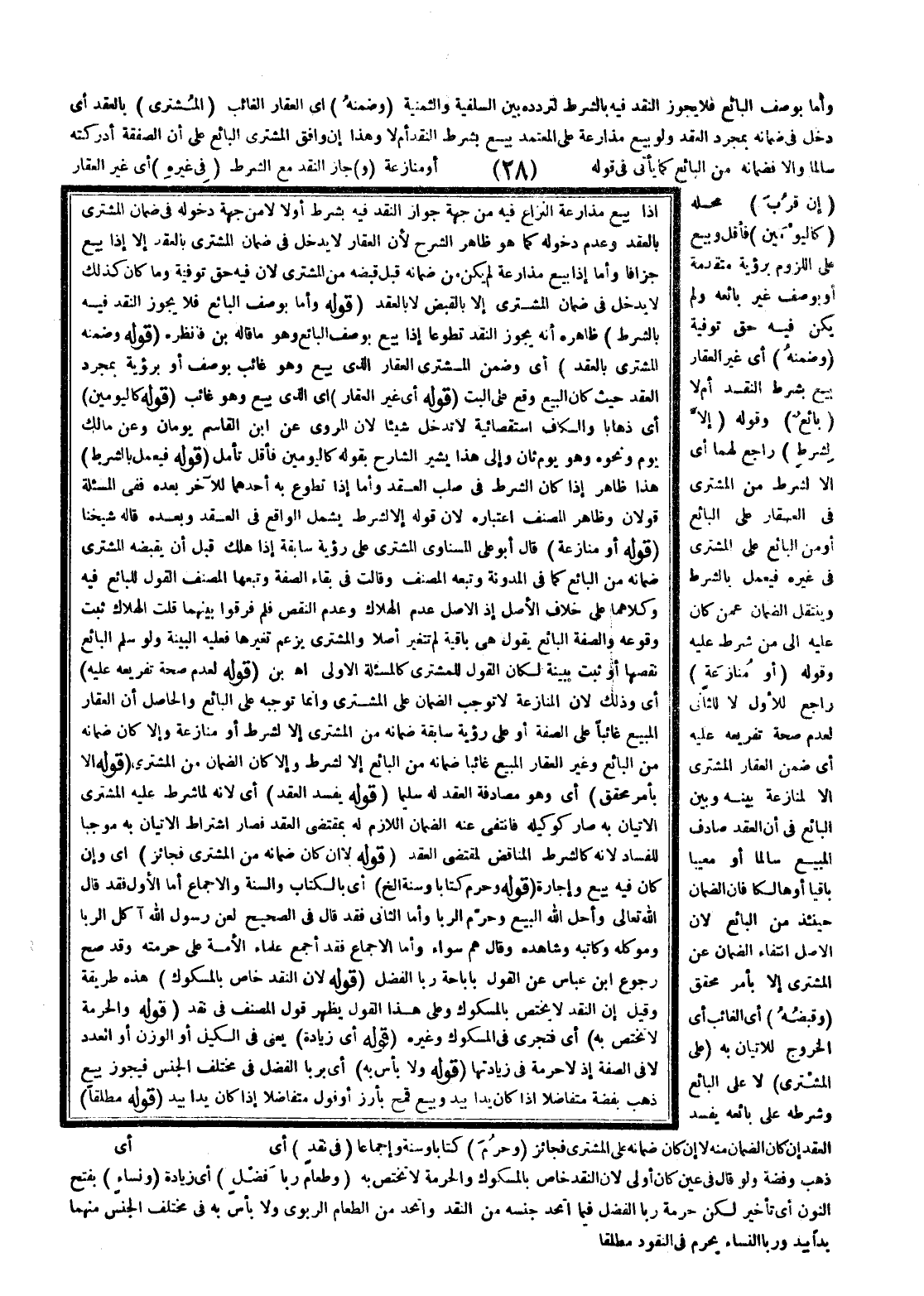 ـــــــــــــــــــــــــــــQإذَا بِيعَ مُذَارَعَةً النِّزَاعُ فِيهِ مِنْ جِهَةِ النَّقْدِ فِيهِ بِشَرْطٍ أَوَّلًا لَا مِنْ جِهَةِ دُخُولِهِ فِي ضَمَانِ الْمُشْتَرِي بِالْعَقْدِ وَعَدَمِ دُخُولِهِ كَمَا هُوَ ظَاهِرُ الشَّرْحِ؛ لِأَنَّ الْعَقَارَ لَا يَدْخُلُ فِي ضَمَانِ الْمُشْتَرِي بِالْعَقْدِ إلَّا إذَا بِيعَ جُزَافًا، وَأَمَّا إذَا بِيعَ مُذَارَعَةً لَمْ يَكُنْ مِنْ ضَمَانِهِ قَبْلَ قَبْضِهِ مِنْ الْمُشْتَرِي لِأَنَّ فِيهِ حَقَّ تَوْفِيَةٍ وَمَا كَانَ كَذَلِكَ لَا يَدْخُلُ فِي ضَمَانِ الْمُشْتَرِي إلَّا بِالْقَبْضِ لَا بِالْعَقْدِ.