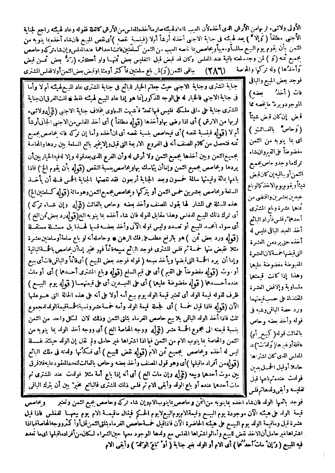 وَشَبَّهَ فِي قَوْلِهِ " وَأَخْذُ بَعْضِهِ وَحَاصَّ بِالْفَائِتِ " قَوْلَهُ (كَبَيْعِ أُمٍّ) عَاقِلَةٍ أَوْ غَيْرِهَا (وَلَدَتْ) عِنْدَ الْمُفَلَّسِ الَّذِي كَانَ اشْتَرَاهَا حَامِلًا أَوْ قَبْلَ الْحَمْلِ بِدَيْنٍ فَوَلَدَتْ عِنْدَهُ، ثُمَّ بَاعَهَا قَبْلَ تَفْلِيسِهِ وَأَبْقَى وَلَدَهَا، ثُمَّ فُلِّسَ فَوَجَدَ بَائِعُهَا الْوَلَدَ، فَإِنْ شَاءَ أَخَذَهُ بِمَا يَنُوبُهُ مِنْ الثَّمَنِ وَحَاصَصَ بِمَا يَنُوبُ الْأُمَّ وَإِنْ شَاءَ تَرَكَهُ وَحَاصَصَ بِجَمِيعِ الثَّمَنِ وَتُعْتَبَرُ قِيمَةُ الْوَلَدِ عَلَى هَيْئَتِهِ الْآنَ مَوْجُودَةً يَوْمَ الْبَيْعِ وَقِيمَةُ الْأُمِّ يَوْمَ الْبَيْعِ لَا يَوْمَ الْحُكْمِ فَيُقَالُ مَا قِيمَةُ الْأُمِّ يَوْمَ بَيْعِهَا لِلْمُفَلَّسِ؟ فَإِذَا قِيلَ عَشَرَةٌ قِيلَ وَمَا قِيمَةُ الْوَلَدِ يَوْمَ الْبَيْعِ عَلَى هَيْئَتِهِ الْحَاضِرَةِ الْآنَ؟ فَإِذَا قِيلَ خَمْسَةٌ حَاصَصَ الْغُرَمَاءَ بِثُلُثِي الثَّمَنِ قَلَّ أَوْ أَكْثَرَ، وَوَجْهُ الْمُحَاصَّةِ فِيمَا إذَا اشْتَرَاهَا غَيْرَ حَامِلٍ أَنَّ الْأَخْذَ نَقْضٌ لِلْبَيْعِ، وَأَمَّا لَوْ اشْتَرَاهَا الْمُفَلَّسُ مَعَ وَلَدِهَا الْمَوْجُودِ مَعَهَا حِينَ الشِّرَاءِ لَكَانَ مِنْ أَفْرَادِ مَا قَبْلَهَا أَيْ مَا تَعَدَّدَ فِيهِ الْمَبِيعُ (وَإِنْ مَاتَ أَحَدُهُمَا) أَيْ الْأُمُّ أَوْ الْوَلَدُ بِغَيْرِ جِنَايَةٍ (أَوْ بَاعَ الْوَلَدَ) وَأَبْقَى الْأُمَّ