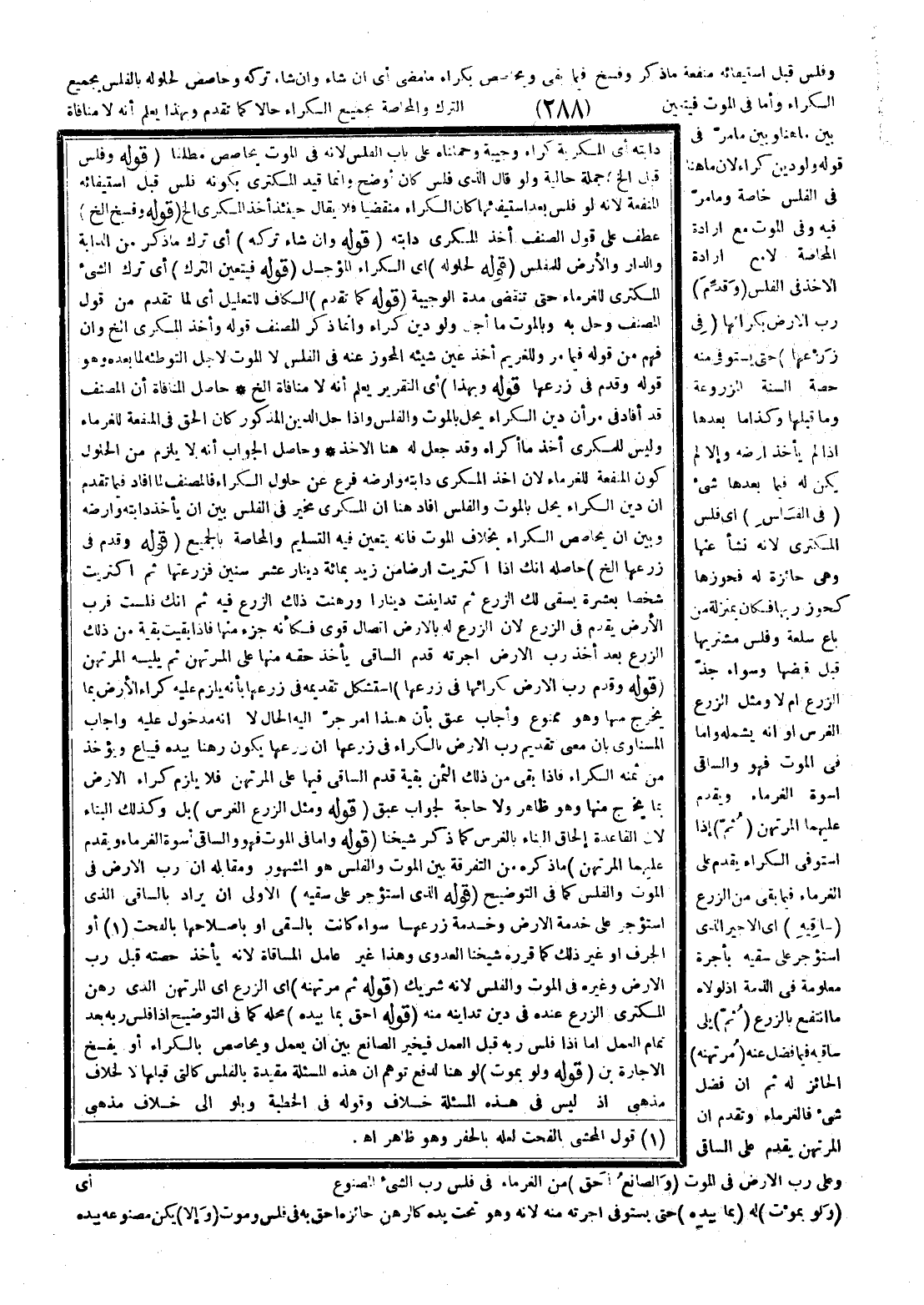 (قَوْلُهُ وَقَدَّمَ فِي زَرْعِهَا إلَخْ) حَاصِلُهُ أَنَّكَ إذَا اكْتَرَيْت أَرْضًا مِنْ زَيْدٍ بِمِائَةِ دِينَارٍ عَشْرَ سِنِينَ فَزَرَعْتهَا، ثُمَّ اكْتَرَيْت شَخْصًا بِعَشَرَةٍ يَسْقِي لَك الزَّرْعَ، ثُمَّ تَدَايَنْت دِينَارًا وَرَهَنْتَ ذَلِكَ الزَّرْعَ فِيهِ، ثُمَّ إنَّك فَلِسْت فَرَبُّ الْأَرْضِ يُقَدَّمُ فِي الزَّرْعِ؛ لِأَنَّ الزَّرْعَ لَهُ بِالْأَرْضِ اتِّصَالٌ قَوِيٌّ فَكَأَنَّهُ جُزْءٌ مِنْهَا فَإِذَا بَقِيَتْ بَقِيَّةٌ مِنْ ذَلِكَ الزَّرْعِ بَعْدَ أَخْذِ رَبِّ الْأَرْضِ أُجْرَتَهُ قُدِّمَ السَّاقِي يَأْخُذُ حَقَّهُ مِنْهَا عَلَى الْمُرْتَهِنِ، ثُمَّ يَلِيهِ الْمُرْتَهِنُ (قَوْلُهُ وَقُدِّمَ رَبُّ الْأَرْضِ بِكِرَائِهَا فِي زَرْعِهَا) اُسْتُشْكِلَ تَقْدِيمُهُ فِي زَرْعِهَا بِأَنَّهُ يَلْزَمُهُ عَلَيْهِ كِرَاءُ الْأَرْضِ بِمَا يَخْرُجُ مِنْهَا وَهُوَ مَمْنُوعٌ وَأَجَابَ عبق بِأَنَّ هَذَا أَمْرٌ جَرَّ إلَيْهِ الْحَالُ لَا أَنَّهُ مَدْخُولٌ عَلَيْهِ، وَأَجَابَ الْمِسْنَاوِيُّ بِأَنَّ مَعْنَى تَقْدِيمِ رَبِّ الْأَرْضِ بِالْكِرَاءِ فِي زَرْعِهَا يَكُونُ رَهْنًا بِيَدِهِ فَيُبَاعُ وَيُؤْخَذُ مِنْ ثَمَنِهِ الْكِرَاءُ فَإِذَا بَقِيَ مِنْ ذَلِكَ الثَّمَنِ بَقِيَّةٌ قُدِّمَ السَّاقِي فِيهَا عَلَى الْمُرْتَهِنِ فَلَا يَلْزَمُ كِرَاءُ الْأَرْضِ بِمَا يَخْرُجُ مِنْهَا وَهُوَ ظَاهِرٌ وَلَا حَاجَةَ لِجَوَابِ عبق (قَوْلُهُ وَمِثْلُ الزَّرْعِ الْغَرْسُ) بَلْ وَكَذَلِكَ الْبِنَاءُ؛ لِأَنَّ الْقَاعِدَةَ إلْحَاقُ الْبِنَاءِ بِالْغَرْسِ كَمَا ذَكَرَ شَيْخُنَا (قَوْلُهُ وَأَمَّا فِي الْمَوْتِ فَهُوَ وَالسَّاقِي أُسْوَةُ الْغُرَمَاءِ وَيُقَدَّمُ عَلَيْهِمَا الْمُرْتَهِنُ) مَا ذَكَرَهُ مِنْ التَّفْرِقَةِ بَيْنَ الْمَوْتِ وَالْفَلَسِ هُوَ الْمَشْهُورُ وَمُقَابِلُهُ أَنْ رَبَّ الْأَرْضِ فِي الْمَوْتِ وَالْفَلَسِ كَمَا فِي التَّوْضِيحِ (قَوْلُهُ الَّذِي اُسْتُؤْجِرَ عَلَى سَقْيِهِ) الْأَوْلَى أَنْ يُرَادَ بِالسَّاقِي الَّذِي اُسْتُؤْجِرَ عَلَى خِدْمَةِ الْأَرْضِ وَخِدْمَةِ زَرْعِهَا سَوَاءٌ كَانَتْ بِالسَّقْيِ أَوْ بِإِصْلَاحِهَا بِالْفَحْتِ أَوْ الْجَرْفِ أَوْ غَيْرِ ذَلِكَ كَمَا قَرَّرَهُ شَيْخُنَا الْعَدَوِيُّ، وَهَذَا غَيْرُ عَامِلِ الْمُسَاقَاةِ؛ لِأَنَّهُ يَأْخُذُ حِصَّتَهُ قَبْلَ رَبِّ الْأَرْضِ وَغَيْرِهِ فِي الْمَوْتِ وَالْفَلَسِ؛ لِأَنَّهُ شَرِيكٌ (قَوْلُهُ ثُمَّ مُرْتَهِنُهُ) أَيْ الزَّرْعِ أَيْ الْمُرْتَهِنُ الَّذِي رَهَنَ الْمُكْتَرِي الزَّرْعَ عِنْدَهُ فِي دَيْنٍ تَدَايَنَهُ مِنْهُ.