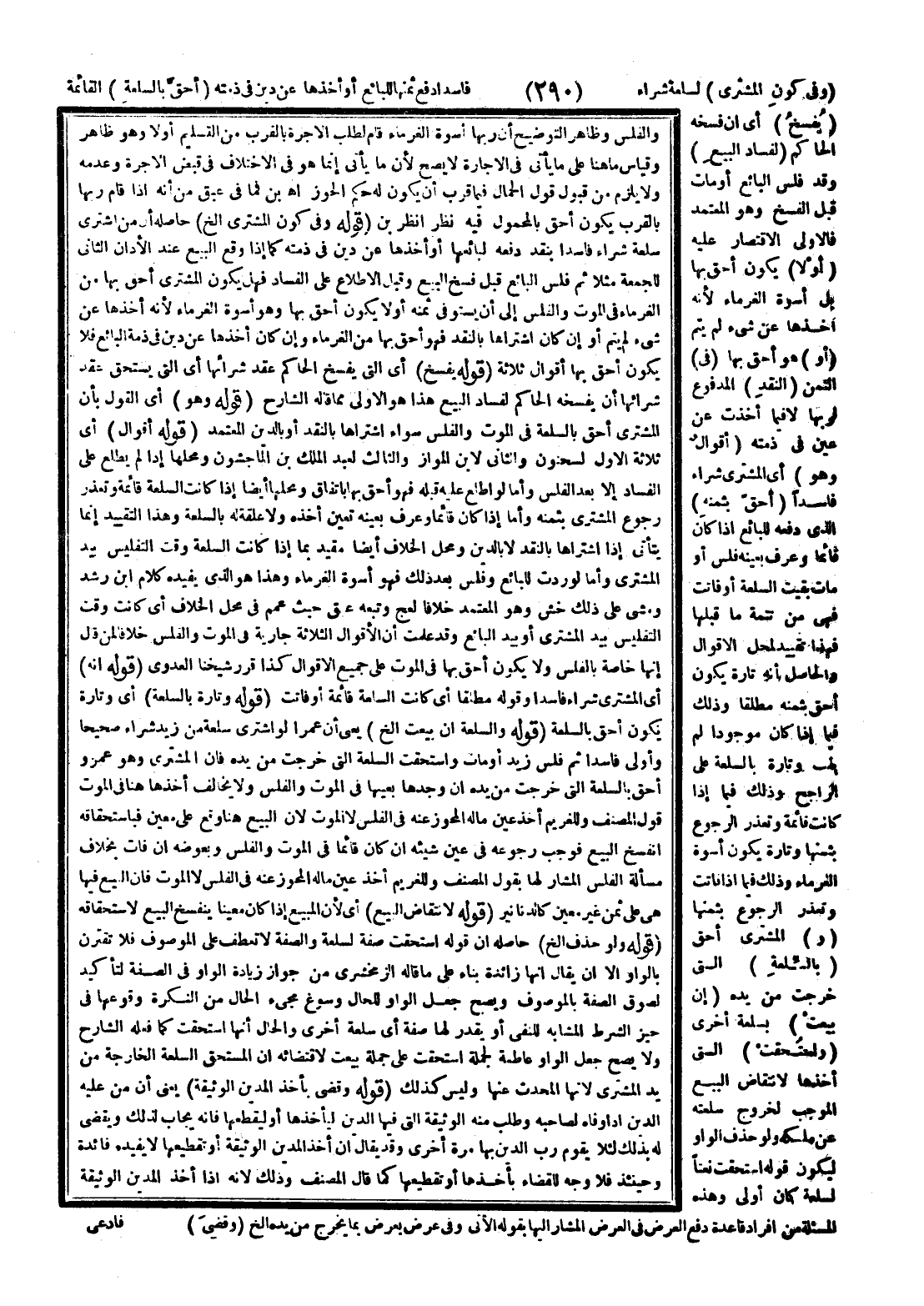 (وَفِي كَوْنِ الْمُشْتَرِي) لِسِلْعَةٍ شِرَاءً فَاسِدًا دَفَعَ ثَمَنَهَا لِلْبَائِعِ أَوْ أَخَذَهَا عَنْ دَيْنٍ فِي ذِمَّتِهِ (أَحَقَّ بِالسِّلْعَةِ) الْقَائِمَةِ (يُفْسَخُ) أَيْ إنْ فَسَخَهُ الْحَاكِمُ (لِفَسَادِ الْبَيْعِ) وَقَدْ فَلِسَ الْبَائِعُ أَوْ مَاتَ قَبْلَ الْفَسْخِ وَهُوَ الْمُعْتَمَدُ فَالْأَوْلَى الِاقْتِصَارُ عَلَيْهِ (أَوْ لَا) يَكُونُ أَحَقَّ بِهَا بَلْ أُسْوَةَ الْغُرَمَاءِ؛ لِأَنَّهُ أَخَذَهَا عَنْ شَيْءٍ لَمْ يَتِمَّ (أَوْ) هُوَ أَحَقُّ بِهَا (فِي) الثَّمَنِ (النَّقْدِ) الْمَدْفُوعِ لِرَبِّهَا لَا فِيمَا أُخِذَتْ عَنْ عَيْنٍ فِي ذِمَّتِهِ (أَقْوَالٌ وَهُوَ) أَيْ الْمُشْتَرِي شِرَاءً فَاسِدًا (أَحَقُّ بِثَمَنِهِ) الَّذِي دَفَعَهُ لِلْبَائِعِ إذَا كَانَ قَائِمًا وَعُرِفَ بِعَيْنِهِ فُلِّسَ أَوْ مَاتَ بَقِيَتْ السِّلْعَةُ أَوْ فَاتَتْ فَهِيَ مِنْ تَتِمَّةِ مَا قَبْلَهَا فَهَذَا تَقْيِيدٌ لِمَحَلِّ الْأَقْوَالِ وَالْحَاصِلُ أَنَّهُ تَارَةً يَكُونُ أَحَقَّ بِثَمَنِهِ مُطْلَقًا وَذَلِكَ فِيمَا إذَا كَانَ مَوْجُودًا لَمْ يَفُتْ وَتَارَةً بِالسِّلْعَةِ عَلَى الرَّاجِحِ وَذَلِكَ فِيمَا إذَا كَانَتْ قَائِمَةً وَتَعَذَّرَ الرُّجُوعُ بِثَمَنِهَا وَتَارَةً يَكُونُ أُسْوَةَ الْغُرَمَاءِ وَذَلِكَ فِيمَا إذَا فَاتَتْ وَتَعَذَّرَ الرُّجُوعُ بِثَمَنِهَا.