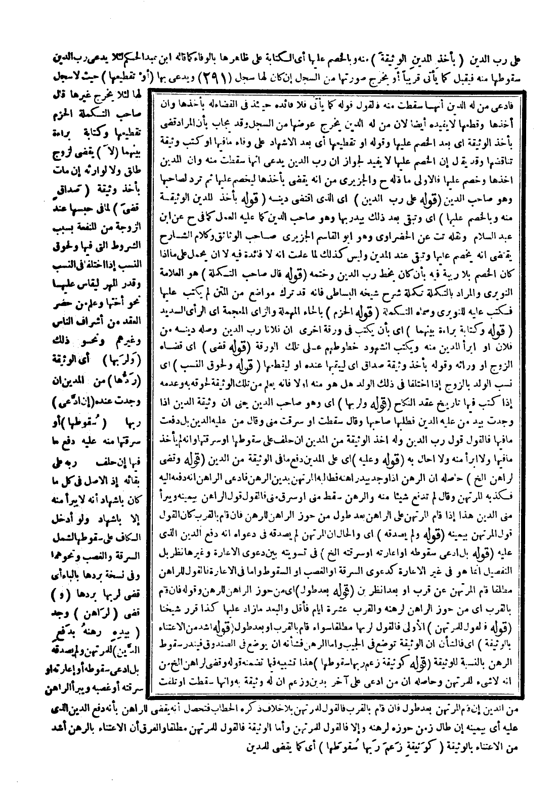 عَلَى رَبِّ الدَّيْنِ (بِأَخْذِ الْمَدِينِ الْوَثِيقَةَ) مِنْهُ وَبِالْخَصْمِ عَلَيْهَا أَيْ الْكِتَابَةِ عَلَى ظَاهِرِهَا بِالْوَفَاءِ كَمَا قَالَهُ ابْنُ عَبْدِ الْحَكَمِ لِئَلَّا يَدَّعِيَ رَبُّ الدَّيْنِ سُقُوطَهَا مِنْهُ فَيُقْبَلُ كَمَا يَأْتِي قَرِيبًا أَوْ يُخْرِجَ صُورَتَهَا مِنْ السِّجِلِّ إنْ كَانَ لَهَا سِجِلٌّ وَيَدَّعِي بِهَا (أَوْ تَقْطِيعِهَا) حَيْثُ لَا سِجِلَّ لَهَا لِئَلَّا يُخْرِجَ غَيْرَهَا قَالَ صَاحِبُ التَّكْمِلَةِ الْحَزْمُ تَقْطِيعُهَا وَكِتَابَةُ بَرَاءَةٍ بَيْنَهُمَا (لَا) يُقْضَى لِزَوْجٍ طَلَّقَ، وَلَا لِوَارِثِهِ إنْ مَاتَ بِأَخْذِ وَثِيقَةِ (صَدَاقٍ قُضِيَ) لِمَا فِي حَبْسِهَا عِنْدَ الزَّوْجَةِ مِنْ الْمَنْفَعَةِ بِسَبَبِ الشُّرُوطِ الَّتِي فِيهَا وَلُحُوقِ النَّسَبِ إذَا اخْتَلَفَا فِي النَّسَبِ وَقَدْرِ الْمَهْرِ لِيُقَاسَ عَلَيْهَا نَحْوُ أُخْتِهَا وَعِلْمِ مَنْ حَضَرَ الْعَقْدَ مِنْ أَشْرَافِ النَّاسِ وَغَيْرِهِمْ وَنَحْوِ ذَلِكَ (وَلِرَبِّهَا) أَيْ الْوَثِيقَةِ (رَدُّهَا) مِنْ الْمَدِينِ إنْ وُجِدَتْ عِنْدَهُ (إنْ ادَّعَى) رَبُّهَا (سُقُوطَهَا) أَوْ سَرِقَتَهَا مِنْهُ عَلَيْهِ دَفْعُ مَا فِيهَا إنْ حَلَفَ رَبُّهُ عَلَى بَقَائِهِ إذْ الْأَصْلُ فِي كُلِّ مَا كَانَ بِإِشْهَادٍ أَنَّهُ لَا يَبْرَأُ مِنْهُ إلَّا بِإِشْهَادٍ وَلَوْ أَدْخَلَ الْكَافَ عَلَى سُقُوطِهَا لَشَمَلَ السَّرِقَةَ وَالْغَصْبَ وَنَحْوَهُمَا وَفِي نُسْخَةٍ بِرَدِّهَا بِالْبَاءِ أَيْ قُضِيَ لِرَبِّهَا بِرَدِّهَا.