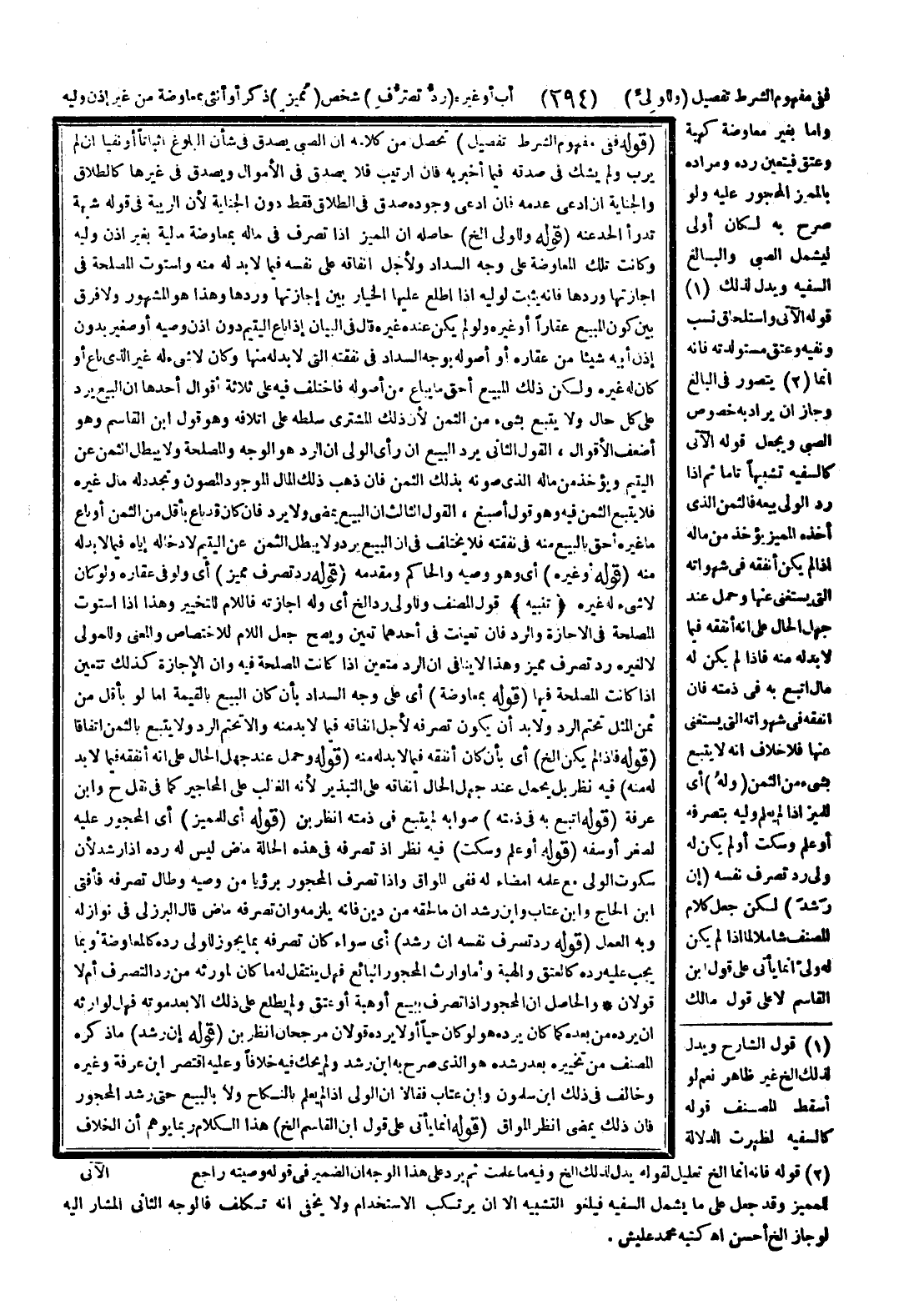 فَفِي مَفْهُومِ الشَّرْطِ تَفْصِيلٌ (وَلِلْوَلِيِّ) أَبٍ أَوْ غَيْرِهِ (رَدُّ تَصَرُّفِ) شَخْصٍ (مُمَيِّزٍ) ذَكَرٍ أَوْ أُنْثَى بِمُعَاوَضَةٍ مِنْ غَيْرِ إذْنِ وَلِيِّهِ وَأَمَّا بِغَيْرِ مُعَاوَضَةٍ كَهِبَةٍ وَعِتْقٍ فَيَتَعَيَّنُ رَدُّهُ وَمُرَادُهُ بِالْمُمَيِّزِ الْمَحْجُورُ عَلَيْهِ وَلَوْ صَرَّحَ بِهِ لَكَانَ أَوْلَى لِيَشْمَلَ الصَّبِيَّ وَالْبَالِغَ السَّفِيهَ وَيَدُلُّ لِذَلِكَ قَوْلُهُ الْآتِي وَاسْتِلْحَاقِ نَسَبٍ وَنَفْيِهِ وَعِتْقِ مُسْتَوْلَدَتِهِ فَإِنَّهُ إنَّمَا يُتَصَوَّرُ فِي الْبَالِغِ وَجَازَ أَنْ يُرَادَ بِهِ خُصُوصُ الصَّبِيِّ، وَيُجْعَلُ قَوْلُهُ الْآتِي كَالسَّفِيهِ تَشْبِيهًا تَامًّا ثُمَّ إذَا رَدَّ الْوَلِيُّ بَيْعَهُ فَالثَّمَنُ الَّذِي أَخَذَهُ الْمُمَيِّزُ يُؤْخَذُ مِنْ مَالِهِ إذَا لَمْ يَكُنْ أَنْفَقَهُ فِي شَهَوَاتِهِ الَّتِي يَسْتَغْنِي عَنْهَا وَحُمِلَ عِنْدَ جَهْلِ الْحَالِ عَلَى أَنَّهُ أَنْفَقَهُ فِيمَا لَا بُدَّ لَهُ مِنْهُ فَإِذَا لَمْ يَكُنْ لَهُ مَالٌ اُتُّبِعَ بِهِ فِي ذِمَّتِهِ فَإِنْ أَنْفَقَهُ فِي شَهَوَاتِهِ الَّتِي يُسْتَغْنَى عَنْهَا فَلَا خِلَافَ أَنَّهُ لَا يُتَّبَعُ بِشَيْءٍ مِنْ الثَّمَنِ (وَلَهُ) أَيْ لِلْمُمَيِّزِ إذَا لَمْ يَعْلَمْ وَلِيُّهُ بِتَصَرُّفِهِ أَوْ عَلِمَ وَسَكَتَ أَوْ لَمْ يَكُنْ لَهُ وَلِيٌّ رَدُّ تَصَرُّفِ نَفْسِهِ (إنْ رَشَدَ) لَكِنَّ جَعْلَ كَلَامِ الْمُصَنِّفِ شَامِلًا لِمَا إذَا لَمْ يَكُنْ لَهُ وَلِيٌّ إنَّمَا يَأْتِي عَلَى قَوْلِ ابْنِ الْقَاسِمِ لَا عَلَى قَوْلِ مَالِكٍ