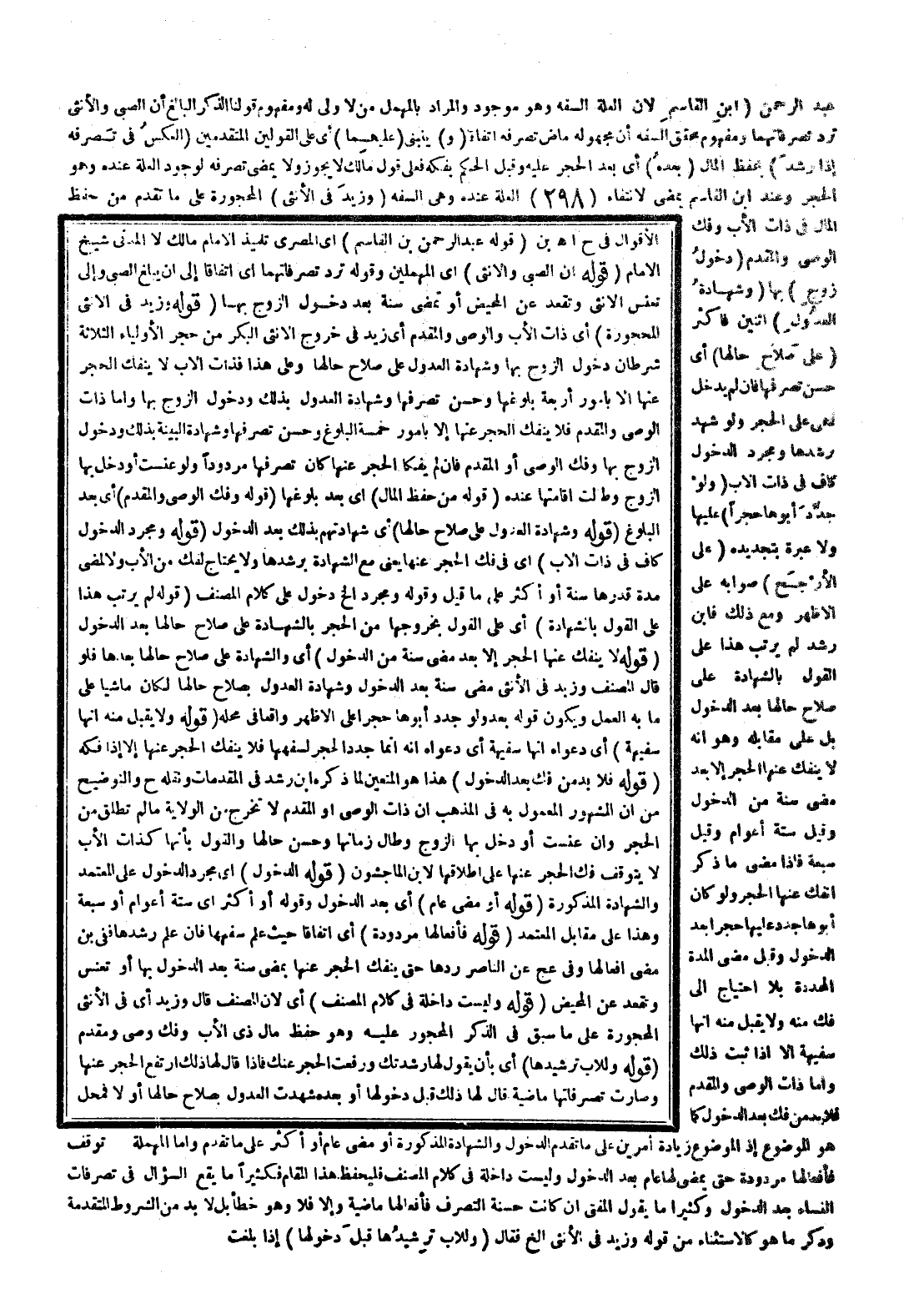 الْإِمَامِ عَبْدِ الرَّحْمَنِ بْنِ الْقَاسِمِ) ؛ لِأَنَّ الْعِلَّةَ السَّفَهُ وَهُوَ مَوْجُودٌ وَالْمُرَادُ بِالْمُهْمَلِ مَنْ لَا وَلِيَّ لَهُ وَمَفْهُومُ قَوْلِنَا: الذَّكَرُ الْبَالِغُ أَنَّ الصَّبِيَّ وَالْأُنْثَى تُرَدُّ تَصَرُّفَاتُهُمَا وَمَفْهُومُ مُحَقَّقِ السَّفَهِ أَنَّ مَجْهُولَهُ مَاضٍ تَصَرُّفُهُ اتِّفَاقًا (و) يَنْبَنِي (عَلَيْهِمَا) أَيْ عَلَى الْقَوْلَيْنِ الْمُتَقَدِّمَيْنِ (الْعَكْسُ فِي تَصَرُّفِهِ إذَا رَشَدَ) بِحِفْظِ الْمَالِ (بَعْدَهُ) أَيْ بَعْدَ الْحَجْرِ عَلَيْهِ وَقَبْلَ الْحُكْمِ بِفَكِّهِ فَعَلَى قَوْلِ مَالِكٍ لَا يَجُوزُ وَلَا يَمْضِي تَصَرُّفُهُ لِوُجُودِ الْعِلَّةِ عِنْدَهُ وَهُوَ الْحَجْرُ وَعِنْدَ ابْنِ الْقَاسِمِ يَمْضِي لِانْتِفَاءِ الْعِلَّةِ عِنْدَهُ وَهِيَ السَّفَهُ (وَزِيدَ فِي الْأُنْثَى) الْمَحْجُورَةِ عَلَى مَا تَقَدَّمَ مِنْ حِفْظِ الْمَالِ فِي ذَاتِ الْأَبِ وَفَكِّ الْوَصِيِّ وَالْمُقَدَّمِ (دُخُولُ زَوْجٍ) بِهَا (وَشَهَادَةُ الْعُدُولِ) اثْنَيْنِ فَأَكْثَرَ (عَلَى صَلَاحِ حَالِهَا) أَيْ حُسْنُ تَصَرُّفِهَا فَإِنْ لَمْ يَدْخُلْ فَهِيَ عَلَى الْحَجْرِ وَلَوْ شَهِدَ بِرُشْدِهَا وَمُجَرَّدُ الدُّخُولِ كَافٍ فِي ذَاتِ الْأَبِ (وَلَوْ جَدَّدَ أَبُوهَا حَجْرًا) عَلَيْهَا وَلَا عِبْرَةَ بِتَجْدِيدِهِ (عَلَى الْأَرْجَحِ) صَوَابُهُ عَلَى الْأَظْهَرِ وَمَعَ ذَلِكَ فَابْنُ رُشْدٍ لَمْ يُرَتَّبْ هَذَا عَلَى الْقَوْلِ بِالشَّهَادَةِ عَلَى صَلَاحِ حَالِهَا بَعْدَ الدُّخُولِ بَلْ عَلَى مُقَابِلِهِ وَهُوَ أَنَّهُ لَا يَنْفَكُّ عَنْهَا الْحَجْرُ إلَّا بَعْدَ مُضِيِّ سَنَةٍ مِنْ الدُّخُولِ وَقِيلَ سِتَّةُ أَعْوَامٍ وَقِيلَ سَبْعَةٌ فَإِذَا مَضَى مَا ذَكَرَ انْفَكَّ عَنْهَا الْحَجْرُ وَلَوْ كَانَ أَبُوهَا جَدَّدَ عَلَيْهَا حَجْرًا بَعْدَ الدُّخُولِ وَقَبْلَ مُضِيِّ الْمُدَّةِ الْمُحَدَّدَةِ بِلَا احْتِيَاجٍ إلَى فَكٍّ مِنْهُ وَلَا يُقْبَلُ مِنْهُ أَنَّهَا سَفِيهَةٌ إلَّا إذَا ثَبَتَ ذَلِكَ وَأَمَّا ذَاتُ الْوَصِيِّ وَالْمُقَدَّمِ فَلَا بُدَّ مِنْ فَكٍّ بَعْدَ الدُّخُولِ كَمَا هُوَ الْمَوْضُوعُ إذْ الْمَوْضُوعُ زِيَادَةُ أَمْرَيْنِ عَلَى مَا تَقَدَّمَ الدُّخُولُ وَالشَّهَادَةُ الْمَذْكُورَةُ أَوْ مُضِيُّ عَامٍ أَوْ أَكْثَرُ عَلَى مَا تَقَدَّمَ وَأَمَّا الْمُهْمَلَةُ فَأَفْعَالُهَا مَرْدُودَةٌ حَتَّى يَمْضِيَ لَهَا عَامٌ بَعْدَ الدُّخُولِ وَلَيْسَتْ دَاخِلَةً فِي كَلَامِ الْمُصَنِّفِ فَلْيُحْفَظْ هَذَا الْمَقَامُ فَكَثِيرًا مَا يَقَعُ السُّؤَالُ فِي تَصَرُّفَاتِ النِّسَاءِ بَعْدَ الدُّخُولِ وَكَثِيرًا مَا يَقُولُ الْمُفْتِي إنْ كَانَتْ حَسَنَةَ التَّصَرُّفِ فَأَفْعَالُهَا مَاضِيَةٌ وَإِلَّا فَلَا وَهُوَ خَطَأٌ بَلْ لَا بُدَّ مِنْ الشُّرُوطِ الْمُتَقَدِّمَةِ وَذِكْرِ مَا هُوَ كَالِاسْتِثْنَاءِ مِنْ قَوْلِهِ وَزِيدَ فِي الْأُنْثَى إلَخْ فَقَالَ (وَلِلْأَبِ تَرْشِيدُهَا قَبْلَ دُخُولِهَا) إذَا بَلَغَتْ