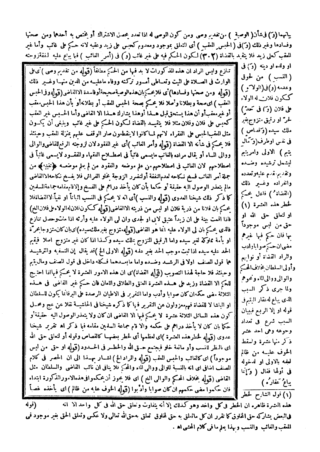 بَيَانُهُمَا (و) فِي شَأْنِ (الْوَصِيَّةِ) مِنْ تَقْدِيمِ وَصِيٍّ وَمِنْ كَوْنِ الْمُوصَى لَهُ إذَا تَعَدَّدَ يَحْصُلُ الِاشْتِرَاكُ أَوْ يَخْتَصُّ بِهِ أَحَدُهُمَا وَمِنْ صِحَّتِهَا وَفَسَادِهَا وَغَيْرِ ذَلِكَ (و) فِي (الْحَبْسِ الْمُعْقِبِ) أَيْ الْمُتَعَلِّقِ بِمَوْجُودٍ وَمَعْدُومٍ كَحَبْسٍ عَلَى زَيْدٍ وَعَقِبِهِ؛ لِأَنَّهُ حُكْمٌ عَلَى غَائِبٍ وَأَمَّا غَيْرُ الْمُعَقِّبِ كَعَلَى زَيْدٍ فَلَا يَتَقَيَّدُ بِالْقُضَاةِ لِكَوْنِ الْحُكْمِ فِيهِ عَلَى غَيْرِ غَائِبٍ (و) فِي (أَمْرِ الْغَائِبِ) فِيمَا يُبَاعُ عَلَيْهِ لِنَفَقَةِ زَوْجَتِهِ أَوْ وَلَدِهِ أَوْ دَيْنِهِ (و) فِي (النَّسَبِ) مِنْ لُحُوقٍ وَعَدَمِهِ (و) فِي (الْوَلَاءِ) كَكَوْنِ فُلَانٍ لَهُ الْوَلَاءُ عَلَى فُلَانٍ (و) فِي (حَدٍّ) لِحُرٍّ أَوْ رَقِيقٍ مُتَزَوِّجٍ بِغَيْرِ مِلْكِ سَيِّدِهِ (وَقِصَاصٍ) فِي نَفْسٍ أَوْ طَرَفٍ (وَمَالِ يَتِيمٍ) الْأَوْلَى وَأَمْرُ يَتِيمٍ لِيَشْمَلَ تَرْشِيدَهُ وَضِدَّهُ وَتَقْدِيمَ مُقَدَّمٍ عَلَيْهِ وَتَعَدُّدَهُ وَانْفِرَادَهُ وَغَيْرَ ذَلِكَ (الْقُضَاةُ) فَاعِلُ يَحْكُمُ لِخَطَرِ هَذِهِ الْعَشَرَةِ أَوْ لِتَعَلُّقِ حَقِّ اللَّهِ أَوْ حَقِّ مَنْ لَيْسَ مَوْجُودًا بِهَا فَإِنْ حَكَمَ فِيهَا غَيْرُهُمْ مَضَى إنْ حَكَمَ صَوَابًا وَأُدِّبَ وَالْمُرَادُ الْقُضَاةُ أَوْ نُوَّابُهُمْ وَأَوْلَى السُّلْطَانُ بِخِلَافِ الْمُحَكَّمِ وَالْوَالِي وَوَالِي الْمَاءِ وَنَحْوِهِمْ وَلَمَّا جَرَى ذِكْرُ السَّبَبِ الَّذِي يُبَاعُ لَهُ عَقَارُ الْيَتِيمِ فِي قَوْلِهِ أَوْ إلَّا الرُّبُعَ فَبِبَيَانِ السَّبَبِ شَرَعَ فِي تَعْدَادِ وُجُوهِهِ وَهِيَ أَحَدَ عَشَرَ ذَكَرَ مِنْهَا عَشَرَةً وَأَسْقَطَ الْخَوْفَ عَلَيْهِ مِنْ ظَالِمٍ لِعِلْمِهِ بِالْأُولَى أَوْ لِدُخُولِهِ فِي أَوَّلِهَا فَقَالَ (وَإِنَّمَا يُبَاعُ عَقَارُهُ)