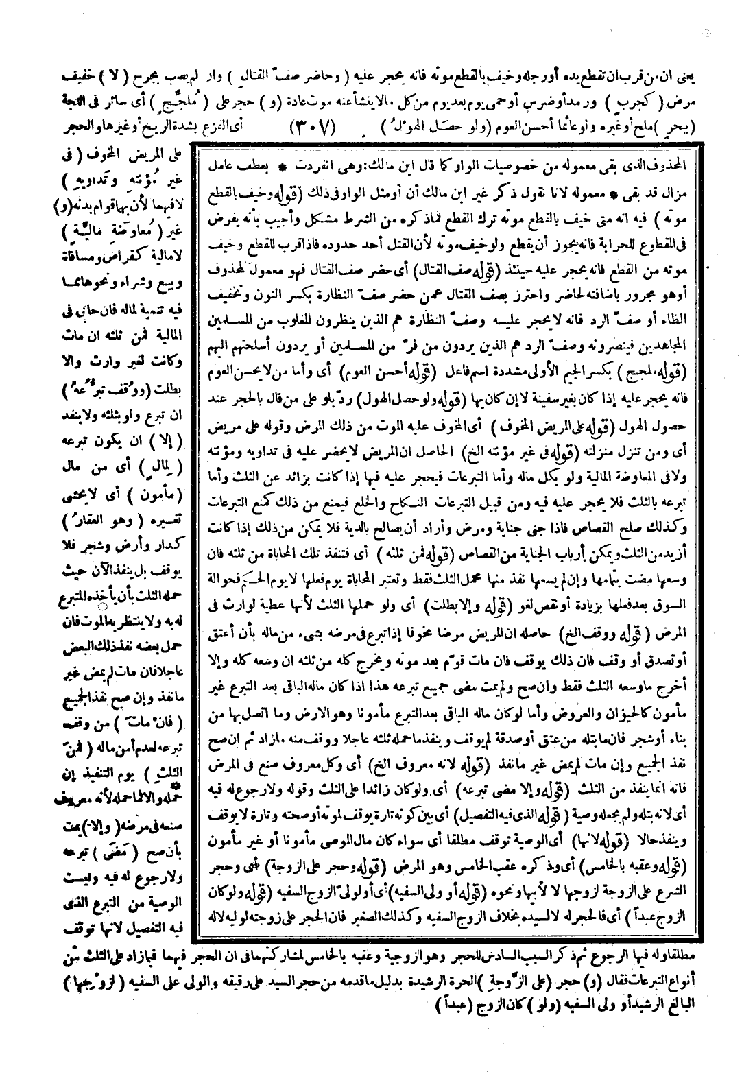 يَعْنِي أَنَّ مَنْ قَرُبَ أَنْ تُقْطَعَ يَدُهُ أَوْ رِجْلُهُ وَخِيفَ بِالْقَطْعِ مَوْتُهُ فَإِنَّهُ يُحْجَرُ عَلَيْهِ (وَحَاضِرِ صَفِّ الْقِتَالِ) وَإِنْ لَمْ يُصَبْ بِجُرْحٍ (لَا) خَفِيفِ مَرَضٍ (كَجَرَبٍ) وَرَمَدٍ أَوْ ضِرْسٍ أَوْ حُمَّى يَوْمٍ بَعْدَ يَوْمٍ مِنْ كُلِّ مَا لَا يَنْشَأُ عَنْهُ مَوْتٌ عَادَةً (و) حُجِرَ عَلَى (مُلَجِّجٍ) أَيْ سَائِرٍ فِي اللُّجَّةِ (بِبَحْرٍ) مِلْحٍ أَوْ غَيْرِهِ وَلَوْ عَائِمًا أَحْسَنَ الْعَوْمِ (وَلَوْ حَصَلَ الْهَوْلُ) أَيْ الْفَزَعُ بِشِدَّةِ الرِّيحِ أَوْ غَيْرِهَا وَالْحَجْرُ عَلَى الْمَرِيضِ الْمُخَوَّفِ (فِي غَيْرِ مُؤْنَتِهِ وَتَدَاوِيهِ) لَا فِيهِمَا؛ لِأَنَّ بِهِمَا قِوَامَ بَدَنِهِ (و) غَيْرِ (مُعَاوَضَةٍ مَالِيَّةٍ) لَا مَالِيَّةٍ كَقِرَاضٍ وَمُسَاقَاةٍ وَبَيْعٍ وَشِرَاءٍ وَنَحْوِهَا مِمَّا فِيهِ تَنْمِيَةٌ لِمَالِهِ فَإِنْ حَابَى فِي الْمَالِيَّةِ فَمِنْ ثُلُثِهِ إنْ مَاتَ وَكَانَتْ لِغَيْرِ وَارِثٍ وَإِلَّا بَطَلَتْ (وَوُقِفَ تَبَرُّعُهُ) إنْ تَبَرَّعَ وَلَوْ بِثُلُثِهِ وَلَا يَنْفُذُ (إلَّا) أَنْ يَكُونَ تَبَرُّعُهُ (لِمَالٍ) أَيْ مِنْ مَالٍ (مَأْمُونٍ) أَيْ لَا يُخْشَى تَغَيُّرُهُ (وَهُوَ الْعَقَارُ) كَدَارٍ وَأَرْضٍ وَشَجَرٍ فَلَا يُوقَفُ بَلْ يَنْفُذُ الْآنَ حَيْثُ حَمَلَهُ الثُّلُثُ بِأَنْ يَأْخُذَهُ الْمُتَبَرِّعُ لَهُ بِهِ وَلَا يَنْتَظِرُ بِهِ الْمَوْتَ فَإِنْ حَمَلَ بَعْضَهُ نَفَذَ ذَلِكَ الْبَعْضُ عَاجِلًا فَإِنْ مَاتَ لَمْ يَمْضِ غَيْرُ مَا نَفَذَ وَإِنْ صَحَّ نَفَذَ الْجَمِيعُ (فَإِنْ مَاتَ) مَنْ وُقِفَ تَبَرُّعُهُ لِعَدَمِ أَمْنِ مَالِهِ (فَمِنْ الثُّلُثِ) يَوْمَ التَّنْفِيذِ إنْ حَمَلَهُ وَإِلَّا فَمَا حَمَلَهُ؛ لِأَنَّهُ مَعْرُوفٌ صَنَعَهُ فِي مَرَضِهِ (وَإِلَّا) يَمُتْ بِأَنْ صَحَّ (مَضَى) تَبَرُّعُهُ وَلَا رُجُوعَ لَهُ فِيهِ وَلَيْسَتْ الْوَصِيَّةُ مِنْ التَّبَرُّعِ الَّذِي فِيهِ التَّفْصِيلُ؛ لِأَنَّهَا تُوقَفُ مُطْلَقًا وَلَهُ فِيهَا الرُّجُوعُ