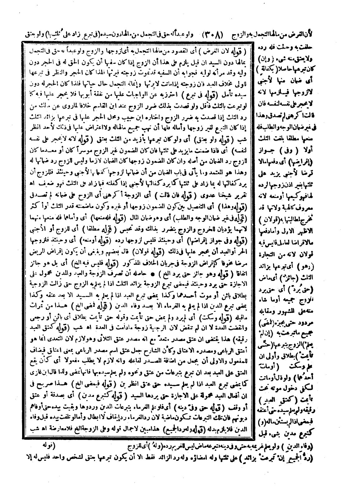 (قَوْلُهُ: وَلَوْ بِعِتْقٍ) أَيْ وَلَوْ كَانَ تَبَرُّعُهَا بِأَزْيَدَ مِنْ الثُّلُثِ بِعِتْقٍ (قَوْلُهُ لِأَنَّهُ لَا يَحْجُرُ عَلَى نَفْسِهِ لِنَفْسِهِ) أَيْ فَإِذَا ضَمِنَتْ مَا يَزِيدُ عَلَى ثُلُثِهَا فَإِنْ كَانَ الْمَضْمُونُ غَيْرَ الزَّوْجِ مُوسِرًا كَانَ أَوْ مُعْدِمًا كَانَ لِلزَّوْجِ رَدُّ الضَّمَانِ مِنْ أَصْلِهِ وَإِنْ كَانَ الْمَضْمُونُ زَوْجَهَا كَانَ الضَّمَانُ لَازِمًا وَلَيْسَ لِلزَّوْجِ رَدُّ ضَمَانِهَا لَهُ وَهَذَا هُوَ الْمُعْتَمَدُ وَمَا يَأْتِي فِي بَابِ الضَّمَانِ مِنْ أَنَّ ضَمَانَهَا لِزَوْجِهَا كَضَمَانِهَا لِأَجْنَبِيٍّ وَحِينَئِذٍ فَلِلزَّوْجِ أَنْ يَرُدَّ كَفَالَتَهَا لَهُ بِمَا زَادَ عَلَى ثُلُثِهَا كَمَا يَرُدُّ كَفَالَتَهَا لِأَجْنَبِيٍّ إذَا كَفَلَتْهُ فِيمَا زَادَ عَلَى الثُّلُثِ فَهُوَ ضَعِيفٌ اهـ تَقْرِيرُ شَيْخِنَا عَدَوِيٍّ.