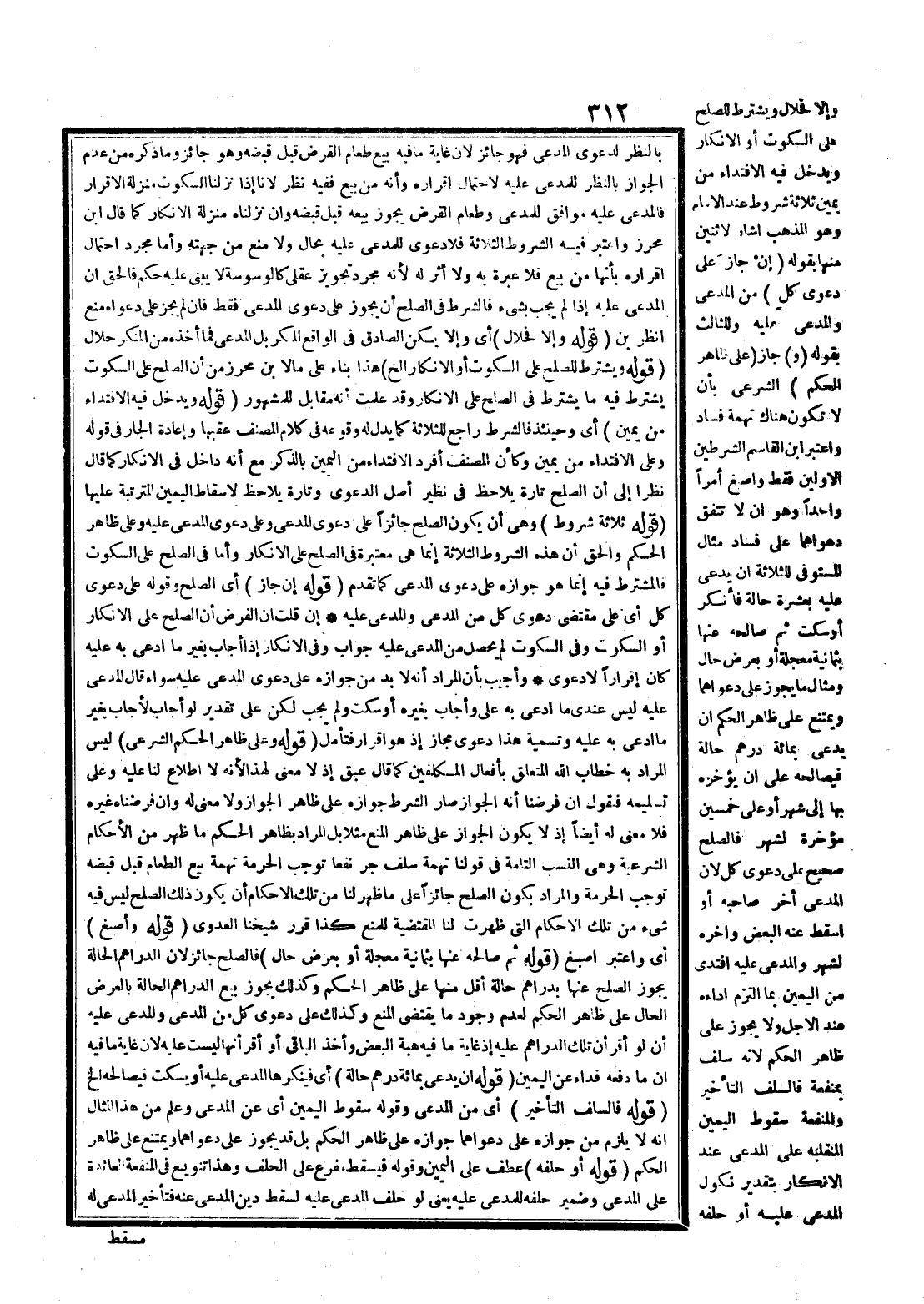 (قَوْلُهُ ثَلَاثَةُ شُرُوطٍ) وَهِيَ أَنْ يَكُونَ الصُّلْحُ جَائِزًا عَلَى دَعْوَى الْمُدَّعِي وَعَلَى دَعْوَى الْمُدَّعَى عَلَيْهِ وَعَلَى ظَاهِرِ الْحُكْمِ وَالْحَقُّ أَنَّ هَذِهِ الشُّرُوطَ الثَّلَاثَةَ إنَّمَا هِيَ مُعْتَبَرَةٌ فِي الصُّلْحِ عَلَى الْإِنْكَارِ وَأَمَّا فِي الصُّلْحِ عَلَى السُّكُوتِ فَالْمُشْتَرَطُ فِيهِ إنَّمَا هُوَ جَوَازُهُ عَلَى دَعْوَى الْمُدَّعِي كَمَا تَقَدَّمَ (قَوْلُهُ إنْ جَازَ) أَيْ الصُّلْحُ وَقَوْلُهُ عَلَى دَعْوَى كُلٍّ أَيْ عَلَى مُقْتَضَى دَعْوَى كُلٍّ مِنْ الْمُدَّعِي وَالْمُدَّعَى عَلَيْهِ إنْ قُلْت إنَّ الْفَرْضَ أَنَّ الصُّلْحَ عَلَى الْإِنْكَارِ أَوْ السُّكُوتِ وَفِي السُّكُوتِ لَمْ يَحْصُلْ مِنْ الْمُدَّعَى عَلَيْهِ جَوَابٌ وَفِي الْإِنْكَارِ إذَا أَجَابَ بِغَيْرِ مَا ادَّعَى بِهِ عَلَيْهِ كَانَ إقْرَارًا لَا دَعْوَى وَأُجِيبَ بِأَنَّ الْمُرَادَ أَنَّهُ لَا بُدَّ مِنْ جَوَازِهِ عَلَى دَعْوَى الْمُدَّعَى عَلَيْهِ سَوَاءٌ قَالَ الْمُدَّعَى عَلَيْهِ لَيْسَ عِنْدِي مَا ادَّعَى بِهِ عَلَيَّ وَأَجَابَ بِغَيْرِهِ أَوْ سَكَتَ وَلَمْ يُجِبْ لَكِنْ عَلَى تَقْدِيرِ لَوْ أَجَابَ لَأَجَابَ بِغَيْرِ مَا ادَّعَى بِهِ عَلَيْهِ وَتَسْمِيَةُ هَذَا دَعْوَى مَجَازٌ إذْ هُوَ إقْرَارٌ فَتَأَمَّلْ.