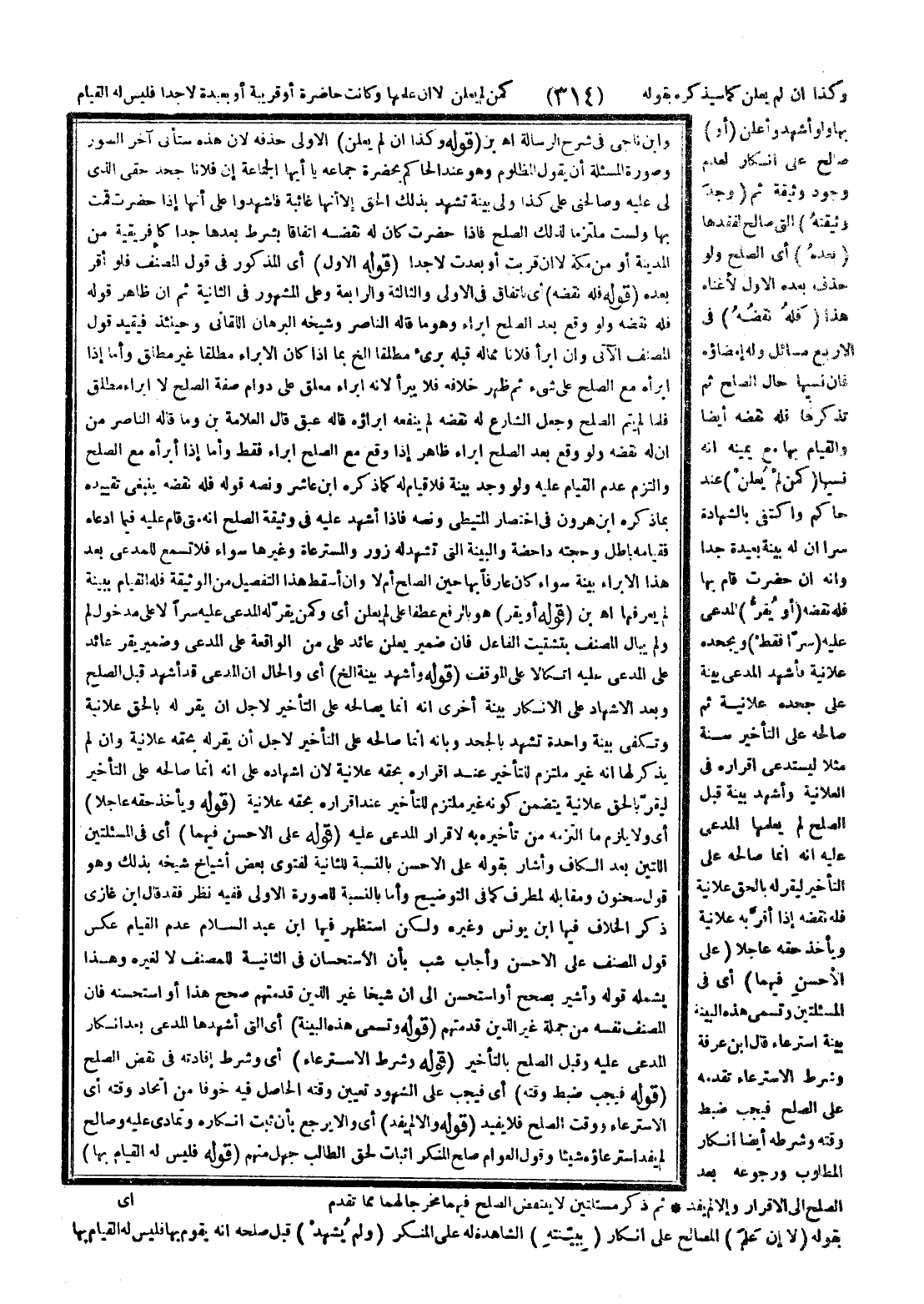 وَكَذَا إنْ لَمْ يُعْلِنْ كَمَا سَيَذْكُرُهُ بِقَوْلِهِ كَمَنْ لَمْ يُعْلِنْ لَا إنْ عَلِمَهَا وَكَانَتْ حَاضِرَةً أَوْ قَرِيبَةً أَوْ بَعِيدَةً لَا جِدًّا فَلَيْسَ لَهُ الْقِيَامُ بِهَا وَلَوْ أَشْهَدَ وَأَعْلَنَ (أَوْ) صَالَحَ عَلَى إنْكَارٍ لِعَدَمِ وُجُودِ وَثِيقَةٍ ثُمَّ (وَجَدَ وَثِيقَتَهُ) الَّتِي صَالَحَ لِفَقْدِهَا (بَعْدَهُ) أَيْ الصُّلْحِ وَلَوْ حَذَفَ بَعْدَهُ الْأَوَّلَ لَأَغْنَاهُ هَذَا (فَلَهُ نَقْضُهُ) فِي الْأَرْبَعِ مَسَائِلَ وَلَهُ إمْضَاؤُهُ فَإِنْ نَسِيَهَا حَالَ الصُّلْحِ ثُمَّ تَذَكَّرَهَا فَلَهُ نَقْضُهُ أَيْضًا وَالْقِيَامُ بِهَا مَعَ يَمِينِهِ أَنَّهُ نَسِيَهَا (كَمَنْ لَمْ يُعْلِنْ) عِنْدَ حَاكِمٍ وَاكْتَفَى بِالشَّهَادَةِ سِرًّا أَنَّ لَهُ بَيِّنَةً بَعِيدَةً جِدًّا وَأَنَّهُ إنْ حَضَرَتْ قَامَ بِهَا فَلَهُ نَقْضُهُ (أَوْ يُقِرُّ) الْمُدَّعَى عَلَيْهِ (سِرًّا فَقَطْ) وَيَجْحَدُهُ عَلَانِيَةً فَأَشْهَدَ الْمُدَّعِي بَيِّنَةً عَلَى جَحْدِهِ عَلَانِيَةً ثُمَّ صَالَحَهُ عَلَى التَّأْخِيرِ سَنَةً مَثَلًا لِيَسْتَدْعِيَ إقْرَارَهُ فِي الْعَلَانِيَةِ وَأَشْهَدَ بَيِّنَةً قَبْلَ الصُّلْحِ لَمْ يَعْلَمْهَا الْمُدَّعَى عَلَيْهِ أَنَّهُ إنَّمَا صَالَحَهُ عَلَى التَّأْخِيرِ لِيُقِرَّ لَهُ بِالْحَقِّ عَلَانِيَةً فَلَهُ نَقْضُهُ إذَا أَقَرَّ بِهِ عَلَانِيَةً وَيَأْخُذُ حَقَّهُ عَاجِلًا (عَلَى الْأَحْسَنِ فِيهِمَا) أَيْ فِي الْمَسْأَلَتَيْنِ وَتُسَمَّى هَذِهِ الْبَيِّنَةُ بَيِّنَةَ اسْتِرْعَاءٍ قَالَ ابْنُ عَرَفَةَ وَشَرْطُ الِاسْتِرْعَاءِ تَقَدُّمُهُ عَلَى الصُّلْحِ فَيَجِبُ ضَبْطُ وَقْتِهِ وَشَرْطُهُ أَيْضًا إنْكَارُ الْمَطْلُوبِ وَرُجُوعُهُ بَعْدَ الصُّلْحِ إلَى الْإِقْرَارِ وَإِلَّا لَمْ يُفِدْ