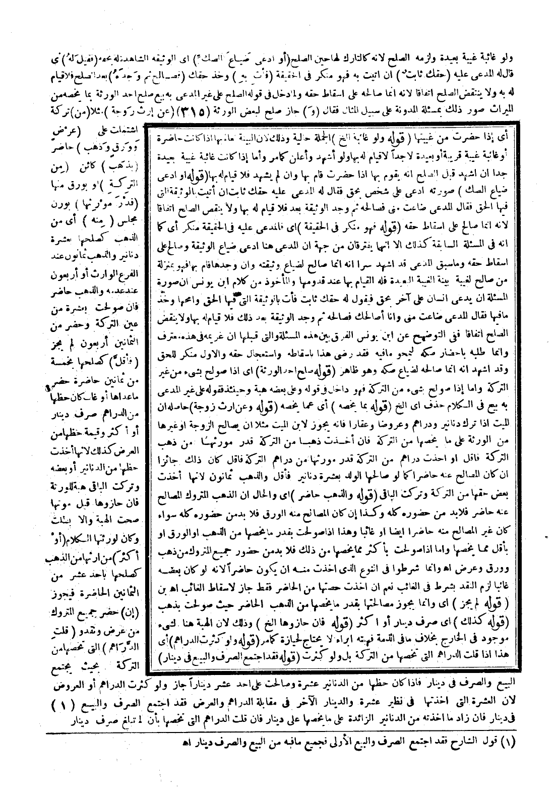 وَلَمَّا دَخَلَ فِي قَوْلِهِ: الصُّلْحُ عَلَى غَيْرِ الْمُدَّعَى بِهِ بَيْعُ صُلْحِ أَحَدِ الْوَرَثَةِ بِمَا يَخُصُّهُ مِنْ الْمِيرَاثِ صَوَّرَ ذَلِكَ بِمَسْأَلَةِ الْمُدَوَّنَةِ عَلَى سَبِيلِ الْمِثَالِ فَقَالَ (و) جَازَ صُلْحٌ لِبَعْضِ الْوَرَثَةِ (عَنْ إرْثِ زَوْجَةٍ) مَثَلًا (مِنْ) تَرِكَةٍ اشْتَمَلَتْ عَلَى (عَرَضٍ وَوَرِقٍ وَذَهَبٍ) حَاضِرٍ (بِذَهَبٍ) كَائِنٍ (مِنْ التَّرِكَةِ) أَوْ بِوَرِقٍ مِنْهَا (قَدْرَ مَوْرِثِهَا) بِوَزْنِ مَجْلِسٍ (مِنْهُ) أَيْ مِنْ الذَّهَبِ كَصُلْحِهَا بِعَشْرَةِ دَنَانِيرَ وَالذَّهَبُ ثَمَانُونَ عِنْدَ الْفَرْعِ الْوَارِثِ أَوْ أَرْبَعُونَ عِنْدَ عَدَمِهِ وَالذَّهَبُ حَاضِرٌ فَإِنْ صُولِحَتْ بِعَشَرَةٍ مِنْ عَيْنِ التَّرِكَةِ وَحَضَرَ مِنْ الثَّمَانِينَ أَرْبَعُونَ لَمْ يَجُزْ (فَأَقَلَّ) كَصُلْحِهَا بِخَمْسَةٍ مِنْ ثَمَانِينَ حَاضِرَةٍ حَضَرَ مَا عَدَاهَا أَوْ غَابَ كَانَ حَظُّهَا مِنْ الدَّرَاهِمِ صَرْفَ دِينَارٍ أَوْ أَكْثَرَ وَقِيمَةُ حَظِّهَا مِنْ الْعَرَضِ كَذَلِكَ؛ لِأَنَّهَا أَخَذَتْ حَظَّهَا مِنْ الدَّنَانِيرِ أَوْ بَعْضِهِ وَتَرَكَتْ الْبَاقِيَ هِبَةً لِلْوَرَثَةِ فَإِنْ حَازُوهَا قَبْلَ مَوْتِهَا صَحَّتْ الْهِبَةُ وَإِلَّا بَطَلَتْ وَكَانَ لِوَرَثَتِهَا الْكَلَامُ (أَوْ أَكْثَرَ) مِنْ إرْثِهَا مِنْ الذَّهَبِ كَصُلْحِهَا بِأَحَدَ عَشْرَ مِنْ الثَّمَانِينَ الْحَاضِرَةِ فَيَجُوزُ (إنْ) حَضَرَ جَمِيعُ الْمَتْرُوكِ مِنْ عَرَضٍ وَنَقْدٍ وَ (قَلَّتْ الدَّرَاهِمُ) الَّتِي تَخُصُّهَا مِنْ التَّرِكَةِ بِحَيْثُ يَجْتَمِعُ الْبَيْعُ وَالصَّرْفُ فِي دِينَارٍ فَإِذَا كَانَ حَظُّهَا مِنْ الدَّنَانِيرِ عَشَرَةً وَصَالَحَتْ عَلَى أَحَدَ عَشَرَ دِينَارًا جَازَ وَلَوْ كَثُرَتْ الدَّرَاهِمُ أَوْ الْعُرُوض؛ لِأَنَّ الْعَشَرَةَ الَّتِي أَخَذَتْهَا فِي نَظِيرِ عَشْرَةٍ وَالدِّينَارُ الْآخَرُ فِي مُقَابَلَةِ الدَّرَاهِمِ وَالْعَرَضِ فَقَدْ اجْتَمَعَ الصَّرْفُ وَالْبَيْعُ فِي دِينَارٍ فَإِنْ زَادَ مَا أَخَذَتْهُ مِنْ الدَّنَانِيرِ الزَّائِدَةِ عَلَى مَا يَخُصُّهَا عَلَى دِينَارٍ فَإِنْ قَلَّتْ الدَّرَاهِمُ الَّتِي تَخُصُّهَا بِأَنْ لَمْ تَبْلُغْ صَرْفَ دِينَارٍ