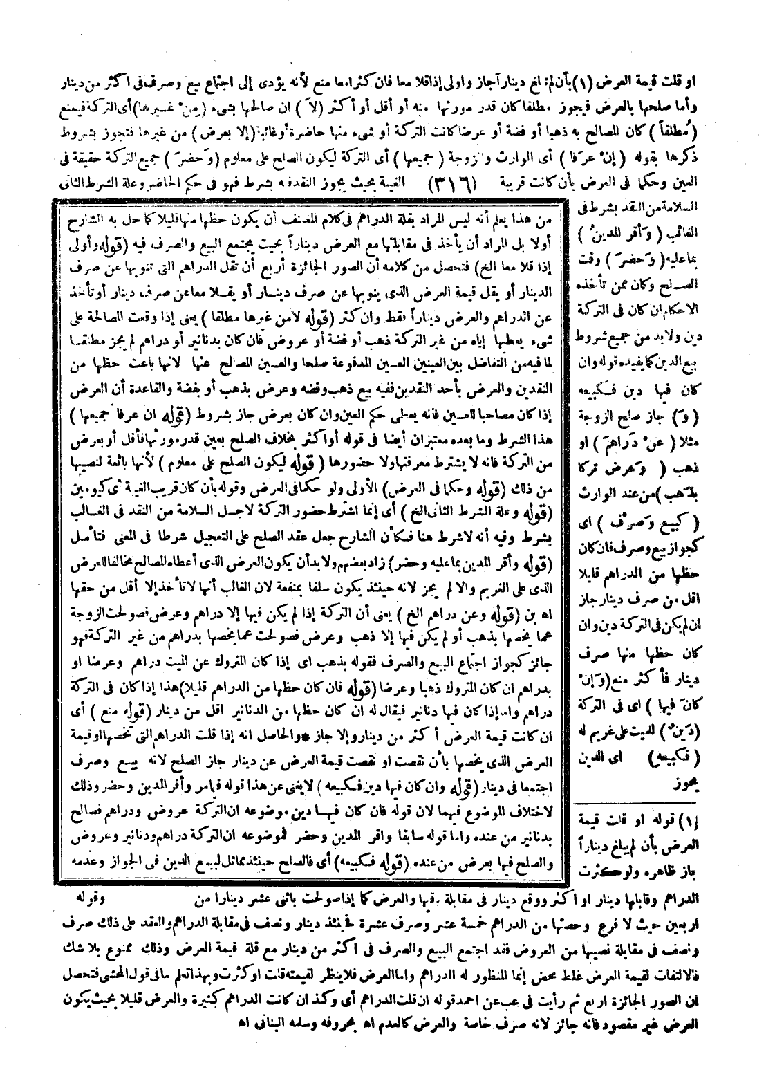 أَوْ قَلَّتْ قِيمَةُ الْعَرَضِ بِأَنْ لَمْ تَبْلُغْ دِينَارًا جَازَ وَأَوْلَى إذَا قَلَّا مَعًا فَإِنْ كَثُرَا مَعًا مُنِعَ؛ لِأَنَّهُ يُؤَدِّي إلَى اجْتِمَاعِ بَيْعٍ وَصَرْفٍ فِي أَكْثَرَ مِنْ دِينَارٍ وَأَمَّا صُلْحُهَا بِالْعَرَضِ فَيَجُوزُ مُطْلَقًا كَانَ قَدْرَ مُوَرَّثِهَا مِنْهُ أَوْ أَقَلَّ أَوْ أَكْثَرَ (لَا) إنْ صَالَحَهَا بِشَيْءٍ (مِنْ غَيْرِهَا) أَيْ التَّرِكَةِ فَيُمْنَعُ (مُطْلَقًا) كَانَ الْمُصَالَحُ بِهِ ذَهَبًا أَوْ فِضَّةً أَوْ عَرَضًا كَانَتْ التَّرِكَةُ أَوْ شَيْءٌ مِنْهَا حَاضِرَةً أَوْ غَائِبَةً (إلَّا بِعَرَضٍ) مِنْ غَيْرِهَا فَتَجُوزُ بِشُرُوطٍ ذَكَرَهَا بِقَوْلِهِ (إنْ عَرَفَا) أَيْ الْوَارِثُ وَالزَّوْجَةُ (جَمِيعَهَا) أَيْ التَّرِكَةِ لِيَكُونَ الصُّلْحُ عَلَى مَعْلُومٍ (وَحَضَرَ) جَمِيعُ التَّرِكَةِ حَقِيقَةً فِي الْعَيْنِ وَحُكْمًا فِي الْعَرْضِ بِأَنْ كَانَتْ قَرِيبَةَ الْغَيْبَةِ بِحَيْثُ يَجُوزُ النَّقْدُ فِيهِ بِشَرْطٍ فَهُوَ فِي حُكْمِ الْحَاضِرِ وَعِلَّةُ الشَّرْطِ الثَّانِي السَّلَامَةُ مِنْ النَّقْدِ بِشَرْطٍ فِي الْغَائِبِ (وَأَقَرَّ الْمَدِينُ) بِمَا عَلَيْهِ (وَحَضَرَ) وَقْتُ الصُّلْحِ وَكَانَ مِمَّنْ تَأْخُذُهُ الْأَحْكَامُ إنْ كَانَ فِي التَّرِكَةِ دَيْنٌ وَلَا بُدَّ مِنْ جَمِيعِ شُرُوطِ بَيْعِ الدَّيْنِ كَمَا يُفِيدُهُ قَوْلُهُ وَإِنْ كَانَ دَيْنٌ فَكَبَيْعِهِ (و) جَازَ صُلْحُ الزَّوْجَةِ مَثَلًا (عَنْ دَرَاهِمَ) أَوْ ذَهَبٍ (وَعَرَضٍ تُرِكَا بِذَهَبٍ) مِنْ عِنْدِ الْوَارِثِ (كَبَيْعٍ وَصَرْفٍ) أَيْ كَجَوَازِ بَيْعٍ وَصَرْفٍ فَإِنْ كَانَ حَظُّهَا مِنْ الدَّرَاهِمِ قَلِيلًا أَقَلَّ مِنْ صَرْفِ دِينَارٍ جَازَ إنْ لَمْ يَكُنْ فِي التَّرِكَةِ دَيْنٌ وَإِنْ كَانَ حَظُّهَا مِنْهَا صَرْفَ دِينَارٍ فَأَكْثَرَ مُنِعَ (وَإِنْ كَانَ فِيهَا) أَيْ فِي التَّرِكَةِ (دَيْنٌ) لِلْمَيِّتِ عَلَى غَرِيمٍ لَهُ (فَكَبَيْعِهِ) أَيْ الدَّيْنِ يَجُوزُ