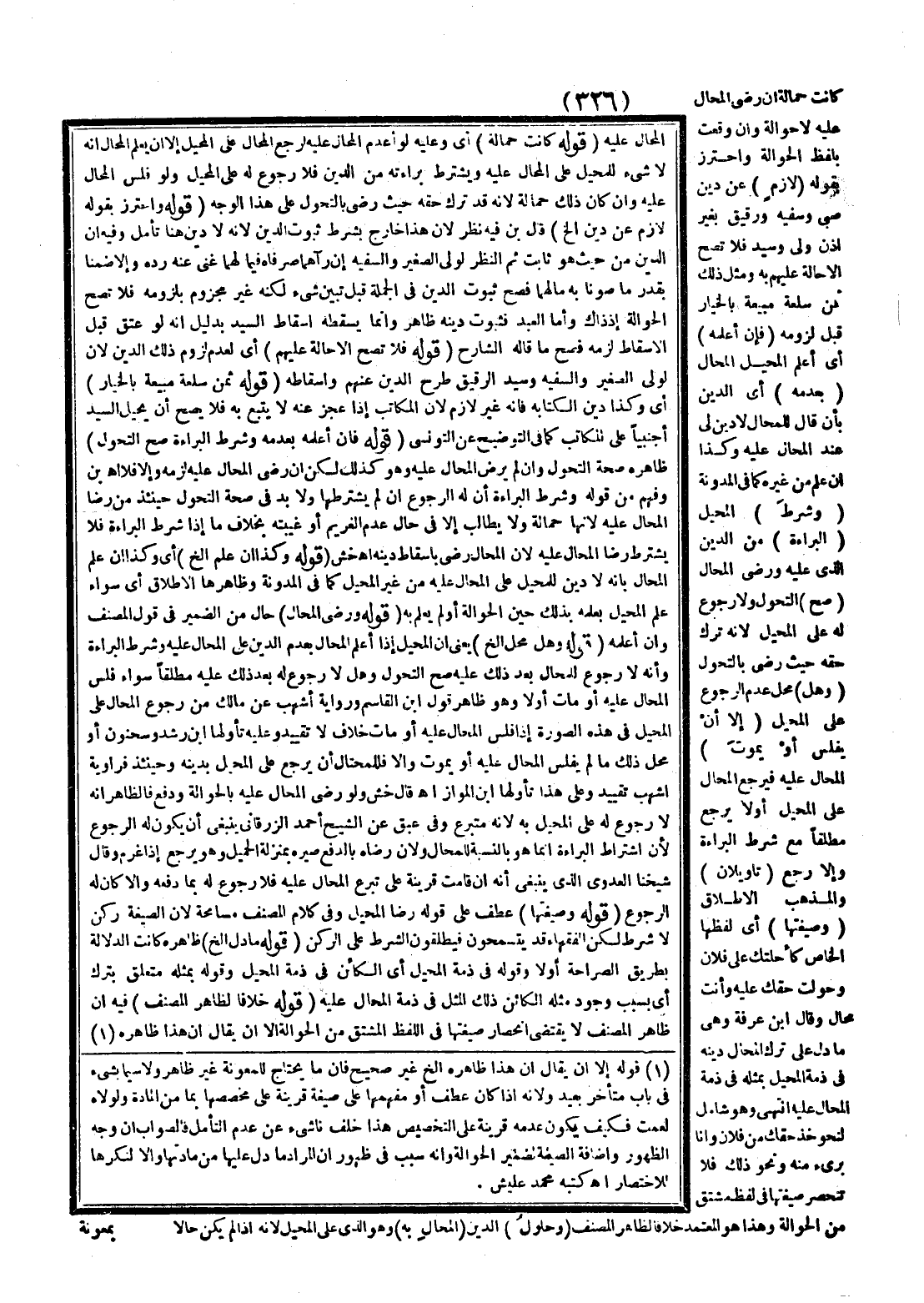 كَانَتْ حَمَالَةً إنْ رَضِيَ الْمُحَالُ عَلَيْهِ لَا حَوَالَةً وَإِنْ وَقَعَتْ بِلَفْظِ الْحَوَالَةِ وَاحْتَرَزَ بِقَوْلِهِ (لَازِمٍ) عَنْ دَيْنِ صَبِيٍّ وَسَفِيهٍ وَرَقِيقٍ بِغَيْرِ إذْنِ وَلِيٍّ وَسَيِّدٍ فَلَا تَصِحُّ الْإِحَالَةُ عَلَيْهِمْ بِهِ وَمِثْلُ ذَلِكَ ثَمَنُ سِلْعَةٍ مَبِيعَةٍ بِالْخِيَارِ قَبْلَ لُزُومِهِ (فَإِنْ أَعْلَمَهُ) أَيْ أَعْلَمَ الْمُحِيلُ الْمُحَالَ (بِعَدَمِهِ) أَيْ الدَّيْنِ بِأَنْ قَالَ لِلْمُحَالِ لَا دَيْنَ لِي عِنْدَ الْمُحَالِ عَلَيْهِ وَكَذَا إنْ عَلِمَ مِنْ غَيْرِهِ كَمَا فِي الْمُدَوَّنَةِ (وَشَرَطَ) الْمُحِيلِ (الْبَرَاءَةَ) مِنْ الدَّيْنِ الَّذِي عَلَيْهِ وَرَضِيَ الْمُحَالُ (صَحَّ) التَّحَوُّلُ وَلَا رُجُوعَ لَهُ عَلَى الْمُحِيلِ؛ لِأَنَّهُ تَرَكَ حَقَّهُ حَيْثُ رَضِيَ بِالتَّحَوُّلِ (وَهَلْ) مَحَلُّ عَدَمِ الرُّجُوعِ عَلَى الْمُحِيلِ (إلَّا أَنْ يَفْلَسُ أَوْ يَمُوتَ) الْمُحَالُ عَلَيْهِ فَيَرْجِعُ الْمُحَالُ عَلَى الْمُحِيلِ أَوْ لَا يَرْجِعُ مُطْلَقًا مَعَ شَرْطِ الْبَرَاءَةِ وَإِلَّا رَجَعَ (تَأْوِيلَانِ) وَالْمَذْهَبُ الْإِطْلَاقُ