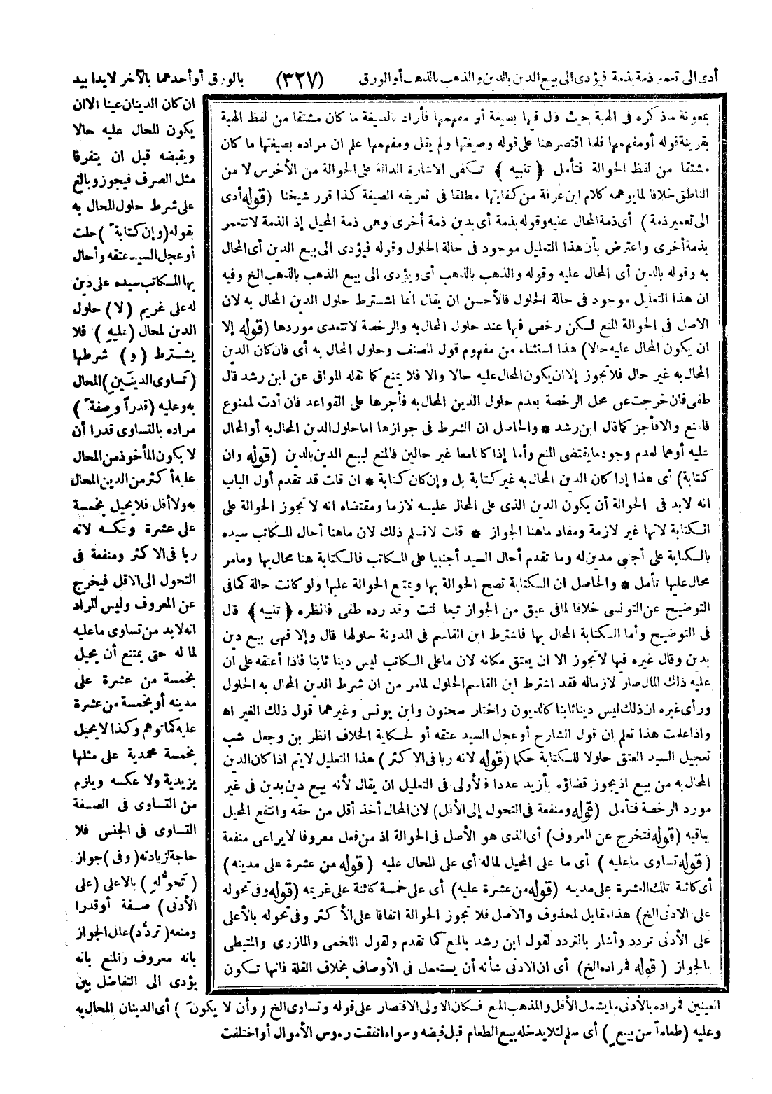 أَدَّى إلَى تَعْمِيرِ ذِمَّةٍ بِذِمَّةٍ فَيُؤَدِّي إلَى بَيْعِ الدَّيْنِ بِالدَّيْنِ وَالذَّهَبِ بِالذَّهَبِ أَوْ الْوَرِقِ بِالْوَرِقِ أَوْ أَحَدِهِمَا بِالْآخِرِ لَا يَدًا بِيَدٍ إنْ كَانَ الدَّيْنَانِ عَيْنًا إلَّا أَنْ يَكُونَ الْمُحَالُ عَلَيْهِ حَالًّا وَيَقْبِضُهُ قَبْلَ أَنْ يَتَفَرَّقَا مِثْلَ الصَّرْفِ فَيَجُوزُ وَبَالَغَ عَلَى شَرْطِ حُلُولِ الْمُحَالِ بِهِ بِقَوْلِهِ (وَإِنْ كِتَابَةً) حَلَّتْ أَوْ عَجَّلَ السَّيِّدُ عِتْقَهُ وَأَحَالَ بِهَا الْمُكَاتَبُ سَيِّدَهُ عَلَى دَيْنٍ لَهُ عَلَى غَرِيمٍ (لَا) حُلُولَ الدَّيْنِ لِمُحَالٍ (عَلَيْهِ) فَلَا يُشْتَرَطُ