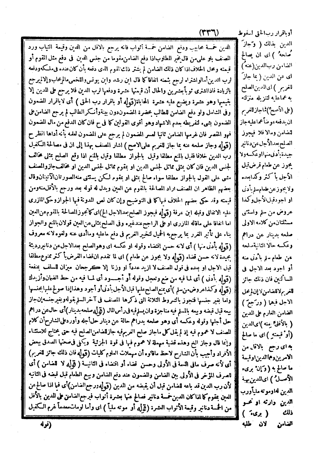 ـــــــــــــــــــــــــــــQالدَّيْنُ خَمْسَةَ مَحَابِيبَ وَدَفَعَ الضَّامِنُ خَمْسَةَ أَثْوَابٍ فَإِنَّهُ يَرْجِعُ بِالْأَقَلِّ مِنْ الدَّيْنِ وَقِيمَةِ الثِّيَابِ وَرَدَّ الْمُصَنِّفُ بِلَوْ عَلَى مَنْ قَالَ يُخَيَّرُ الْمَطْلُوبُ إذَا دَفَعَ الضَّامِنُ مُقَوَّمًا مِنْ جِنْسِ الدَّيْنِ فِي دَفْعِ مِثْلِ الْمُقَوَّمِ أَوْ قِيمَتِهِ وَمَحَلُّ الْخِلَافِ إذَا كَانَ ذَلِكَ الضَّامِنُ لَمْ يَشْتَرِ ذَلِكَ الْمُقَوَّمَ الَّذِي دَفَعَهُ بِأَنْ كَانَ عِنْدَهُ فِي مِلْكِهِ وَدَفَعَهُ لِرَبِّ الدَّيْنِ أَمَّا لَوْ اشْتَرَاهُ لَرَجَعَ بِثَمَنِهِ اتِّفَاقًا كَمَا قَالَ ابْنُ رُشْدٍ وَابْنُ يُونُسَ وَاللَّخْمِيُّ مَا لَمْ يُحَابِ وَإِلَّا لَمْ يَرْجِعْ بِالزِّيَادَةِ فَإِذَا اشْتَرَى ثَوْبًا بِعِشْرِينَ وَالْحَالُ أَنَّ قِيمَتَهَا عَشَرَةٌ وَدَفَعَهَا لِرَبِّ الدَّيْنِ فَلَا يَرْجِعُ عَلَى الْمَدِينِ إلَّا بِقَيِّمِيهَا وَهُوَ عَشَرَةٌ وَيَضِيعُ عَلَيْهِ عَشَرَةُ الْمُحَابَاةِ.
