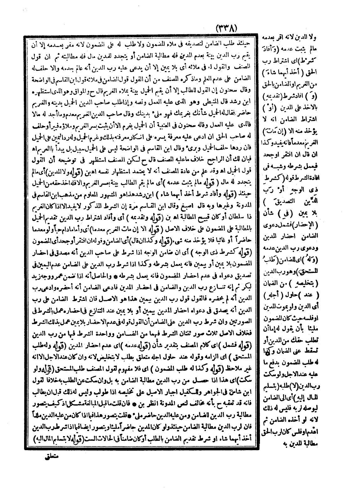 ـــــــــــــــــــــــــــــQحِينَئِذٍ طَلَبُ الضَّامِنِ لِتَصْدِيقِهِ فِي مَلَاءِ الْمَضْمُونِ وَلَا طَلَبَ لَهُ عَلَى الْمَضْمُونِ لِأَنَّهُ مُقِرٌّ بِعَدَمِهِ إلَّا أَنْ يُقِيمَ رَبُّ الدَّيْنِ بَيِّنَةً بِعَدَمِ الْمَدِينِ فَلَهُ مُطَالَبَةُ الضَّامِنِ أَوْ يَتَجَدَّدَ لِلْمَدِينِ مَالٌ فَلَهُ مُطَالَبَتُهُ ثُمَّ إنَّ قَوْلَ الْمُصَنِّفِ وَالْقَوْلُ لَهُ فِي مَلَائِهِ أَيْ بِلَا يَمِينٍ إلَّا أَنْ يَدَّعِيَ عَلَيْهِ رَبُّ الدَّيْنِ أَنَّهُ عَالِمٌ بِعَدَمِهِ وَإِلَّا حَلَفَ لَهُ الضَّامِنُ عَلَى عَدَمِ الْعِلْمِ وَمَا ذَكَرَهُ الْمُصَنِّفُ مِنْ أَنَّ الْقَوْلَ قَوْلُ الضَّامِنِ فِي مَلَائِهِ قَوْلُ ابْنِ الْقَاسِمِ فِي الْوَاضِحَةِ وَقَالَ سَحْنُونٌ إنَّ الْقَوْلَ لِلطَّالِبِ إلَّا أَنْ يُقِيمَ الْحَمِيلُ بَيِّنَةً بِمَلَاءِ الْغَرِيمِ قَالَ ح وَالْمَوَّاقُ وَهُوَ الَّذِي اسْتَظْهَرَهُ ابْنُ رُشْدٍ قَالَ الْمُتَيْطِيُّ وَهُوَ الَّذِي عَلَيْهِ الْعَمَلُ وَنَصُّهُ وَإِذَا طَلَبَ صَاحِبُ الدَّيْنِ الْحَمِيلَ بِدَيْنِهِ وَالْغَرِيمُ حَاضِرٌ فَقَالَ لَهُ الْحَمِيلُ شَأْنُك بِغَرِيمِك فَهُوَ مَلِيءٌ بِدَيْنِك وَقَالَ صَاحِبُ الدَّيْنِ الْغَرِيمُ مُعْدَمٌ وَمَا أَجِدُ لَهُ مَالًا فَاَلَّذِي عَلَيْهِ الْعَمَلُ وَقَالَهُ سَحْنُونٌ فِي الْعُتْبِيَّةِ إنَّ الْحَمِيلَ يَغْرَمُ إلَّا أَنْ يَثْبُتَ يُسْرُ الْغَرِيمِ وَمَلَاؤُهُ فَيَبْرَأَ وَحَلَفَ لَهُ صَاحِبُ الْحَقِّ إنْ ادَّعَى عَلَيْهِ مَعْرِفَةَ يُسْرِهِ عَلَى إنْكَارِ مَعْرِفَتِهِ بِذَلِكَ وَغَرِمَ الْحَمِيلُ وَلَهُ رَدُّ الْيَمِينِ عَلَى الْحَمِيلِ فَإِنْ رَدَّهَا حَلَفَ الْحَمِيلُ وَبَرِئَ وَقَالَ ابْنُ الْقَاسِمِ فِي الْوَاضِحَةِ لَيْسَ عَلَى الْحَمِيلِ سَبِيلٌ بَلْ يَبْدَأُ بِالْغَرِيمِ اهـ فَبَانَ لَك أَنَّ الرَّاجِحَ خِلَافُ مَا عَلَيْهِ الْمُصَنِّفُ قَالَ ح لَكِنَّ الْمُصَنِّفَ اسْتَظْهَرَ فِي تَوْضِيحِهِ أَنَّ الْقَوْلَ قَوْلُ الْحَمِيلِ اهـ وَقَدْ عُلِمَ مِنْ عَادَةِ الْمُصَنِّفِ أَنَّهُ لَا يَعْتَمِدُ اسْتِظْهَارَ نَفْسِهِ اهـ بْن.