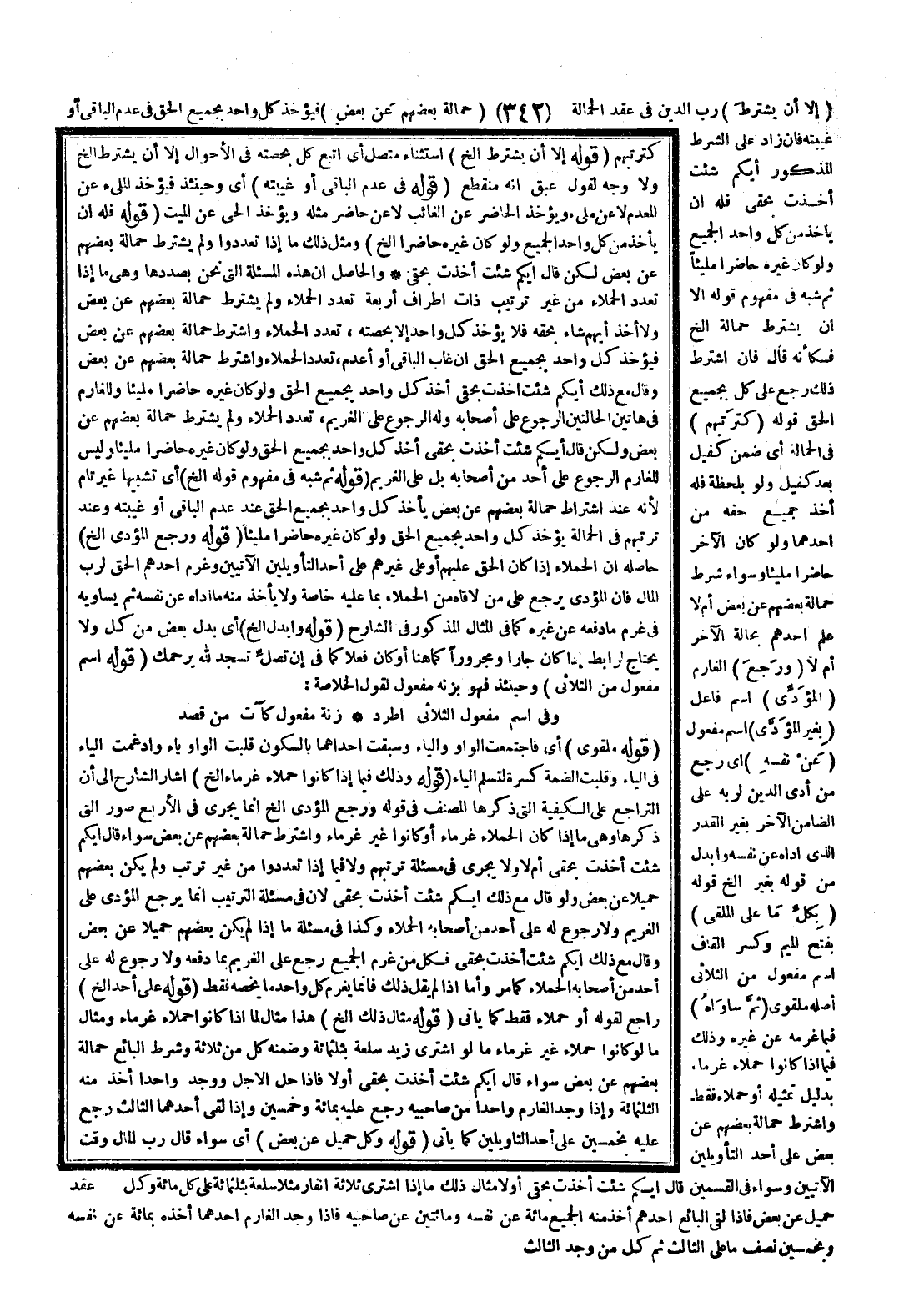 (إلَّا أَنْ يَشْتَرِطَ) رَبُّ الدَّيْنِ فِي عَقْدِ الْحَمَالَةِ (حَمَالَةَ بَعْضِهِمْ عَنْ بَعْضٍ) فَيُؤْخَذُ كُلُّ وَاحِدٍ بِجَمِيعِ الْحَقِّ فِي عَدَمِ الْبَاقِي أَوْ غَيْبَتِهِ فَإِنْ زَادَ عَلَى الشَّرْطِ الْمَذْكُورِ أَيَّكُمْ شِئْت أَخَذْت بِحَقِّي فَلَهُ أَنْ يَأْخُذَ مِنْ كُلِّ وَاحِدٍ الْجَمِيعَ وَلَوْ كَانَ غَيْرُهُ حَاضِرًا مَلِيئًا ثُمَّ شَبَّهَ فِي مَفْهُومِ قَوْلِهِ إلَّا أَنْ يَشْتَرِطَ حَمَالَةَ إلَخْ فَكَأَنَّهُ قَالَ فَإِنْ اشْتَرَطَ ذَلِكَ رَجَعَ عَلَى كُلٍّ بِجَمِيعِ الْحَقِّ قَوْلُهُ (كَتَرَتُّبِهِمْ) فِي الْحَمَالَةِ أَيْ ضَمِنَ كَفِيلٌ بَعْدَ كَفِيلٍ وَلَوْ بِلَحْظَةٍ فَلَهُ أَخْذُ جَمِيعِ حَقِّهِ مِنْ أَحَدِهِمَا وَلَوْ كَانَ الْآخَرُ حَاضِرًا مَلِيئًا وَسَوَاءٌ شَرَطَ حَمَالَةَ بَعْضِهِمْ عَنْ بَعْضٍ أَمْ لَا عَلِمَ أَحَدُهُمْ بِحَالَةِ الْآخَرِ أَمْ لَا (وَرَجَعَ) الْغَارِمُ (الْمُؤَدِّي) اسْمُ فَاعِلٍ (بِغَيْرِ الْمُؤَدَّى) اسْمُ مَفْعُولٍ (عَنْ نَفْسِهِ) أَيْ رَجَعَ مَنْ أَدَّى الدَّيْنَ لِرَبِّهِ عَلَى الضَّامِنِ الْآخَرِ بِغَيْرِ الْقَدْرِ الَّذِي أَدَّاهُ عَنْ نَفْسِهِ وَأَبْدَلَ مِنْ قَوْلِهِ بِغَيْرِ إلَخْ قَوْلَهُ (بِكُلِّ مَا عَلَى الْمَلْقِيِّ) بِفَتْحِ الْمِيمِ وَكَسْرِ الْقَافِ اسْمُ مَفْعُولٍ مِنْ الثَّلَاثِي أَصْلُهُ مَلْقُويٌ (ثُمَّ سَاوَاهُ) فِيمَا غَرِمَهُ عَنْ غَيْرِهِ وَذَلِكَ فِيمَا إذَا كَانُوا حُمَلَاءَ غُرَمَاءَ بِدَلِيلِ تَمْثِيلِهِ أَوْ حُمَلَاءَ فَقَطْ وَاشْتَرَطَ حَمَالَةَ بَعْضِهِمْ عَنْ بَعْضٍ عَلَى أَحَدِ التَّأْوِيلَيْنِ الْآتِيَيْنِ وَسَوَاءٌ فِي الْقِسْمَيْنِ قَالَ أَيَّكُمْ شِئْت أَخَذْت بِحَقِّي أَوْ لَا مِثَالُ ذَلِكَ مَا إذَا اشْتَرَى ثَلَاثَةُ أَنْفَارٍ مَثَلًا سِلْعَةً بِثَلَثِمِائَةٍ عَلَى كُلٍّ مِائَةٌ وَكُلُّ حَمِيلٍ عَنْ بَعْضٍ فَإِذَا لَقِيَ الْبَائِعُ أَحَدَهُمْ أَخَذَ مِنْهُ الْجَمِيعَ مِائَةً عَنْ نَفْسِهِ وَمِائَتَيْنِ عَنْ صَاحِبِيهِ فَإِذَا وَجَدَ الْغَارِمُ أَحَدَهُمَا أَخَذَهُ بِمِائَةٍ عَنْ نَفْسِهِ وَبِخَمْسِينَ نِصْفِ مَا عَلَى الثَّالِثِ ثُمَّ كُلُّ مَنْ وَجَدَ الثَّالِثَ