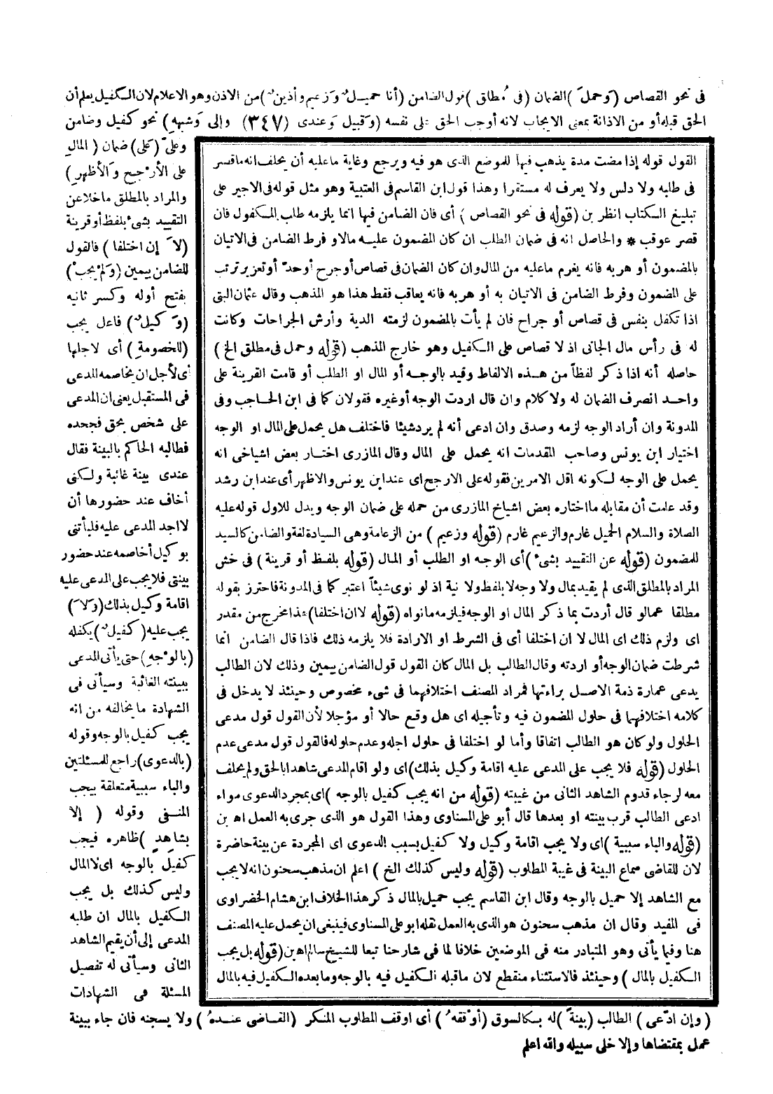 فِي نَحْوِ الْقِصَاصِ (وَحَمَلَ) الضَّمَانَ (فِي مُطْلَقِ) قَوْلِ الضَّامِنِ (أَنَا حَمِيلٌ وَزَعِيمٌ وَأَذِينٌ) مِنْ الْإِذْنِ وَهُوَ الْإِعْلَامُ؛ لِأَنَّ الْكَفِيلَ يَعْلَمُ أَنَّ الْحَقَّ قِبَلَهُ أَوْ مِنْ الْإِذَانَةِ بِمَعْنَى الْإِيجَابِ؛ لِأَنَّهُ أَوْجَبَ الْحَقَّ عَلَى نَفْسِهِ (وَقَبِيلٌ وَعِنْدِي وَإِلَيَّ، وَشَبَهُهُ) نَحْوُ كَفِيلٍ وَضَامِنٍ وَعَلَيَّ (عَلَيَّ) ضَمَانُ (الْمَالِ عَلَى الْأَرْجَحِ وَالْأَظْهَرِ) وَالْمُرَادُ بِالْمُطْلَقِ مَا خَلَا عَنْ التَّقْيِيدِ بِشَيْءٍ بِلَفْظٍ أَوْ قَرِينَةٍ (لَا إنْ اخْتَلَفَا) فَالْقَوْلُ لِلضَّامِنِ بِيَمِينٍ (وَلَمْ يَجِبْ) بِفَتْحِ أَوَّلِهِ وَكَسْرِ ثَانِيهِ (وَكِيلٌ) فَاعِلُ يَجِبُ (لِلْخُصُومَةِ) أَيْ لِأَجْلِهَا أَيْ لِأَجَلٍ أَنْ يُخَاصِمَهُ الْمُدَّعِي فِي الْمُسْتَقْبَلِ يَعْنِي أَنَّ الْمُدَّعِي عَلَى شَخْصٍ بِحَقٍّ فَجَحَدَهُ فَطَالَبَهُ الْحَاكِمُ بِالْبَيِّنَةِ فَقَالَ عِنْدِي بَيِّنَةٌ غَائِبَةٌ وَلَكِنِّي أَخَافُ عِنْدَ حُضُورِهَا أَنْ لَا أَجِدَ الْمُدَّعَى عَلَيْهِ فَلِيَأْتِنِي بِوَكِيلٍ أُخَاصِمْهُ عِنْدَ حُضُورِ بَيِّنَتِي فَلَا يَجِبُ عَلَى الْمُدَّعَى عَلَيْهِ إقَامَةُ وَكِيلٍ بِذَلِكَ (وَلَا) يَجِبُ عَلَيْهِ (كَفِيلٌ) يَكْفُلُهُ (بِالْوَجْهِ) حَتَّى يَأْتِيَ الْمُدَّعِي بِبَيِّنَتِهِ الْغَائِبَةِ وَسَيَأْتِي فِي الشَّهَادَةِ مَا يُخَالِفُهُ مِنْ أَنَّهُ يَجِبُ كَفِيلٌ بِالْوَجْهِ وَقَوْلُهُ (بِالدَّعْوَى) رَاجِعٌ لِلْمَسْأَلَتَيْنِ وَالْبَاءُ سَبَبِيَّةٌ مُتَعَلِّقَةٌ بِيَجِبُ الْمَنْفِيِّ وَقَوْلُهُ (إلَّا بِشَاهِدٍ) ظَاهِرُهُ فَيَجِبُ كَفِيلٌ بِالْوَجْهِ أَيْ لَا الْمَالُ وَلَيْسَ كَذَلِكَ بَلْ يَجِبُ الْكَفِيلُ بِالْمَالِ إنْ طَلَبَهُ الْمُدَّعِي إلَى أَنْ يُقِيمَ الشَّاهِدَ الثَّانِي وَسَيَأْتِي لَهُ تَفْصِيلُ الْمَسْأَلَةِ فِي الشَّهَادَاتِ (وَإِنْ ادَّعَى) الطَّالِبُ (بَيِّنَةً) لَهُ بِكَالسُّوقِ (أَوْقَفَهُ) أَيْ أَوْقَفَ الْمَطْلُوبَ الْمُنْكَرَ (الْقَاضِي عِنْدَهُ) وَلَا يَسْجُنُهُ فَإِنْ جَاءَ بِبَيِّنَةٍ عَمِلَ بِمُقْتَضَاهَا وَإِلَّا خَلَّى سَبِيلَهُ وَاَللَّهُ أَعْلَمُ