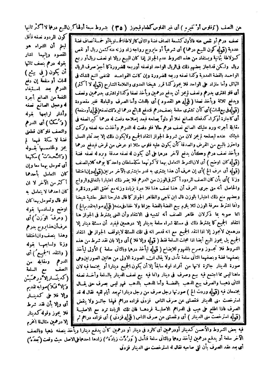 عَنْ النِّصْفِ (وَفُلُوسٍ أَوْ غَيْرِهِ) أَيْ غَيْرِ الْفُلُوسِ كَطَعَامٍ فَيَجُوزُ بِشُرُوطٍ سَبْعَةٍ: أَوَّلُهَا كَوْنُ الْمَبِيعِ دِرْهَمًا لَا أَكْثَرَ، ثَانِيهَا كَوْنُ الْمَرْدُودِ نِصْفَهُ فَأَقَلَّ لِيَعْلَمَ أَنَّ الشِّرَاءَ هُوَ الْمَقْصُودُ وَإِلَيْهِمَا أَشَارَ بِقَوْلِهِ: دِرْهَمٌ بِنِصْفِ، ثَالِثُهَا أَنْ يَكُونَ (فِي بَيْعٍ) لِذَاتٍ أَوْ مَنْفَعَةٍ إنْ دَفَعَ الدِّرْهَمَ بَعْدَ اسْتِيفَاءِ الْمَنْفَعَةِ مِنْ الصَّانِعِ أُجْرَةً لَهُ وَعَجَّلَ الصَّانِعُ نِصْفَهُ، وَأَشَارَ لِرَابِعِهَا بِقَوْلِهِ (وَسَكًّا) أَيْ الدِّرْهَمُ وَالنِّصْفُ فَلَوْ كَانَ قِطْعَتَيْ فِضَّةٍ لَا سِكَّةَ فِيهِمَا لَمْ يَجُزْ، وَلِخَامِسِهَا بِقَوْلِهِ (وَاتَّحَدَتْ) سِكَّتِهِمَا أَيْ تُعُومِلَ بِهِمَا مَعًا، وَإِنْ كَانَ التَّعَامُلُ بِأَحَدِهِمَا أَكْثَرَ مِنْ الْآخَرِ لَا إنْ كَانَ أَحَدُهُمَا لَا يَتَعَامَلُ بِهِ فَلَوْ قَالَ وَتُعُومِلَ بِهِمَا كَانَ أَوْضَحَ، وَلِسَادِسِهَا بِقَوْلِهِ (وَعُرِفَ الْوَزْنُ) أَيْ عُرِفَ أَنَّ هَذَا يَرُوجُ بِدِرْهَمٍ وَهَذَا بِنِصْفٍ، وَإِنْ اخْتَلَفَا وَزْنًا، وَلِسَابِعِهَا بِقَوْلِهِ (وَانْتَقَدَ الْجَمِيعُ) أَيْ الدِّرْهَمُ وَمُقَابِلُهُ مِنْ النِّصْفِ مَعَ السِّلْعَةِ (كَدِينَارٍ إلَّا دِرْهَمَيْنِ وَإِلَّا فَلَا) صَوَابُهُ تَقْدِيمٌ وَإِلَّا فَلَا عَلَى كَدِينَارٍ أَيْ وَإِلَّا بِأَنْ فُقِدَ شَرْطٌ فَلَا يَجُوزُ وَقَوْلُهُ كَدِينَارٍ إلَّا دِرْهَمَيْنِ مِثَالٌ لِمَا انْخَرَمَ فِيهِ بَعْضُ الشُّرُوطِ وَالْأَحْسَنُ كَدِينَارٍ أَوْ دِرْهَمَيْنِ أَيْ كَالرَّدِّ فِي دِينَارٍ أَوْ دِرْهَمَيْنِ كَأَنْ يَدْفَعَ دِينَارًا وَيَأْخُذَ بِنِصْفِهِ ذَهَبًا وَبِالنِّصْفِ الْآخَرِ سِلْعَةً أَوْ يَدْفَعَ دِرْهَمَيْنِ لِيَأْخُذَ دِرْهَمًا وَبِالثَّانِي سِلْعَةً فَتَأَمَّلْ