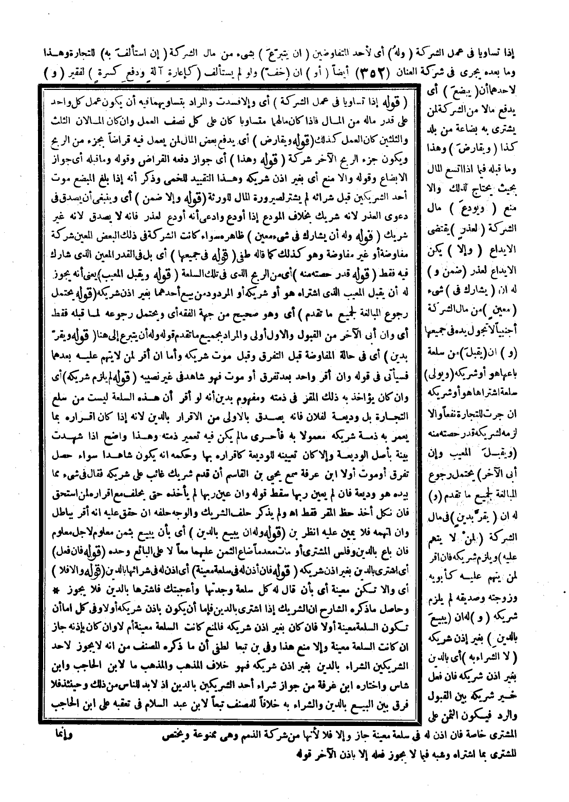 وَحَاصِلُ مَا ذَكَرَهُ الشَّارِحُ أَنَّ الشَّرِيكَ إذَا اشْتَرَى بِالدَّيْنِ فَإِمَّا أَنْ يَكُونَ بِإِذْنِ شَرِيكِهِ أَوْ لَا وَفِي كُلٍّ إمَّا أَنْ تَكُونَ السِّلْعَةُ مُعَيَّنَةً أَوْ لَا فَإِنْ كَانَ بِغَيْرِ إذْنِ شَرِيكِهِ فَالْمَنْعُ كَانَتْ السِّلْعَةُ مُعَيَّنَةً أَمْ لَا وَإِنْ كَانَ بِإِذْنِهِ جَازَ إنْ كَانَتْ السِّلْعَةُ مُعَيَّنَةً وَإِلَّا مُنِعَ هَذَا وَفِي بْن تَبَعًا لطفى أَنَّ مَا ذَكَرَهُ الْمُصَنِّفُ مِنْ أَنَّهُ لَا يَجُوزُ لِأَحَدِ الشَّرِيكَيْنِ الشِّرَاءُ بِالدَّيْنِ بِغَيْرِ إذْنِ شَرِيكِهِ فَهُوَ خِلَافُ الْمَذْهَبِ وَالْمَذْهَبُ مَا لِابْنِ الْحَاجِبِ وَابْنِ شَاسٍ اخْتَارَهُ ابْنُ عَرَفَةَ مِنْ جَوَازِ شِرَاءِ أَحَدِ الشَّرِيكَيْنِ بِالدَّيْنِ إذْ لَا بُدَّ لِلنَّاسِ مِنْ ذَلِكَ وَحِينَئِذٍ فَلَا فَرْقَ بَيْنَ الْبَيْعِ بِالدَّيْنِ وَالشِّرَاءِ بِهِ خِلَافًا لِلْمُصَنِّفِ تَبَعًا لِابْنِ عَبْدِ السَّلَامِ فِي تَعَقُّبِهِ عَلَى ابْنِ الْحَاجِبِ