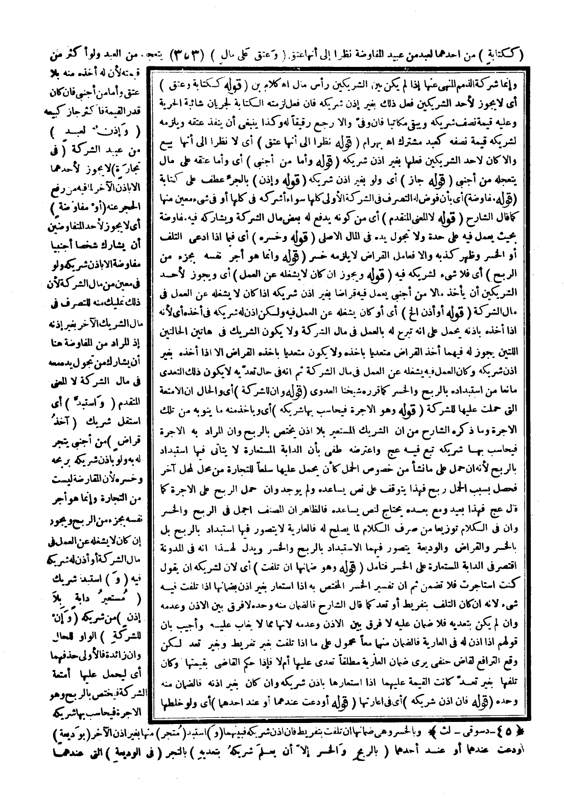 (قَوْلُهُ كَكِتَابَةٍ وَعِتْقٍ) أَيْ لَا يَجُوزُ لِأَحَدِ الشَّرِيكَيْنِ فِعْلُ ذَلِكَ بِغَيْرِ إذْنِ شَرِيكِهِ فَإِنْ فَعَلَ لَزِمَتْهُ الْكِتَابَةُ لِجَرَيَانِ شَائِبَةِ الْحُرِّيَّةِ وَعَلَيْهِ قِيمَةُ نِصْفِ شَرِيكِهِ وَيَبْقَى مُكَاتَبًا فَإِنْ وَفَّى وَإِلَّا رَجَعَ رَقِيقًا لَهُ وَكَذَا يَنْبَغِي أَنْ يَنْفُذَ عِتْقُهُ وَيَلْزَمُهُ لِشَرِيكِهِ قِيمَةُ نِصْفِهِ كَعَبْدٍ مُشْتَرَكٍ اهـ بَهْرَامُ (قَوْلُهُ نَظَرًا إلَى أَنَّهَا عِتْقٌ) أَيْ لَا نَظَرًا إلَى أَنَّهَا بَيْعٌ وَإِلَّا كَانَ لِأَحَدِ الشَّرِيكَيْنِ فِعْلُهَا بِغَيْرِ إذْنِ شَرِيكِهِ (قَوْلُهُ وَأَمَّا مِنْ أَجْنَبِيٍّ) أَيْ وَأَمَّا عِتْقُهُ عَلَى مَالٍ يَتَعَجَّلُهُ مِنْ أَجْنَبِيٍّ (قَوْلُهُ جَازَ) أَيْ وَلَوْ بِغَيْرِ إذْنِ شَرِيكِهِ (قَوْلُهُ وَإِذْنِ) بِالْجَرِّ عُطِفَ عَلَى كِتَابَةٍ (قَوْلُهُ مُفَاوَضَةً) أَيْ بِأَنْ فَوَّضَ لَهُ التَّصَرُّفَ فِي الشِّرْكَةِ الْأُولَى كُلِّهَا سَوَاءٌ أَشْرَكَهُ فِي كُلِّهَا أَوْ فِي شَيْءٍ مُعَيَّنٍ مِنْهَا كَمَا قَالَ الشَّارِحُ (قَوْلُهُ لَا الْمَعْنَى الْمُتَقَدِّمُ) أَيْ مِنْ كَوْنِهِ يَدْفَعُ لَهُ بَعْضَ مَالِ الشِّرْكَةِ وَيُشَارِكُهُ فِيهِ مُفَاوَضَةً بِحَيْثُ يَعْمَلُ فِيهِ عَلَى حِدَةٍ وَلَا تَجُولُ يَدُهُ فِي الْمَالِ الْأَصْلِيِّ (قَوْلُهُ وَخَسِرَهُ) أَيْ فِيمَا إذَا ادَّعَى التَّلَفَ أَوْ الْخُسْرَ وَظَهَرَ كَذِبُهُ وَإِلَّا فَعَامِلُ الْقِرَاضِ لَا يَلْزَمُهُ خُسْرٌ (قَوْلُهُ وَإِنَّمَا هُوَ أَجْرُ نَفْسِهِ بِجُزْءٍ مِنْ الرِّبْحِ) أَيْ فَلَا شَيْءَ لِشَرِيكِهِ فِيهِ.