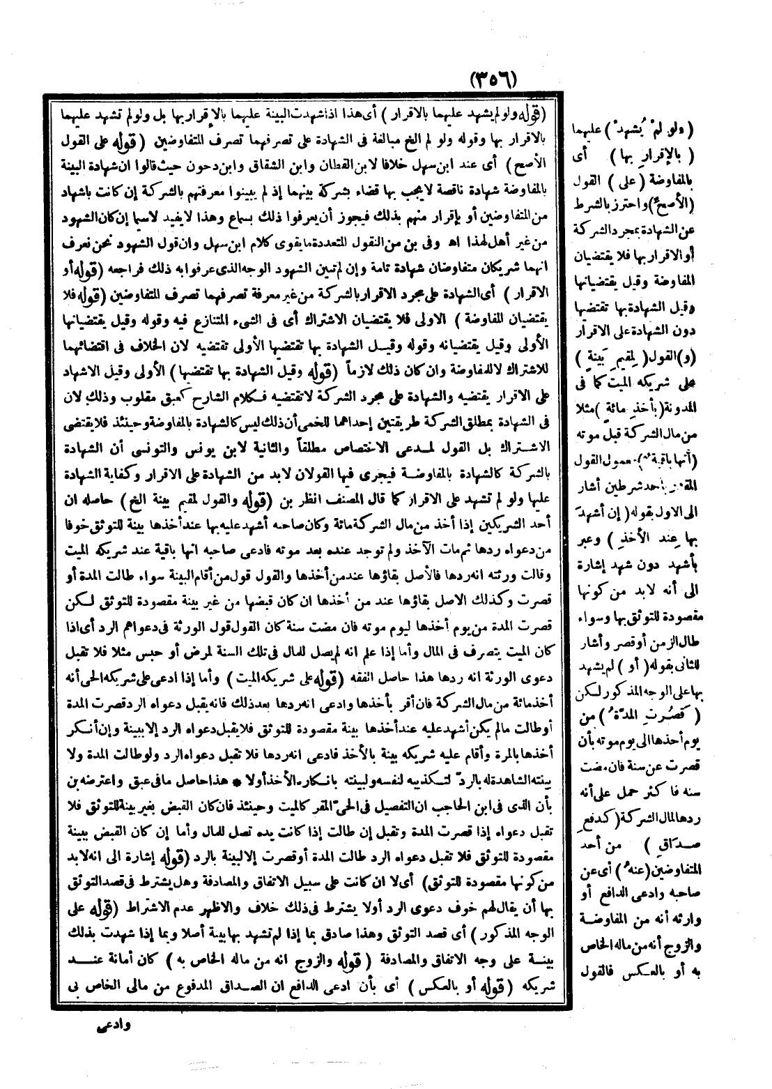 (و) الْقَوْلُ (لِمُقِيمِ بَيِّنَةٍ) عَلَى شَرِيكِهِ الْمَيِّتِ كَمَا فِي الْمُدَوَّنَةِ (بِأَخْذِ مِائَةٍ) مَثَلًا مِنْ مَالِ الشِّرْكَةِ قَبْلَ مَوْتِهِ (أَنَّهَا بَاقِيَةٌ) مَعْمُولُ الْقَوْلِ الْمُقَدَّرِ بِأَحَدِ شَرْطَيْنِ أَشَارَ إلَى الْأَوَّلِ بِقَوْلِهِ (إنْ أَشْهَدَ بِهَا عِنْدَ الْأَخْذِ) وَعَبَّرَ بِأَشْهَدَ دُونَ شَهِدَ إشَارَةً إلَى أَنَّهُ لَا بُدَّ مِنْ كَوْنِهَا مَقْصُودَةً لِلتَّوَثُّقِ بِهَا وَسَوَاءٌ طَالَ الزَّمَنُ أَوْ قَصُرَ وَأَشَارَ لِلثَّانِي بِقَوْلِهِ (أَوْ) لَمْ يَشْهَدْ بِهَا عَلَى الْوَجْهِ الْمَذْكُورِ لَكِنْ (قَصُرَتْ الْمُدَّةُ) مِنْ يَوْمِ أَخَذَهَا إلَى يَوْمِ مَوْتِهِ بِأَنْ قَصُرَتْ عَنْ سَنَةٍ، فَإِنْ مَضَتْ سَنَةٌ فَأَكْثَرَ حُمِلَ عَلَى أَنَّهُ رَدَّهَا لِمَالِ الشِّرْكَةِ (كَدَفْعِ صَدَاقٍ) مِنْ أَحَدِ الْمُتَفَاوِضِينَ (عَنْهُ) أَيْ عَنْ صَاحِبِهِ وَادَّعَى الدَّافِعُ أَوْ وَارِثُهُ أَنَّهُ مِنْ الْمُفَاوَضَةِ وَالزَّوْجُ أَنَّهُ مِنْ مَالِهِ الْخَاصِّ بِهِ أَوْ بِالْعَكْسِ فَالْقَوْلُ