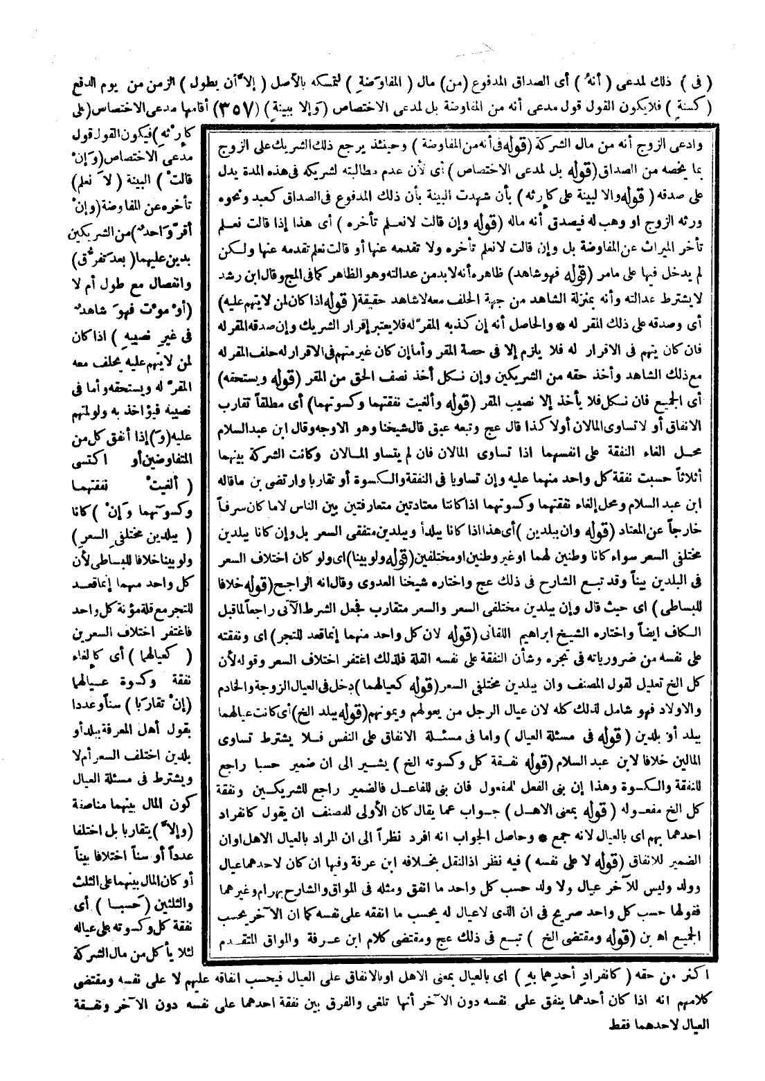 وَيُشْتَرَطُ فِي مَسْأَلَةِ الْعِيَالِ كَوْنُ الْمَالِ بَيْنَهُمَا مُنَاصَفَةً (وَإِلَّا) يَتَقَارَبَا بَلْ اخْتَلَفَا عَدَدًا أَوْ سِنًّا اخْتِلَافًا بَيِّنًا أَوْ كَانَ الْمَالُ بَيْنَهُمَا عَلَى الثُّلُثِ وَالثُّلُثَيْنِ (حُسِبَا) أَيْ نَفَقَةُ كُلٍّ وَكِسْوَتُهُ عَلَى عِيَالِهِ لِئَلَّا يَأْكُلَ مِنْ مَالِ الشِّرْكَةِ أَكْثَرَ مِنْ حَقِّهِ (كَانْفِرَادِ أَحَدِهِمَا بِهِ) أَيْ بِالْعِيَالِ بِمَعْنَى الْأَهْلِ أَوْ بِالْإِنْفَاقِ عَلَى الْعِيَالِ فَيُحْسَبُ إنْفَاقُهُ عَلَيْهِمْ لَا عَلَى نَفْسِهِ وَمُقْتَضَى كَلَامِهِمْ أَنَّهُ إذَا كَانَ أَحَدُهُمَا يُنْفِقُ عَلَى نَفْسِهِ دُونَ الْآخَرِ أَنَّهَا تُلْغَى وَالْفَرْقُ بَيْنَ نَفَقَةِ أَحَدِهِمَا عَلَى نَفْسِهِ دُونَ الْآخَرِ وَنَفَقَةِ الْعِيَالِ لِأَحَدِهِمَا فَقَطْ