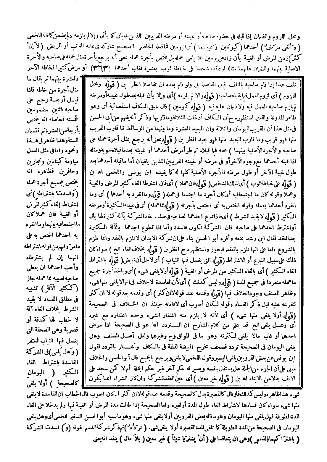 وَمَحَلُّ اللُّزُومِ وَالضَّمَانِ إذَا قَبِلَهُ فِي حُضُورِ صَاحِبِهِ أَوْ غَيْبَتِهِ أَوْ مَرَضِهِ الْقَرِيبَيْنِ اللَّذَيْنِ يُلْغِيَانِ كَمَا يَأْتِي وَإِلَّا لَمْ يَلْزَمْهُ وَلَمْ يَضْمَنْ كَمَا قَالَهُ اللَّخْمِيُّ (وَأَلْغَى مَرَضُ) أَحَدِهِمَا (كَيَوْمَيْنِ وَغَيْبَتِهِمَا) أَيْ الْيَوْمَيْنِ فَمَا فَعَلَهُ الْحَاضِرُ الصَّحِيحُ شَارَكَهُ فِي غَلَّتِهِ الْغَائِبُ أَوْ الْمَرِيضُ (لَا إنْ كَثُرَ) زَمَنُ الْمَرَضِ أَوْ الْغَيْبَةِ بِأَنْ زَادَ عَلَى يَوْمَيْنِ فَلَا يُلْغِي عَمَلَهُ بَلْ يَخْتَصُّ بِأُجْرَةِ عَمَلِهِ بِمَعْنَى أَنَّهُ يَرْجِعُ بِأُجْرَةٍ مِثْلُ عَمَلِهِ عَلَى صَاحِبِهِ وَالْأُجْرَةُ الْأَصْلِيَّةُ بَيْنَهُمَا وَالضَّمَانُ عَلَيْهِمَا مِثَالُهُ لَوْ عَاقَدَا شَخْصًا عَلَى خِيَاطَةِ ثَوْبٍ بِعَشَرَةٍ فَغَابَ أَحَدُهُمَا أَوْ مَرِضَ كَثِيرًا فَخَاطَهُ الْآخَرُ فَالْعَشَرَةُ بَيْنَهُمَا.