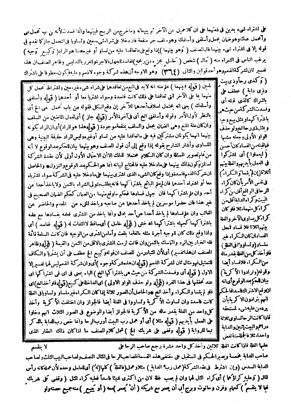 عَلَى اشْتِرَاءِ شَيْءٍ بِدَيْنٍ فِي ذِمَّتِهِمَا عَلَى أَنَّ كُلًّا حَمِيلٌ عَنْ الْآخَرِ ثُمَّ يَبِيعَانِهِ وَمَا خَرَجَ مِنْ الرِّبْحِ فَبَيْنَهُمَا، وَإِنَّمَا فَسَدَتْ؛ لِأَنَّهُ مِنْ بَابِ تَحَمَّلْ عَنِّي وَأَتَحَمَّلُ عَنْك وَهُوَ ضَمَانٌ بِجُعْلٍ، وَأَسْلِفْنِي وَأُسْلِفُك وَهُوَ سَلَفٌ جَرَّ مَنْفَعَةً، فَإِنْ دَخَلَا عَلَى شِرَاءِ شَيْءٍ مُعَيَّنٍ وَتَسَاوَيَا فِي التَّحَمُّلِ جَازَ كَمَا تَقَدَّمَ فِي قَوْلِهِ إلَّا فِي اشْتِرَاءِ شَيْءٍ بَيْنَهُمَا قَالَ الْمُصَنِّفُ (وَهُوَ بَيْنَهُمَا) إذَا وَقَعَ عَلَى مَا تَعَاقَدَا عَلَيْهِ مِنْ تَسَاوٍ أَوْ غَيْرِهِ هَذَا هُوَ الْمُرَادُ (وَكَبَيْعِ وَجِيهٍ) يَرْغَبُ النَّاسُ فِي الشِّرَاءِ مِنْهُ (مَالَ) شَخْصٍ (خَامِلٍ بِجُزْءٍ مِنْ رِبْحِهِ) فَفَاسِدٌ لِلْجَهْلِ بِالْأُجْرَةِ وَلِلْغَرَرِ بِالتَّدْلِيسِ وَظَاهِرُ الْمُصَنِّفِ أَنَّ هَذَا تَفْسِيرٌ ثَانٍ لِشِرْكَةِ الذِّمَمِ وَهُوَ أَحَدُ قَوْلَيْنِ، وَالثَّانِي وَهُوَ الْأَوْجَهُ أَنَّ هَذِهِ شِرْكَةُ وُجُوهٍ لَا ذِمَمٍ وَعَلَيْهِ فَيَكُونُ مَعْطُوفًا عَلَى بِاشْتِرَاكٍ (وَكَذِي رَحًا وَذِي بَيْتٍ وَذِي دَابَّةٍ) عَطْفٌ عَلَى بِاشْتِرَاكٍ كَاَلَّذِي قَبْلَهُ أَيْ وَفَسَدَتْ الشِّرْكَةُ مِنْ حَيْثُ هِيَ بِاشْتِرَاكِهِمَا وَبِمِثْلِ بَيْعِ وَجِيهٍ وَبِمِثْلِ ذِي رَحًا إلَخْ، وَلَوْ حَذَفَ الْوَاوَ الْأُولَى وَجَعَلَهُ مُشَبَّهًا فِيمَا قَبْلَهُ مِنْ الْفَسَادِ كَانَ أَحْسَنَ.