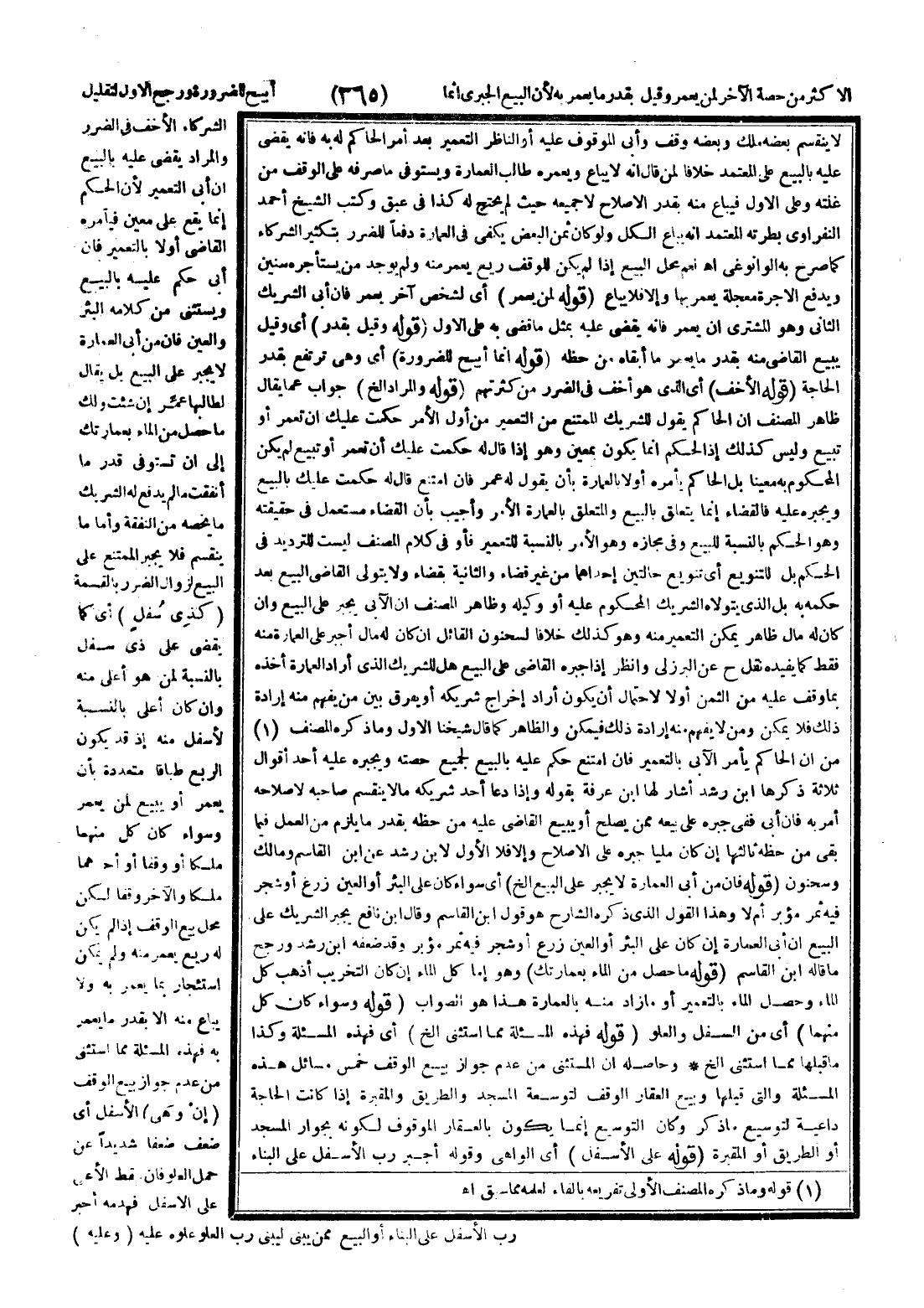 ـــــــــــــــــــــــــــــQلَا يَنْقَسِمُ بَعْضُهُ مِلْكٌ وَبَعْضُهُ وَقْفٌ وَأَبَى الْمَوْقُوفُ عَلَيْهِ أَوْ النَّاظِرُ التَّعْمِيرَ بَعْدَ أَمْرِ الْحَاكِمِ لَهُ بِهِ فَإِنَّهُ يَقْضِي عَلَيْهِ بِالْبَيْعِ عَلَى الْمُعْتَمَدِ خِلَافًا لِمَنْ قَالَ: إنَّهُ لَا يُبَاعُ وَيُعَمِّرُهُ طَالِبُ الْعِمَارَةِ وَيَسْتَوْفِي مَا صَرَفَهُ عَلَى الْوَقْفِ مِنْ غَلَّتِهِ وَعَلَى الْأَوَّلِ فَيُبَاعُ مِنْهُ بِقَدْرِ الْإِصْلَاحِ لَا جَمِيعِهِ حَيْثُ لَمْ يَحْتَجْ لَهُ كَذَا فِي عبق وَكَتَبَ الشَّيْخُ أَحْمَدُ النَّفْرَاوِيُّ بِطُرَّتِهِ الْمُعْتَمَدُ أَنَّهُ يُبَاعُ الْكُلُّ وَلَوْ كَانَ ثَمَنُ الْبَعْضِ يَكْفِي فِي الْعِمَارَةِ دَفْعًا لِلضَّرَرِ بِتَكْثِيرِ الشُّرَكَاءِ كَمَا صَرَّحَ بِهِ الْوَانُّوغِيُّ اهـ. نَعَمْ مَحَلُّ الْبَيْعِ إذَا لَمْ يَكُنْ لِلْوَقْفِ رِيعٌ يُعَمَّرُ مِنْهُ وَلَمْ يُوجَدْ مَنْ يَسْتَأْجِرُهُ سِنِينَ وَيَدْفَعُ الْأُجْرَةَ مُعَجَّلَةً يُعَمِّرُ بِهَا وَإِلَّا فَلَا يُبَاعُ.