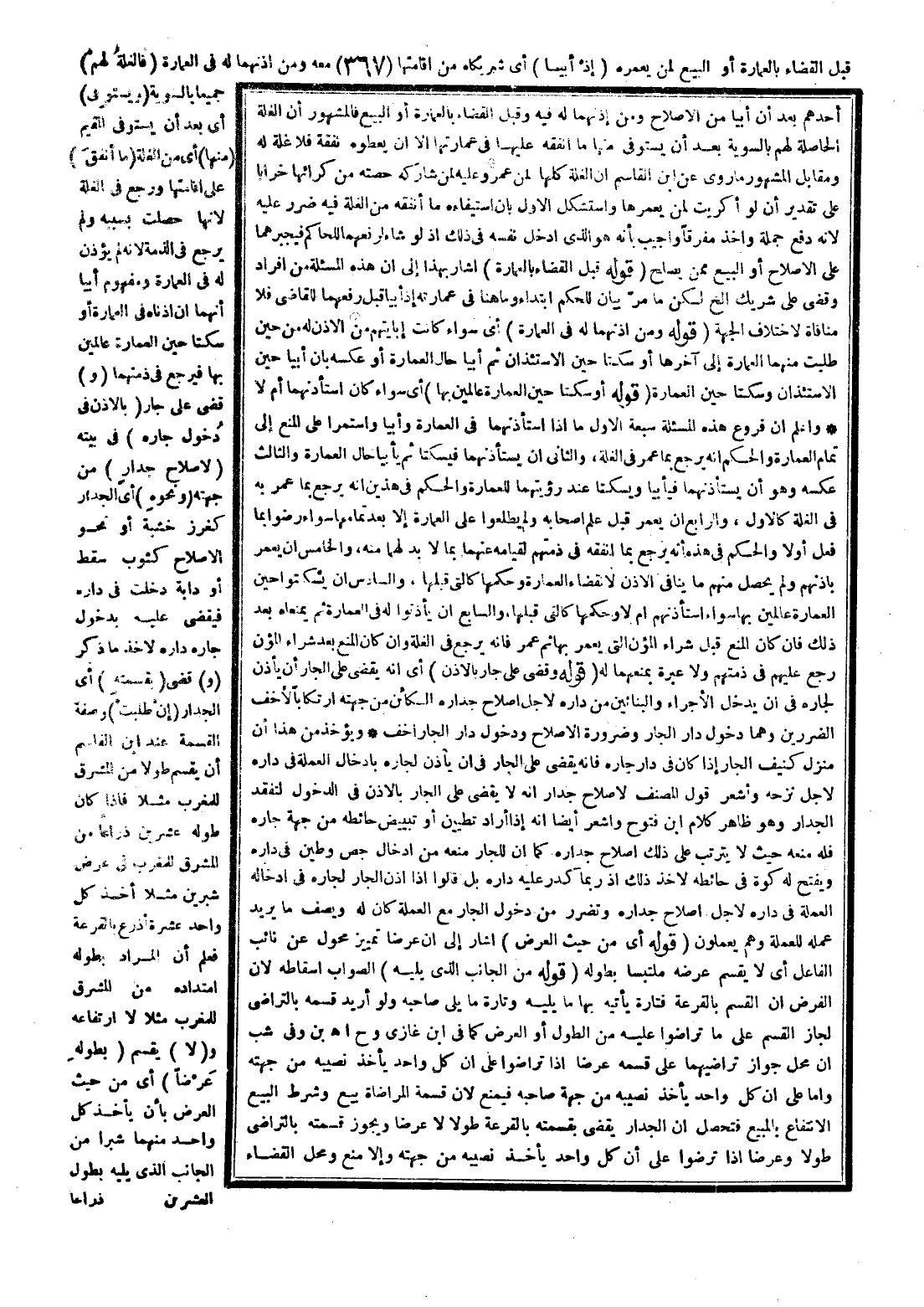 (و) قُضِيَ عَلَى جَارٍ (بِالْإِذْنِ فِي دُخُولِ جَارِهِ) فِي بَيْتِهِ (لِإِصْلَاحِ جِدَارٍ) مِنْ جِهَتِهِ (وَنَحْوَهُ) أَيْ الْجِدَارِ كَغَرْزِ خَشَبَةٍ أَوْ نَحْوِ الْإِصْلَاحِ كَثَوْبٍ سَقَطَ أَوْ دَابَّةٍ دَخَلَتْ فِي دَارِهِ فَيُقْضَى عَلَيْهِ بِدُخُولِ جَارِهِ دَارِهِ لِأَخْذِ مَا ذُكِرَ (و) قُضِيَ (بِقِسْمَتِهِ) أَيْ الْجِدَارِ (إنْ طُلِبَتْ) وَصِفَةُ الْقِسْمَةِ عِنْدَ ابْنِ الْقَاسِمِ أَنْ يَقْسِمَ طُولًا مِنْ الْمَشْرِقِ لِلْمَغْرِبِ مَثَلًا فَإِذَا كَانَ طُولُهُ عِشْرِينَ ذِرَاعًا مِنْ الْمَشْرِقِ لِلْمَغْرِبِ فِي عَرْضِ شِبْرَيْنِ مَثَلًا أَخَذَ كُلُّ وَاحِدٍ عَشَرَةَ أَذْرُعٍ بِالْقُرْعَةِ فَعُلِمَ أَنَّ الْمُرَادَ بِطُولِهِ امْتِدَادُهُ مِنْ الْمَشْرِقِ لِلْمَغْرِبِ مَثَلًا لَا ارْتِفَاعُهُ و (لَا) يُقْسَمُ (بِطُولِهِ عَرْضًا) أَيْ مِنْ حَيْثُ الْعَرْضُ بِأَنْ يَأْخُذَ كُلُّ وَاحِدٍ مِنْهُمَا شِبْرًا مِنْ الْجَانِبِ الَّذِي يَلِيهِ بِطُولِ الْعِشْرِينَ ذِرَاعًا