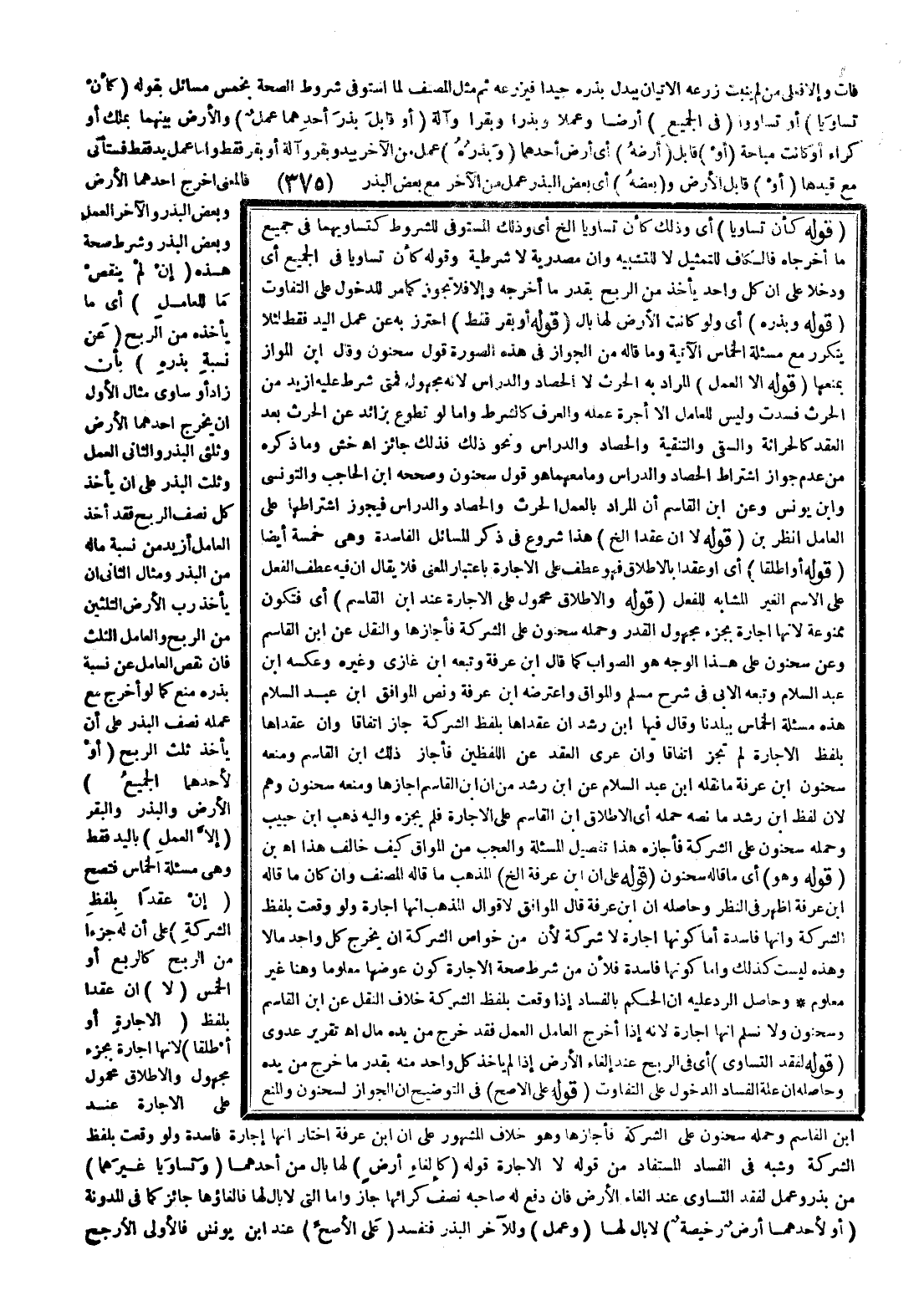 فَاتَ وَإِلَّا فَعَلَى مَنْ لَمْ يَنْبُتْ زَرْعُهُ الْإِتْيَانُ بِبَدَلِ بَذْرِهِ جَيِّدًا فَيَزْرَعُهُ ثُمَّ مَثَّلَ الْمُصَنِّفُ لِمَا اسْتَوْفَى شُرُوطَ الصِّحَّةِ بِخَمْسِ مَسَائِلَ بِقَوْلِهِ (كَأَنْ تَسَاوَيَا) أَوْ تَسَاوَوْا (فِي الْجَمِيعِ) أَرْضًا وَعَمَلًا وَبَذْرًا وَبَقَرًا وَآلَةً (أَوْ قَابَلَ بَذْرُ أَحَدِهِمَا عَمَلٌ) وَالْأَرْضُ بَيْنَهُمَا بِمِلْكٍ أَوْ كِرَاءٍ أَوْ كَانَتْ مُبَاحَةً (أَوْ) قَابَلَ (أَرْضَهُ) أَيْ أَرْضَ أَحَدِهِمَا (وَبَذْرَهُ) عَمَلٌ مِنْ الْآخَرِ بِيَدٍ وَبَقَرٍ وَآلَةٍ أَوْ بَقَرٍ فَقَطْ، وَأَمَّا عَمَلُ يَدٍ فَقَطْ فَسَتَأْتِي مَعَ قَيْدِهَا (أَوْ) قَابَلَ الْأَرْضَ و (بَعْضَهُ) أَيْ بَعْضَ الْبَذْرِ عَمَلٌ مِنْ الْآخَرِ مَعَ بَعْضِ الْبَذْرِ فَالْمَعْنَى أَخْرَجَ أَحَدُهُمَا الْأَرْضَ وَبَعْضَ الْبَذْرِ وَالْآخَرُ الْعَمَلَ وَبَعْضَ الْبَذْرِ وَشَرْطُ صِحَّةِ هَذِهِ (إنْ لَمْ يَنْقُصْ مَا لِلْعَامِلِ) أَيْ مَا يَأْخُذُهُ مِنْ الرِّبْحِ (عَنْ نِسْبَةِ بَذْرِهِ) بِأَنْ زَادَ أَوْ سَاوَى مِثَالُ الْأَوَّلِ أَنْ يُخْرِجَ أَحَدُهُمَا الْأَرْضَ وَثُلُثَيْ الْبَذْرِ وَالثَّانِي الْعَمَلُ وَثُلُثُ الْبَذْرِ عَلَى أَنْ يَأْخُذَ كُلٌّ نِصْفَ الرِّبْحِ فَقَدْ أَخَذَ الْعَامِلُ أَزْيَدَ مِنْ نِسْبَةِ مَالِهِ مِنْ الْبَذْرِ وَمِثَالُ الثَّانِي أَنْ يَأْخُذَ رَبُّ الْأَرْضِ الثُّلُثَيْنِ مِنْ الرِّبْحِ وَالْعَامِلُ الثُّلُثُ.