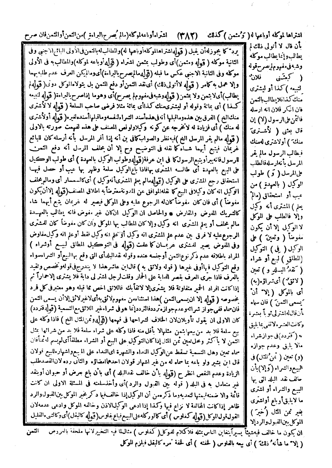 اشْتَرَاهَا لِمُوَكِّلِهِ أَوْ بَاعَهَا لَهُ (وَمُثَمَّنٌ) كَذَلِكَ اشْتَرَاهُ أَوْ بَاعَهُ لِمُوَكِّلِهِ (مَا لَمْ يُصَرِّحْ بِالْبَرَاءَةِ) مِنْ الثَّمَنِ أَوْ الْمُثَمَّنِ، فَإِنْ صَرَّحَ بِأَنْ قَالَ لَا أَتَوَلَّى ذَلِكَ لَمْ يُطَالَبْ وَإِنَّمَا يُطَالَبُ مُوَكِّلُهُ وَشُبِّهَ فِي مَفْهُومٍ لَمْ يُصَرِّحْ قَوْلُهُ (كَبَعَثَنِي فُلَانٌ لِتَبِيعَهُ) كَذَا أَوْ لِيَشْتَرِيَ مِنْك كَذَا فَلَا يُطَالَبُ بِالثَّمَنِ، فَإِنْ أَنْكَرَ فُلَانٌ أَنَّهُ أَرْسَلَهُ فَالثَّمَنُ عَلَى الرَّسُولِ (لَا) إنْ قَالَ بَعَثَنِي (لِأَشْتَرِيَ مِنْك) أَوْ لِأَشْتَرِيَ لَهُ مِنْك فَيُطَالَبُ الرَّسُولُ مَا لَمْ يُقِرَّ الْمُرْسِلُ بِأَنَّهُ أَرْسَلَهُ فَالطَّلَبُ عَلَى الْمُرْسِلِ (و) طُولِبَ الْوَكِيلُ (بِالْعُهْدَةِ) مِنْ عَيْبٍ أَوْ اسْتِحْقَاقٍ (مَا لَمْ يَعْلَمْ) الْمُشْتَرِي أَنَّهُ وَكِيلٌ وَإِلَّا فَالطَّلَبُ عَلَى الْمُوَكِّلِ لَا الْوَكِيلِ إلَّا أَنْ يَكُونَ مُفَوَّضًا