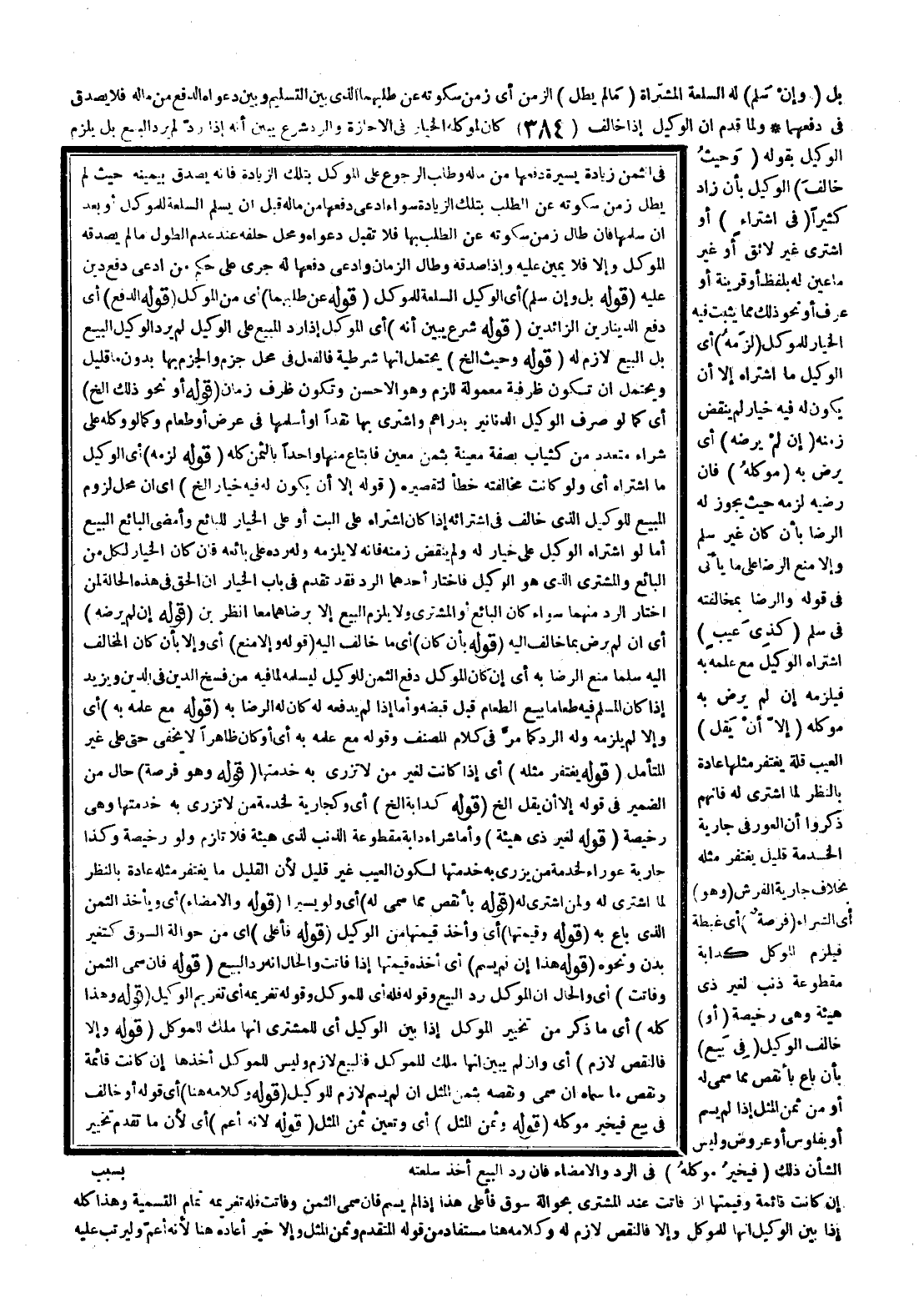 ـــــــــــــــــــــــــــــQفِي الثَّمَنِ زِيَادَةً يَسِيرَةً دَفَعَهَا مِنْ مَالِهِ وَطَلَبَ الرُّجُوعَ عَلَى الْمُوَكِّلِ بِتِلْكَ الزِّيَادَةِ فَإِنَّهُ يُصَدَّقُ بِيَمِينِهِ حَيْثُ لَمْ يَطُلْ زَمَنُ سُكُوتِهِ عَنْ الطَّلَبِ بِتِلْكَ الزِّيَادَةِ سَوَاءٌ ادَّعَى دَفْعَهَا مِنْ مَالِهِ قَبْلَ أَنْ يُسَلِّمَ السِّلْعَةَ لِلْمُوَكَّلِ أَوْ بَعْدَ أَنْ سَلَّمَهَا، فَإِنْ طَالَ زَمَنُ سُكُوتِهِ عَنْ الطَّلَبِ بِهَا فَلَا تُقْبَلُ دَعْوَاهُ وَمَحَلُّ حَلِفِهِ عِنْدَ عَدَمِ الطُّولِ مَا لَمْ يُصَدِّقْهُ الْمُوَكِّلُ وَإِلَّا فَلَا يَمِينَ عَلَيْهِ وَإِذَا صَدَّقَهُ وَطَالَ الزَّمَانُ وَادَّعَى دَفْعَهَا لَهُ جَرَى عَلَى حُكْمِ مَنْ ادَّعَى دَفْعَ دَيْنٍ عَلَيْهِ.