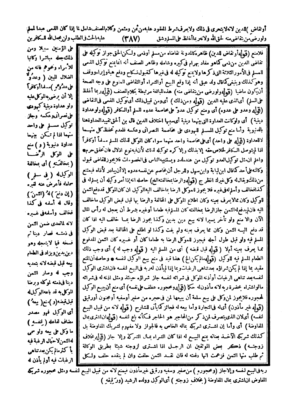وَاعْلَمْ أَنَّ مِثْلَ تَوْكِيلِ الْعَدُوِّ تَوْكِيلُ مَنْ عِنْدَهُ لَدَدٌ وَيَسْتَنِيبُهُ النَّاسُ فِي الْخُصُومَاتِ فَلَا يَجُوزُ لِلْقَاضِي قَبُولُ وَكَالَتِهِ عَلَى أَحَدٍ كَمَا قَالَ ابْنُ لُبَابَةَ وَابْنُ سَهْلٍ وَلِلرَّجُلِ أَنْ يُخَاصِمَ عَنْ نَفْسِهِ عَدُوَّهُ إلَّا أَنْ يُبَادِرَ لِأَذَاهُ فَيَمْتَنِعَ مِنْ ذَلِكَ وَيُقَالُ لَهُ وَكِّلْ غَيْرَك اُنْظُرْ ج (قَوْلُهُ وَالرِّضَا بِمُخَالَفَتِهِ إلَخْ) حَاصِلُهُ أَنَّهُ إذَا أَمَرَ وَكِيلَهُ أَنْ يُسْلِمَ لَهُ فِي كَذَا فَخَالَفَ وَأَسْلَمَ لَهُ فِي غَيْرِهِ فَلَا يَجُوزُ لِلْمُوَكِّلِ الرِّضَا بِمَا خَالَفَ إلَيْهِ الْوَكِيلُ إنْ كَانَ الْمُوَكِّلُ قَدْ دَفَعَ الثَّمَنَ لِلْوَكِيلِ وَكَانَ مِمَّا لَا يُعْرَفُ بِعَيْنِهِ وَكَانَ اطِّلَاعُ الْمُوَكِّلِ عَلَى الْمُخَالَفَةِ وَالرِّضَا بِهَا قَبْلَ قَبْضِ الْوَكِيلِ مَا خَالَفَ إلَيْهِ، فَإِنْ لَمْ يَدْفَعْ لَهُ الثَّمَنَ جَازَ الرِّضَا بِمُخَالَفَتِهِ كَانَ الْمُسَلَّمُ فِيهِ طَعَامًا أَوْ غَيْرَهُ بِشَرْطِ أَنْ يُعَجِّلَ لَهُ رَأْسَ الْمَالِ الْآنَ وَإِلَّا مُنِعَ وَلَوْ تَأَخَّرَ يَسِيرًا؛ لِأَنَّهُ بَيْعُ دَيْنٍ بِدَيْنٍ وَكَذَا يَجُوزُ الرِّضَا بِمَا خَالَفَ إلَيْهِ إذَا كَانَ قَدْ دَفَعَ إلَيْهِ الثَّمَنَ وَكَانَ مِمَّا يُعْرَفُ بِعَيْنِهِ وَلَمْ يَفُتْ، وَكَذَا لَوْ اطَّلَعَ عَلَى الْمُخَالَفَةِ بَعْدَ قَبْضِ الْوَكِيلِ نَكَلًا فِيهِ وَلَوْ قَبْلَ طُولِ أَجَلِهِ فَيَجُوزُ لِلْمُوَكِّلِ الرِّضَا بِهِ طَعَامًا كَانَ أَوْ غَيْرَهُ كَانَ الثَّمَنُ الْمَدْفُوعُ مِمَّا يُعْرَفُ بِعَيْنِهِ أَمْ لَا (قَوْلُهُ قَبْلَ قَبْضِهِ) أَيْ مِنْ الْمُسَلَّمِ إلَيْهِ (قَوْلُهُ وَجَبَ لَهُ) أَيْ وَجَبَ ذَلِكَ الطَّعَامُ نَكَلًا فِيهِ لِلْوَكِيلِ