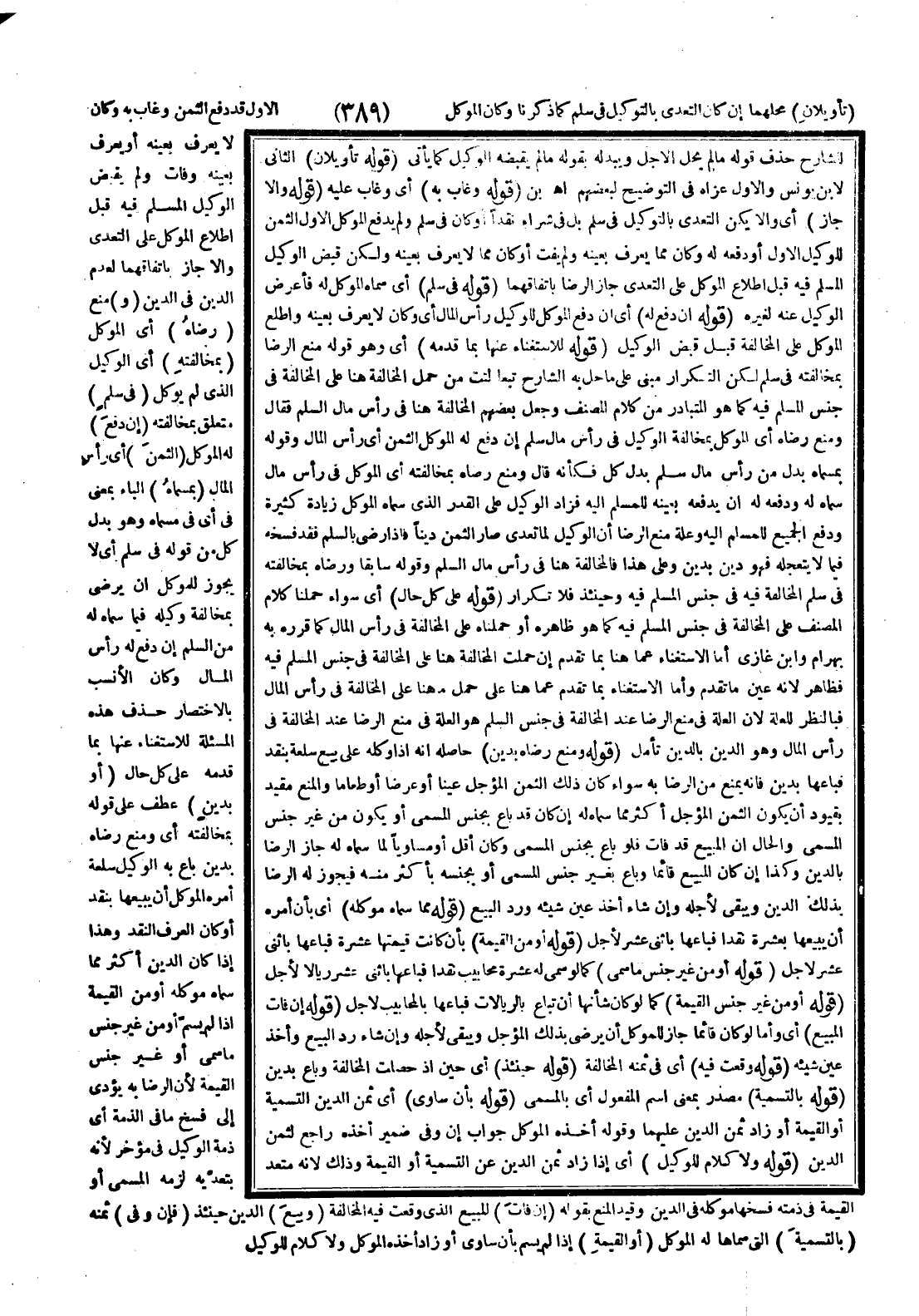 (تَأْوِيلَانِ) مَحَلُّهُمَا إنْ كَانَ التَّعَدِّي بِالتَّوْكِيلِ فِي سَلَمٍ كَمَا ذَكَرْنَا وَكَانَ الْمُوَكِّلُ الْأَوَّلُ قَدْ دَفَعَ الثَّمَنَ وَغَابَ بِهِ وَكَانَ لَا يُعْرَفُ بِعَيْنِهِ أَوْ يُعْرَفُ بِعَيْنِهِ وَفَاتَ وَلَمْ يَقْبِضْ الْوَكِيلُ الْمُسَلَّمَ فِيهِ قَبْلَ اطِّلَاعِ الْمُوَكِّلِ عَلَى التَّعَدِّي وَإِلَّا جَازَ بِاتِّفَاقِهِمَا لِعَدَمِ الدَّيْنِ فِي الدَّيْنِ