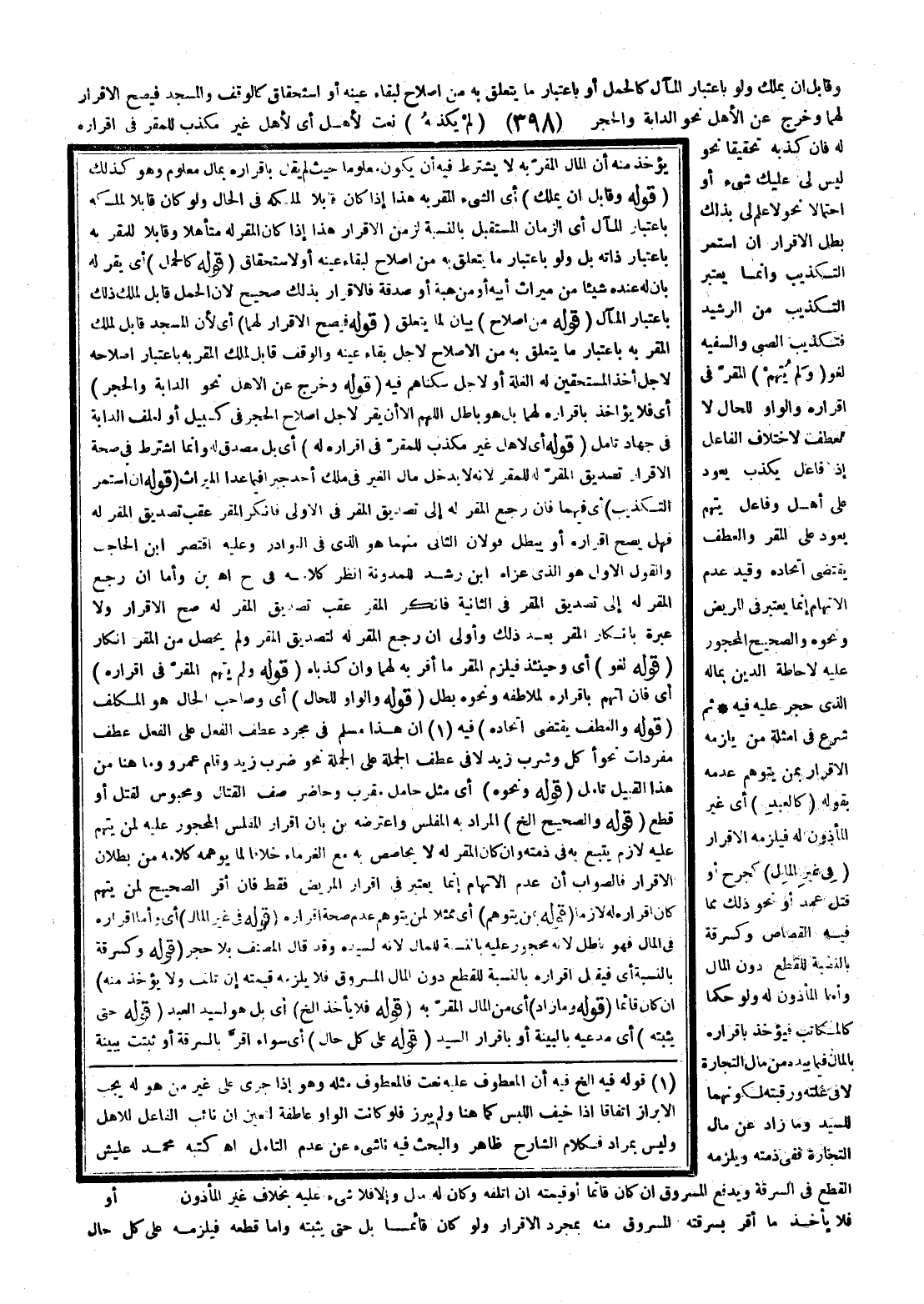 ، ثُمَّ شَرَعَ فِي أَمْثِلَةِ مَنْ يَلْزَمُهُ الْإِقْرَارُ بِمَنْ يُتَوَهَّمُ عَدَمُهُ بِقَوْلِهِ (كَالْعَبْدِ) أَيْ غَيْرِ الْمَأْذُونِ لَهُ فَيَلْزَمُهُ الْإِقْرَارُ (فِي غَيْرِ الْمَالِ) كَجُرْحٍ، أَوْ قَتْلِ عَمْدٍ، أَوْ نَحْوِ ذَلِكَ مِمَّا فِيهِ الْقِصَاصُ وَكَسَرِقَةٍ بِالنِّسْبَةِ لِلْقَطْعِ دُونَ الْمَالِ، وَأَمَّا الْمَأْذُونُ لَهُ وَلَوْ حُكْمًا كَالْمُكَاتَبِ فَيُؤْخَذُ بِإِقْرَارِهِ بِالْمَالِ فِيمَا بِيَدِهِ مِنْ مَالِ التِّجَارَةِ لَا فِي غَلَّتِهِ وَرَقَبَتِهِ لِكَوْنِهِمَا لِلسَّيِّدِ وَمَا زَادَ عَنْ مَالِ التِّجَارَةِ فَفِي ذِمَّتِهِ وَيَلْزَمُهُ الْقَطْعُ فِي السَّرِقَةِ وَيَدْفَعُ الْمَسْرُوقَ إنْ كَانَ قَائِمًا، أَوْ قِيمَتَهُ إنْ أَتْلَفَهُ وَكَانَ لَهُ مَالٌ، وَإِلَّا فَلَا شَيْءَ عَلَيْهِ بِخِلَافِ غَيْرِ الْمَأْذُونِ، أَوْ فَلَا يَأْخُذُ مَا أَقَرَّ بِسَرِقَتِهِ الْمَسْرُوقَ مِنْهُ بِمُجَرَّدِ الْإِقْرَارِ وَلَوْ كَانَ قَائِمًا، بَلْ حَتَّى يُثْبِتَهُ، وَأَمَّا قَطْعُهُ فَيَلْزَمُهُ عَلَى كُلِّ حَالٍ.