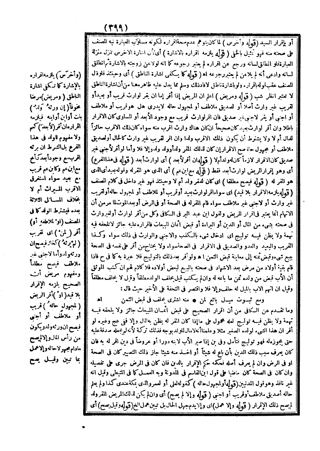 (قَوْلُهُ كَمَا يَكْفِي إشَارَةُ النَّاطِقِ) أَيْ وَحِينَئِذٍ فَلَوْ قَالَ الْمُصَنِّفُ عَقِبَ قَوْلِهِ بِإِقْرَارِهِ وَلَوْ بِإِشَارَةِ نَاطِقٍ لَأَفَادَ ذَلِكَ وَسَلِمَ مِمَّا يَدُلُّ عَلَيْهِ ظَاهِرُهُ هُنَا مِنْ أَنَّ إشَارَةَ النَّاطِقِ لَا تُعْتَبَرُ اُنْظُرْ شب (قَوْلُهُ وَمَرِيضٍ) اعْلَمْ أَنَّ الْمَرِيضَ إذَا أَقَرَّ إمَّا أَنْ يُقِرَّ لِوَارِثٍ قَرِيبٍ، أَوْ بَعِيدٍ، أَوْ لِقَرِيبٍ غَيْرِ وَارِثٍ أَصْلًا، أَوْ لِصِدِّيقٍ مُلَاطِفٍ، أَوْ لِمَجْهُولٍ حَالُهُ لَا يُدْرَى هَلْ هُوَ قَرِيبٌ، أَوْ مُلَاطِفٌ، أَوْ أَجْنَبِيٌّ، أَوْ يُقِرَّ لِأَجْنَبِيٍّ غَيْرِ صِدِّيقٍ فَإِنْ أَقَرَّ لِوَارِثٍ قَرِيبٍ مَعَ وُجُودِ الْأَبْعَدِ، أَوْ الْمُسَاوِي كَانَ الْإِقْرَارُ بَاطِلًا، وَإِنْ أَقَرَّ لِوَارِثٍ بَعِيدٍ كَانَ صَحِيحًا إنْ كَانَ هُنَاكَ وَارِثٌ أَقْرَبُ مِنْهُ سَوَاءً كَانَ ذَلِكَ الْأَقْرَبُ حَائِزًا لِلْمَالِ أَمْ لَا وَلَا يُشْتَرَطُ أَنْ يَكُونَ ذَلِكَ الْأَقْرَبُ وَلَدًا، وَإِنْ أَقَرَّ لِقَرِيبٍ غَيْرِ وَارِثٍ كَالْخَالِ، أَوْ لِصِدِّيقٍ مُلَاطِفٍ، أَوْ مَجْهُولٍ حَالُهُ صَحَّ الْإِقْرَارُ إنْ كَانَ لِذَلِكَ الْمُقِرِّ وَلَدٌ، أَوْ وَلَدُ وَلَدٍ، وَإِلَّا فَلَا، وَأَمَّا لَوْ أَقَرَّ لِأَجْنَبِيٍّ غَيْرِ صِدِّيقٍ كَانَ الْإِقْرَارُ لَازِمًا كَانَ لَهُ وَلَدٌ أَمْ لَا (قَوْلُهُ إنْ أَقَرَّ لِأَبْعَدَ) أَيْ لِوَارِثٍ أَبْعَدَ (قَوْلُهُ فِي هَذَا الْفَرْعِ) أَيْ، وَهُوَ إقْرَارُ الْمَرِيضِ لِوَارِثٍ أَبْعَدَ فَقَطْ (قَوْلُهُ مَعَ ابْنِ عَمٍّ) أَيْ الَّذِي هُوَ الْمُقَرُّ لَهُ وَقَوْلُهُ بَعِيدٍ أَيْ الَّذِي هُوَ الْمُقَرُّ لَهُ (قَوْلُهُ فَيَصِحُّ مُطْلَقًا) أَيْ كَانَ لِلْمُقِرِّ وَلَدٌ أَمْ لَا وَحِينَئِذٍ فَهُوَ غَيْرُ دَاخِلٍ فِي كَلَامِ الْمُصَنِّفِ (قَوْلُهُ يَلْزَمُهُ الْإِقْرَارُ بِلَا قَيْدٍ) أَيْ سَوَاءً أَقَرَّ لِوَارِثٍ بَعِيدٍ، أَوْ قَرِيبٍ، أَوْ لِمُلَاطِفٍ، أَوْ لِمَجْهُولٍ حَالُهُ، أَوْ لِقَرِيبٍ غَيْرِ وَارِثٍ، أَوْ لِأَجْنَبِيٍّ غَيْرِ مُلَاطِفٍ سَوَاءً قَامَ الْمُقَرُّ لَهُ فِي الصِّحَّةِ، أَوْ فِي الْمَرَضِ، أَوْ بَعْدَ الْمَوْتِ لِمَا مَرَّ مِنْ أَنَّ الِاتِّهَامَ إنَّمَا يُعْتَبَرُ فِي إقْرَارِ الْمَرِيضِ وَلِقَوْلِ ابْنِ عَبْدِ الْبَرِّ فِي الْكَافِي وَكُلُّ مَنْ أَقَرَّ لِوَارِثٍ، أَوْ لِغَيْرِ وَارِثٍ فِي صِحَّتِهِ بِشَيْءٍ مِنْ الْمَالِ، أَوْ الدَّيْنِ، أَوْ الْبَرَاءَةِ، أَوْ قَبْضِ أَثْمَانِ الْمَبِيعَاتِ فَإِقْرَارُهُ عَلَيْهِ جَائِزٌ لَا تَلْحَقُهُ فِيهِ تُهْمَةٌ وَلَا يُظَنُّ فِيهِ تَوْلِيجٌ أَيْ إدْخَالُ شَيْءٍ بِالْكَذِبِ، وَالْأَجْنَبِيُّ، وَالْوَارِثُ فِي ذَلِكَ سَوَاءٌ وَكَذَا الْقَرِيبُ، وَالْبَعِيدُ، وَالْعَدُوُّ، وَالصِّدِّيقُ فِي الْإِقْرَارِ فِي الصِّحَّةِ سَوَاءٌ وَلَا يَحْتَاجُ مَنْ أَقَرَّ عَلَى نَفْسِهِ فِي الصِّحَّةِ بِبَيْعِ شَيْءٍ وَقَبْضِ ثَمَنِهِ إلَى مُعَايَنَةِ قَبْضِ الثَّمَنِ اهـ.