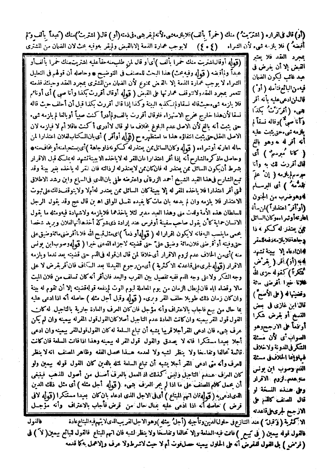 ـــــــــــــــــــــــــــــQقَوْلُهُ، أَوْ قَالَ اشْتَرَيْت مِنْك خَمْرًا بِأَلْفٍ) أَيْ، أَوْ قَالَ لِمَنْ طَلَب مِنْهُ حَقًّا عَلَيْهِ اشْتَرَيْت مِنْك خَمْرًا بِأَلْفٍ، أَوْ عَبْدًا وَلَمْ أَقْبِضْهُ (قَوْلُهُ وَفِيهِ بَحْثٌ) هَذَا الْبَحْثُ لِلْمُصَنِّفِ فِي التَّوْضِيحِ وَحَاصِلُهُ أَنَّ قَوْلَهُمْ فِي التَّعْلِيلِ الشِّرَاءُ لَا يُوجِبُ عِمَارَةَ الذِّمَّةِ إلَّا بِالْقَبْضِ مَمْنُوعٌ؛ لِأَنَّ الضَّمَانَ مِنْ الْمُشْتَرِي بِمُجَرَّدِ الْعَقْدِ وَحِينَئِذٍ فَذِمَّتُهُ تَتَعَمَّرُ بِمُجَرَّدِ الْعَقْدِ وَلَا تَتَوَقَّفُ عِمَارَتُهَا عَلَى الْقَبْضِ (قَوْلُهُ، أَوْ قَالَ أَقْرَرْت بِكَذَا، وَأَنَا صَبِيٌّ) أَيْ، أَوْ نَائِمٌ فَلَا يَلْزَمُهُ شَيْءٌ حَيْثُ قَالَهُ نَسَقًا وَلَمْ تُكَذِّبْهُ الْبَيِّنَةُ وَكَذَا إذَا قَالَ أَقْرَرْت بِكَذَا قَبْلَ أَنْ أَحْلِفَ حَيْثُ قَالَهُ نَسَقًا؛ لِأَنَّ هَذَا خَارِجٌ مَخْرَجَ الِاسْتِهْزَاءِ فَلَوْ قَالَ أَقْرَرْت بِأَلْفٍ وَلَمْ أَدْرِ أَكُنْت صَبِيًّا، أَوْ بَالِغًا لَمْ يَلْزَمْهُ شَيْءٌ حَتَّى يَثْبُتَ أَنَّهُ بَالِغٌ؛ لِأَنَّ الْأَصْلَ عَدَمُ الْبُلُوغِ بِخِلَافِ مَا لَوْ قَالَ لَا أَدْرِي أَكُنْت عَاقِلًا أَمْ لَا فَيَلْزَمُهُ؛ لِأَنَّ الْأَصْلَ الْعَقْلُ حَتَّى يَثْبُتَ انْتِفَاؤُهُ هَذَا مَا اسْتَظْهَرَهُ ح (قَوْلُهُ، أَوْ أَقَرَّ) أَيْ بِأَنَّ الْكِتَابَ لِفُلَانٍ اعْتِذَارًا لِمَنْ سَأَلَهُ إعَارَتَهُ، أَوْ شِرَاءَهُ (قَوْلُهُ وَكَانَ السَّائِلُ مِمَّنْ يُعْتَذَرُ لَهُ كَكَوْنِهِ ذَا وَجَاهَةٍ) أَيْ يُسْتَحْيَا مِنْهُ، أَوْ يُخَافُ مِنْهُ وَحَاصِلُ مَا ذَكَرَهُ الشَّارِحُ أَنَّهُ إذَا أَقَرَّ اعْتِذَارًا فَإِنَّ الْمُقَرَّ لَهُ لَا يَأْخُذُهُ إلَّا بِبَيِّنَةٍ تَشْهَدُ لَهُ بِمِلْكِهِ قَبْلَ الْإِقْرَارِ بِشَرْطِ أَنْ يَكُونَ السَّائِلُ مِمَّنْ يُعْتَذَرُ لَهُ فَإِنْ كَانَ مِمَّنْ لَا يُعْتَذَرُ لَهُ لِرَذَالَتِهِ فَإِنْ الْمُقَرَّ لَهُ يَأْخُذُهُ بِغَيْرِ بَيِّنَةٍ وَقَدْ تَبِعَ الشَّارِحُ فِي هَذَا الْقَيْدِ الشَّيْخُ أَحْمَدُ الزَّرْقَانِيُّ وَاعْتَرَضَهُ طفى بِأَنَّ الَّذِي فِي السَّمَاعِ وَابْنِ رُشْدٍ الْإِطْلَاقُ فَمَتَى أَقَرَّ اعْتِذَارًا فَلَا يَأْخُذُهُ الْمُقَرُّ لَهُ إلَّا بِبَيِّنَةٍ كَانَ السَّائِلُ مِمَّنْ يُعْتَذَرُ لَهُ أَمْ لَا وَلَا يَتَوَقَّفُ ذَلِكَ عَلَى ثُبُوتِ الِاعْتِذَارِ فَلَا يَلْزَمُهُ، وَإِنْ لَمْ يَدَعْهُ بِأَنْ مَاتَ كَمَا يُفِيدُهُ نَقْلُ الْمَوَّاقِ اهـ.