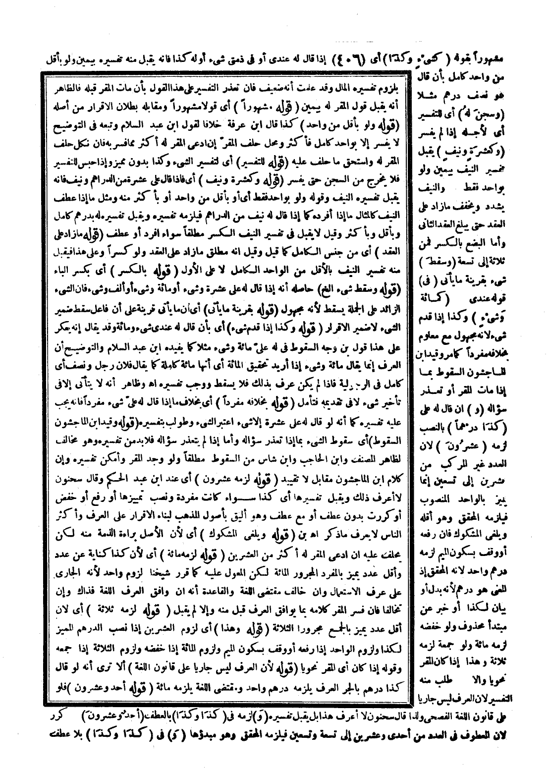 (قَوْلُهُ وَيُلْغَى الشُّكُوكُ) أَيْ؛ لِأَنَّ الْأَصْلَ بَرَاءَةُ الذِّمَّةِ مِنْهُ لَكِنْ يَحْلِفُ عَلَيْهِ إنْ ادَّعَى الْمُقَرَّ لَهُ أَكْثَرَ مِنْ الْعِشْرِينَ (قَوْلُهُ لَزِمَهُ مِائَةٌ) أَيْ؛ لِأَنَّ كَذَا كِنَايَةٌ عَنْ عَدَدٍ، وَأَقَلُّ عَدَدٍ يُمَيَّزُ بِالْمُفْرَدِ الْمَجْرُورِ الْمِائَةُ لَكِنَّ الْمُعَوَّلَ عَلَيْهِ كَمَا قَرَّرَ شَيْخُنَا لُزُومُ وَاحِدٍ؛ لِأَنَّهُ الْجَارِي عَلَى عُرْفِ الِاسْتِعْمَالِ، وَإِنْ خَالَفَ مُقْتَضَى اللُّغَةِ، وَالْقَاعِدَةُ أَنَّهُ إنْ وَافَقَ الْعُرْفُ اللُّغَةَ فَذَاكَ، وَإِنْ تَخَالَفَا فَإِنْ فَسَّرَ الْمُقِرُّ كَلَامَهُ بِمَا يُوَافِقُ الْعُرْفَ قُبِلَ مِنْهُ، وَإِلَّا لَمْ يُقْبَلْ (قَوْلُهُ لَزِمَهُ ثَلَاثَةٌ) أَيْ؛ لِأَنَّ أَقَلَّ عَدَدٍ يُمَيَّزُ بِالْجَمْعِ مَجْرُورًا الثَّلَاثَةُ (قَوْلُهُ، وَهَذَا) أَيْ لُزُومُ الْعِشْرِينَ إذَا نَصَبَ الدِّرْهَمَ الْمُمَيِّزَ لِكَذَا وَلُزُومُ الْوَاحِدِ إذَا رَفَعَهُ، أَوْ وَقَفَ بِسُكُونِ الْمِيمِ وَلُزُومُ الْمِائَةِ إذَا خَفَضَهُ وَلُزُومُ الثَّلَاثَةِ إذَا جَمَعَهُ وَقَوْلُهُ إذَا كَانَ أَيْ الْمُقِرُّ نَحْوِيًّا (قَوْلُهُ؛ لِأَنَّ الْعُرْفَ لَيْسَ جَارِيًا عَلَى قَانُونِ اللُّغَةِ) أَلَا تَرَى أَنَّهُ لَوْ قَالَ كَذَا دِرْهَمٍ بِالْجَرِّ الْعُرْفُ يُلْزِمُهُ دِرْهَمًا وَاحِدًا وَمُقْتَضَى اللُّغَةِ يُلْزِمُهُ مِائَةً (قَوْلُهُ أَحَدٌ وَعِشْرُونَ) فَلَوْ