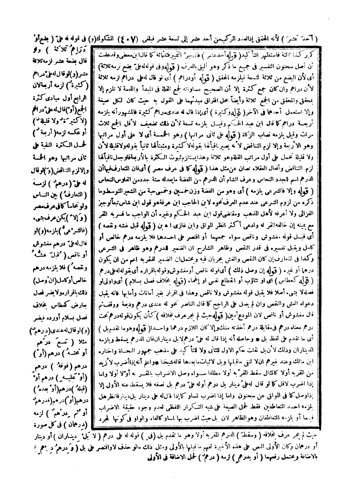 ـــــــــــــــــــــــــــــQكَرَّرَ كَذَا ثَالِثَةً فَاسْتَظْهَرَ التَّأْكِيدَ (قَوْلُهُ أَحَدَ عَشَرَ) فَإِنْ جَرَّ التَّمْيِيزَ فَثَلَثُمِائَةٍ كَمَا قَالَ ابْنُ مُعْطِي وَقَدْ عَلِمْت أَنَّ أَصْلَ سَحْنُونٍ التَّفْسِيرُ فِي جَمِيعِ مَا ذُكِرَ، وَهُوَ أَلْيَقُ بِالْعُرْفِ (قَوْلُهُ وَفِي قَوْلِهِ لَهُ عَلَيَّ بِضْعٌ لَزِمَهُ ثَلَاثَةٌ) أَيْ؛ لِأَنَّ الْبِضْعَ مِنْ ثَلَاثَةٍ لِتِسْعَةٍ فَيَلْزَمُهُ الْمُحَقَّقُ (قَوْلُهُ، أَوْ دَرَاهِمَ) أَيْ لَوْ قَالَ لَهُ عَلَيَّ دَرَاهِمُ لَزِمَهُ ثَلَاثَةٌ؛ لِأَنَّ دَرَاهِمَ، وَإِنْ كَانَ جَمْعَ كَثْرَةٍ إلَّا أَنَّ الصَّحِيحَ مُسَاوَاتُهُ لِجَمْعِ الْقِلَّةِ فِي الْمَبْدَأِ، وَالذِّمَّةُ لَا تُلْزَمُ إلَّا بِمُحَقَّقٍ، وَالْمُحَقَّقُ مِنْ الْجَمْعِ ثَلَاثَةٌ، وَأَيْضًا مَحَلُّ افْتِرَاقِ مَبْدَئِهِمَا عَلَى الْقَوْلِ بِهِ حَيْثُ كَانَ لِكُلِّ صِيغَةٍ، وَإِلَّا اُسْتُعْمِلَ أَحَدُهُمَا فِي الْآخَرِ (قَوْلُهُ وَكَثِيرَةٌ) أَيْ إذَا قَالَ لَهُ عِنْدِي دَرَاهِمُ كَثِيرَةٌ فَالْمَشْهُورُ أَنَّهُ يَلْزَمُهُ أَرْبَعَةُ دَرَاهِمَ كَمَا قَالَ ابْنُ عَبْدِ الْحَكَمِ وَقِيلَ يَلْزَمُهُ تِسْعَةٌ؛ لِأَنَّ ذَلِكَ تَضْعِيفٌ لِأَقَلِّ الْجَمْعِ ثَلَاثَ مَرَّاتٍ وَقِيلَ يَلْزَمُهُ نِصَابُ الزَّكَاةِ (قَوْلُهُ عَلَى ثَانِي مَرَاتِبِهَا) ، وَهُوَ الْخَمْسَةُ أَيْ لَا عَلَى أَوَّلِ مَرَاتِبِهَا، وَهُوَ الْأَرْبَعَةُ، وَإِلَّا لَزِمَ التَّنَاقُضُ؛ لِأَنَّهُ يَصِيرُ نَافِيًا لَهَا بِقَوْلِهِ لَا كَثِيرَةٌ وَمُثْبِتًا لَهَا ثَانِيًا بِقَوْلِهِ وَلَا قَلِيلَةً؛ لِأَنَّ وَلَا قَلِيلَةً تُحْمَلُ عَلَى أَوَّلِ مَرَاتِبِ الْقِلَّةِ، وَهُوَ ثَلَاثَةٌ، وَهَذَا يَسْتَلْزِمُ ثُبُوتَ الْكَثْرَةِ بِالْأَرْبَعَةِ فَلَوْ جُعِلَ نَافِيًا لَهَا لَزِمَ التَّنَاقُضُ، وَأَفْعَالُ الْعُقَلَاءِ تُصَانُ عَنْ مِثْلِ هَذَا (قَوْلُهُ كَمَا فِي عُرْفِ مِصْرَ) أَيْ فَإِنَّ الْمُتَعَارَفَ فِيهَا أَنَّ الدِّرْهَمَ اسْمٌ لِلْجُدُدِ النُّحَاسِ وَعُرْفُ الشَّامِ أَنَّ الدِّرْهَمَ مِنْ الْفِضَّةِ مَا يَعْدِلُهُ سِتَّةُ جُدُدٍ مِنْ الْفُلُوسِ النُّحَاسِ.