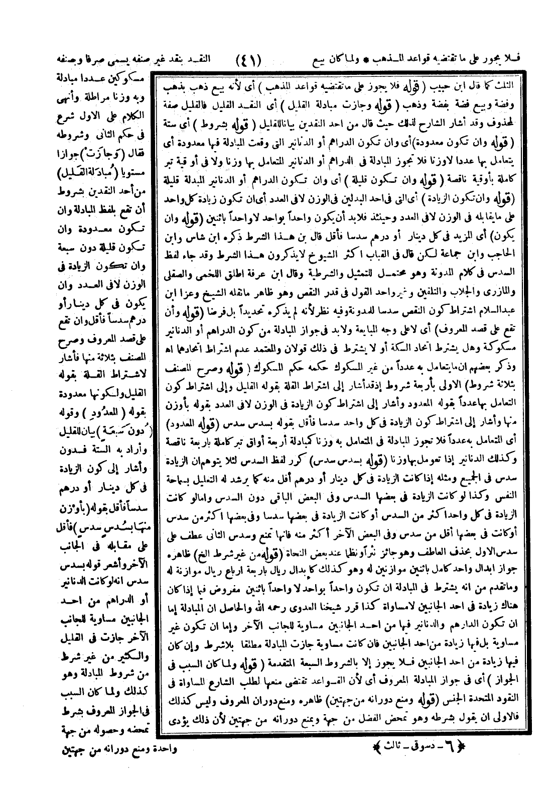 (قَوْلُهُ: بِشُرُوطٍ) أَيْ سِتَّةٍ (قَوْلُهُ: وَأَنْ تَكُونَ مَعْدُودَةً) أَيْ وَأَنْ تَكُونَ الدَّرَاهِمُ أَوْ الدَّنَانِيرُ الَّتِي وَقَعَتْ الْمُبَادَلَةُ فِيهَا مَعْدُودَةً أَيْ يَتَعَامَلُ بِهَا عَدَدًا لَا وَزْنًا فَلَا تَجُوزُ الْمُبَادَلَةُ فِي الدَّرَاهِمِ أَوْ الدَّنَانِيرِ الْمُتَعَامَلِ بِهَا وَزْنًا وَلَا فِي أُوقِيَّةِ تِبْرٍ كَامِلَةٍ بِأُوقِيَّةٍ نَاقِصَةٍ (قَوْلُهُ: وَأَنْ تَكُونَ قَلِيلَةً) أَيْ وَأَنْ تَكُونَ الدَّرَاهِمُ أَوْ الدَّنَانِيرُ الْمُبْدَلَةُ قَلِيلَةً (قَوْلُهُ: وَأَنْ تَكُونَ الزِّيَادَةُ) أَيْ الَّتِي فِي أَحَدِ الْبَدَلَيْنِ فِي الْوَزْنِ لَا فِي الْعَدَدِ أَيْ أَنْ تَكُونَ زِيَادَةُ كُلِّ وَاحِدٍ عَلَى مَا يُقَابِلُهُ فِي الْوَزْنِ لَا فِي الْعَدَدِ وَحِينَئِذٍ فَلَا بُدَّ أَنْ يَكُونَ وَاحِدًا بِوَاحِدٍ لَا وَاحِدًا بِاثْنَيْنِ (قَوْلُهُ: وَأَنْ يَكُونَ) أَيْ الْمَزِيدُ فِي كُلِّ دِينَارٍ أَوْ دِرْهَمٍ سُدُسًا فَأَقَلَّ، قَالَ بْن هَذَا الشَّرْطُ ذَكَرَهُ ابْنُ شَاسٍ وَابْنُ الْحَاجِبِ وَابْنُ جَمَاعَةَ لَكِنْ قَالَ فِي الْقُبَابِ أَكْثَرُ الشُّيُوخِ لَا يَذْكُرُونَ هَذَا الشَّرْطَ وَقَدْ جَاءَ لَفْظُ السُّدُسِ فِي كَلَامِ الْمُدَوَّنَةِ وَهُوَ مُحْتَمَلٌ لِلتَّمْثِيلِ وَالشَّرْطِيَّةِ، وَقَالَ ابْنُ عَرَفَةَ أَطْلَقَ اللَّخْمِيُّ وَالصَّقَلِّيُّ وَالْمَازِرِيُّ وَالْجَلَّابُ وَالتَّلْقِينُ وَغَيْرُ وَاحِدٍ الْقَوْلَ فِي قَدْرِ النَّقْصِ وَهُوَ ظَاهِرُ مَا نَقَلَهُ الشَّيْخُ وَعَزَا ابْنُ عَبْدِ السَّلَامِ اشْتِرَاطَ كَوْنِ النَّقْصِ سُدُسًا لِلْمُدَوَّنَةِ وَفِيهِ نَظَرٌ لِأَنَّهُ لَمْ يَذْكُرْهُ تَحْدِيدًا بَلْ فَرْضًا.