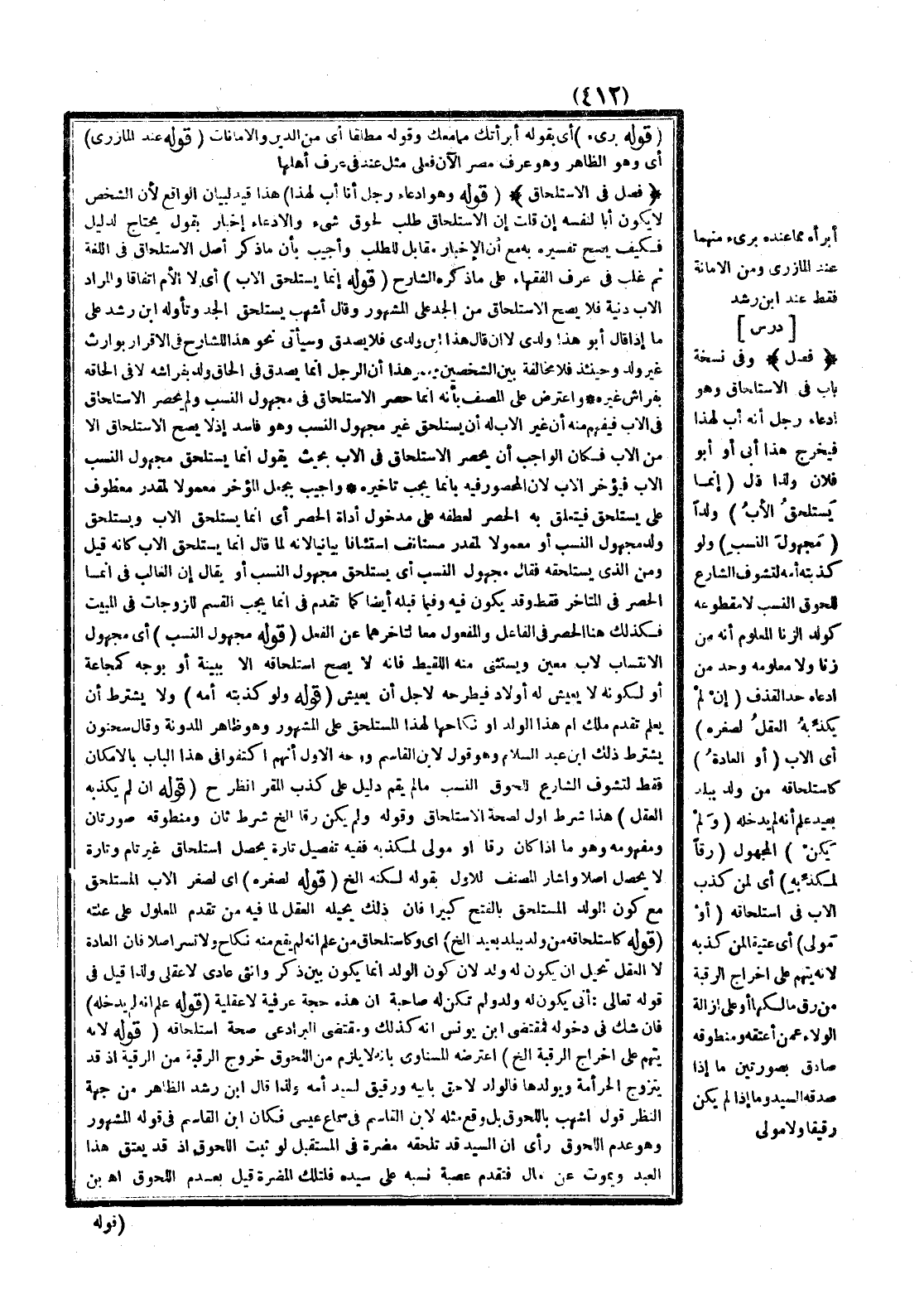 (دَرْسٌ) (فَصْلٌ) وَفِي نُسْخَةٍ (بَابٌ) فِي الِاسْتِلْحَاقِ، وَهُوَ ادِّعَاءُ رَجُلٍ أَنَّهُ أَبٌ لِهَذَا فَيَخْرُجُ هَذَا أَبِي، أَوْ أَبُو فُلَانٍ وَلِذَا قَالَ (إنَّمَا يَسْتَلْحِقُ الْأَبُ) وَلَدًا (مَجْهُولَ النَّسَبِ) وَلَوْ كَذَّبَتْهُ أُمُّهُ لِتَشَوُّفِ الشَّارِعِ لِلُحُوقِ النَّسَبِ لَا مَقْطُوعَهُ كَوَلَدِ الزِّنَا الْمَعْلُومِ أَنَّهُ مِنْ زِنًا وَلَا مَعْلُومَهُ وَحُدَّ مَنْ ادَّعَاهُ حَدَّ الْقَذْفِ (إنْ لَمْ يُكَذِّبْهُ الْعَقْلُ لِصِغَرِهِ) أَيْ الْأَبِ (أَوْ الْعَادَةُ) كَاسْتِلْحَاقِهِ مَنْ وُلِدَ بِبَلَدٍ بَعِيدٍ عُلِمَ أَنَّهُ لَمْ يَدْخُلْهُ (وَلَمْ يَكُنْ) الْمَجْهُولُ (رِقًّا لِمُكَذِّبِهِ) أَيْ لِمَنْ كَذَّبَ الْأَبَ فِي اسْتِلْحَاقِهِ (أَوْ مَوْلًى) أَيْ عَتِيقًا لِمَنْ كَذَّبَهُ؛ لِأَنَّهُ يُتَّهَمُ عَلَى إخْرَاجِ الرَّقَبَةِ مِنْ رِقِّ مَالِكِهَا، أَوْ عَلَى إزَالَةِ الْوَلَاءِ عَمَّنْ أَعْتَقَهُ وَمَنْطُوقُهُ صَادِقٌ بِصُورَتَيْنِ مَا إذَا صَدَّقَهُ السَّيِّدُ وَمَا إذَا لَمْ يَكُنْ رَقِيقًا وَلَا مَوْلًى