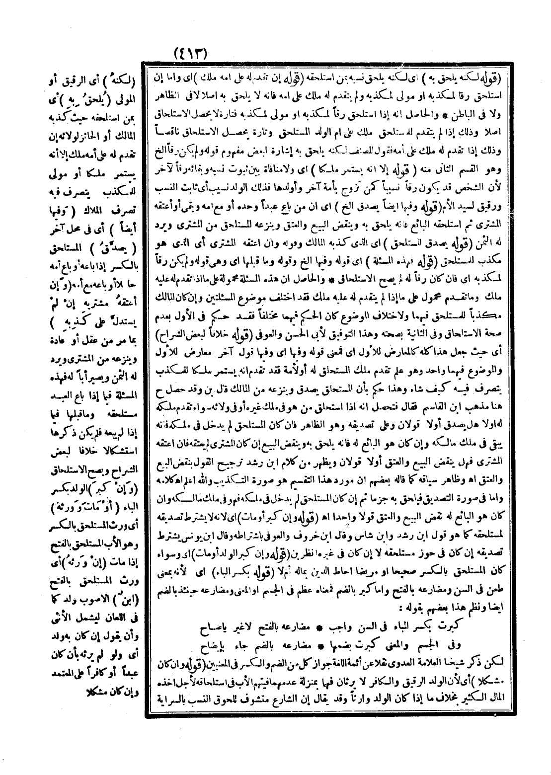 (لَكِنَّهُ) أَيْ الرَّقِيقَ، أَوْ الْمَوْلَى (يُلْحَقُ بِهِ) أَيْ بِمَنْ اسْتَلْحَقَهُ حَيْثُ كَذَّبَهُ الْمَالِكُ، أَوْ الْحَائِزُ لِوَلَائِهِ إنْ تَقَدَّمَ لَهُ عَلَى أُمِّهِ مِلْكٌ إلَّا أَنَّهُ يَسْتَمِرُّ مِلْكًا، أَوْ مَوْلَى لِلْمُكَذِّبِ يَتَصَرَّفُ فِيهِ تَصَرُّفَ الْمُلَّاكِ (وَفِيهَا أَيْضًا) أَيْ فِي مَحِلٍّ آخَرَ (يُصَدَّقُ) الْمُسْتَلْحِقُ بِالْكَسْرِ إذَا بَاعَهُ، أَوْ بَاعَ أُمَّهُ حَامِلًا، أَوْ بَاعَهُ مَعَ أُمِّهِ (وَإِنْ أَعْتَقَهُ مُشْتَرِيهِ إنْ لَمْ يُسْتَدَلَّ عَلَى كَذِبِهِ) بِمَا مَرَّ مِنْ عَقْلٍ، أَوْ عَادَةٍ وَيَنْزِعُهُ مِنْ الْمُشْتَرِي وَيَرُدُّ لَهُ الثَّمَنَ وَيَصِيرُ أَبًا لَهُ فَهَذِهِ الْمَسْأَلَةُ فِيمَا إذَا بَاعَ الْعَبْدَ مُسْتَلْحِقُهُ وَمَا قَبْلَهَا فِيمَا إذَا لَمْ يَبِعْهُ فَلَمْ يَكُنْ ذِكْرُهَا اسْتِشْكَالًا خِلَافًا لِبَعْضِ الشُّرَّاحِ وَيَصِحُّ الِاسْتِلْحَاقُ.