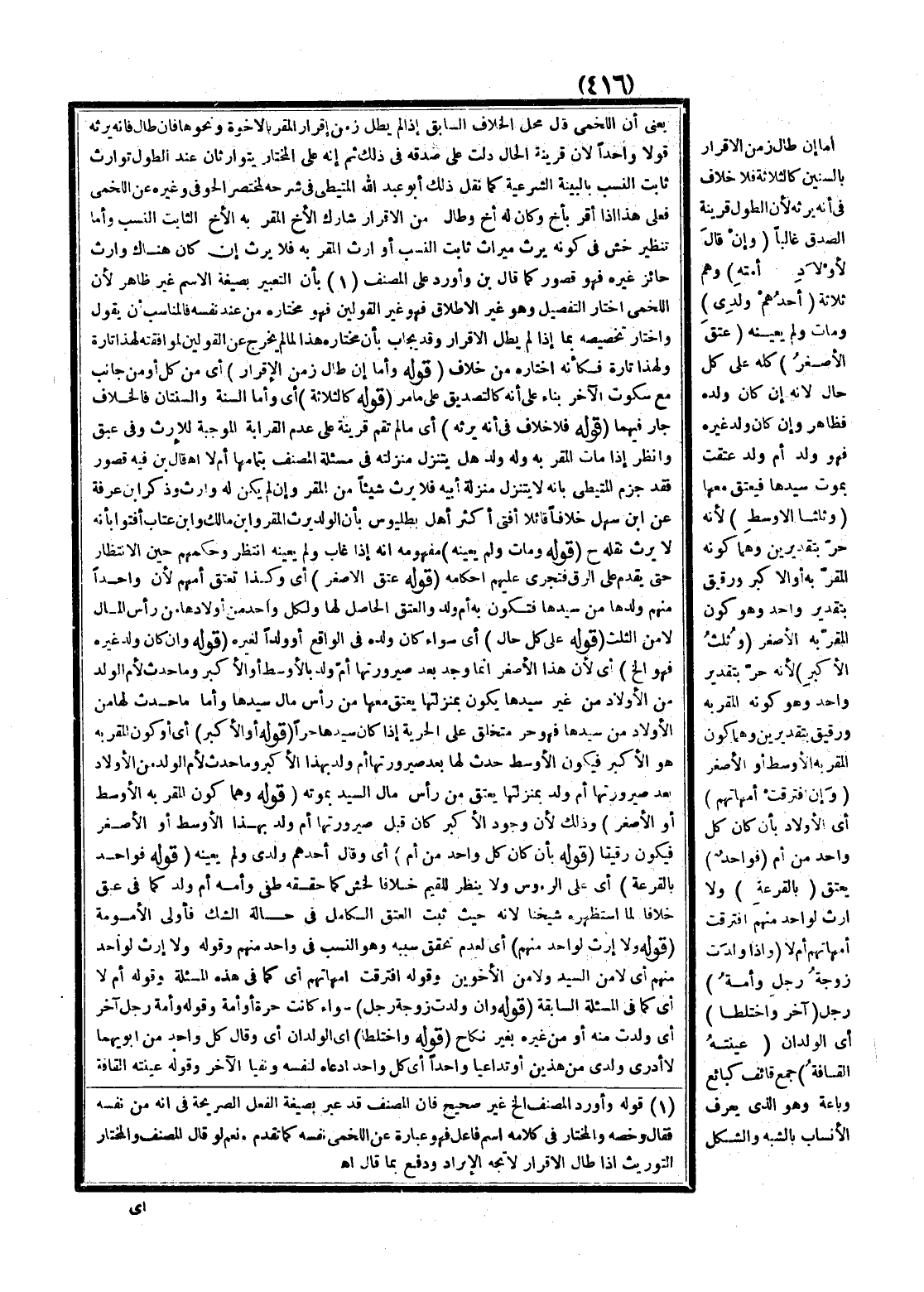 قَالَ بْن فِيهِ قُصُورٌ فَقَدْ جَزَمَ الْمُتَيْطِيُّ بِأَنَّهُ لَا يَتَنَزَّلُ مَنْزِلَةَ أَبِيهِ فَلَا يَرِثُ شَيْئًا مِنْ الْمُقِرِّ، وَإِنْ لَمْ يَكُنْ لَهُ وَارِثٌ، وَذَكَرَ ابْنُ عَرَفَةَ عَنْ ابْنِ سَهْلٍ خِلَافًا قَائِلًا أَفْتَى أَكْثَرُ أَهْلِ بَطْلَيُوسَ بِأَنَّ الْوَلَدَ يَرِثُ الْمُقِرَّ وَابْنُ مَالِكٍ وَابْنُ عَتَّابٍ أَفْتَوْا بِأَنَّهُ لَا يَرِثُ نَقَلَهُ ح.